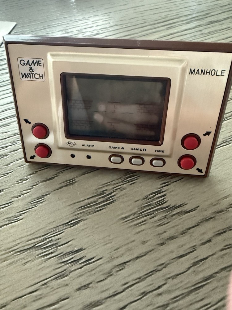 The product is a Nintendo Game & Watch handheld electronic game titled "Manhole," manufactured in Japan in 1980. This game is part of Nintendo's character making it a collectible item for fans / enthusiasts looking for a piece of gaming history.