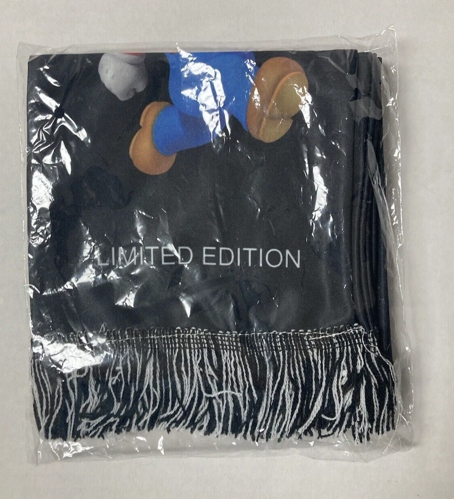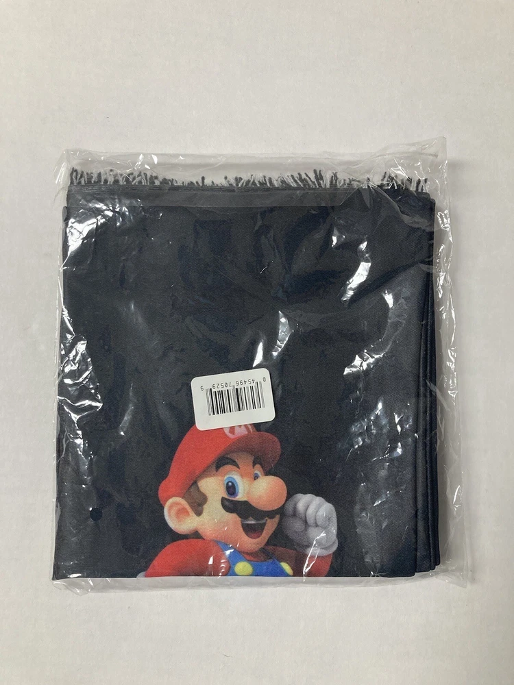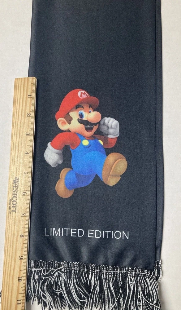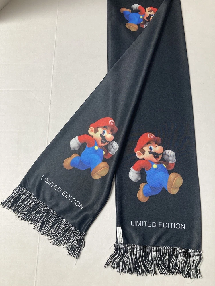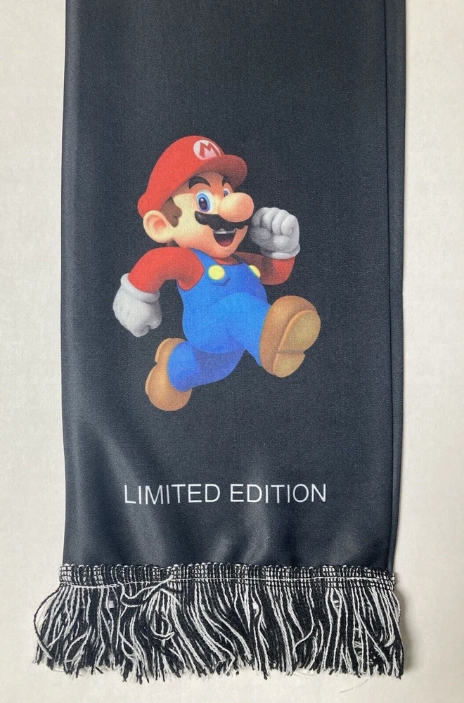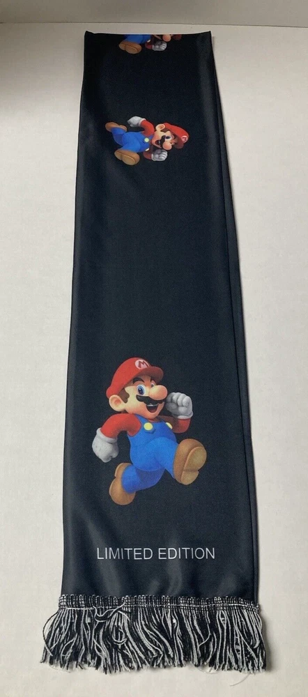 Nintendo Super Mario Bros. Mario scarf. Nintendo promotional item. Limited Edition, black polyester scarf with Mario graphics on both sides. Fringe on each end. Measures approx. 58 inches long and 6.5 inches wide. UPC = 045496705599. Free shipping to addresses in the United States. PAYMENT: Payment expected within 2 days. SHIPPING: Free Shipping to addresses in the United States. All International shipping is managed by eBay through the eBay International Shipping Program. CUSTOMER SERVICE: eBay message with questions. Positive feedback left when transaction is complete. Contact me with any issues so we can resolve them. THANKS FOR LOOKING! Check out my eBay Store and other listings, who knows what you may find.