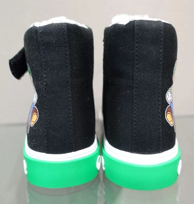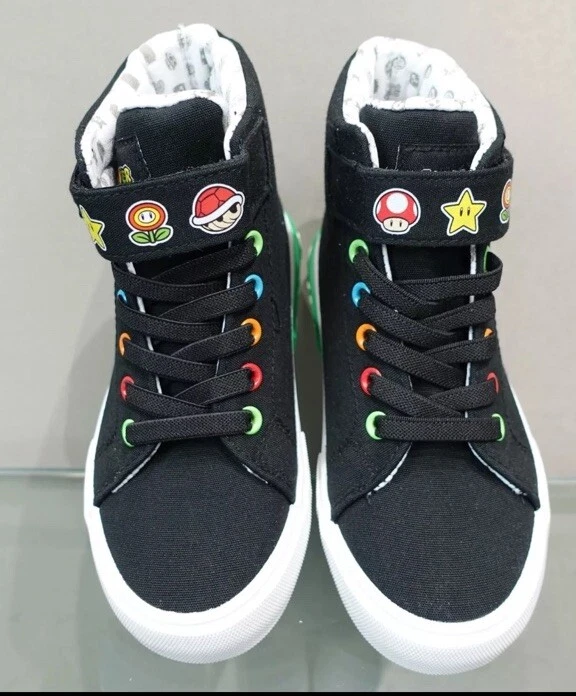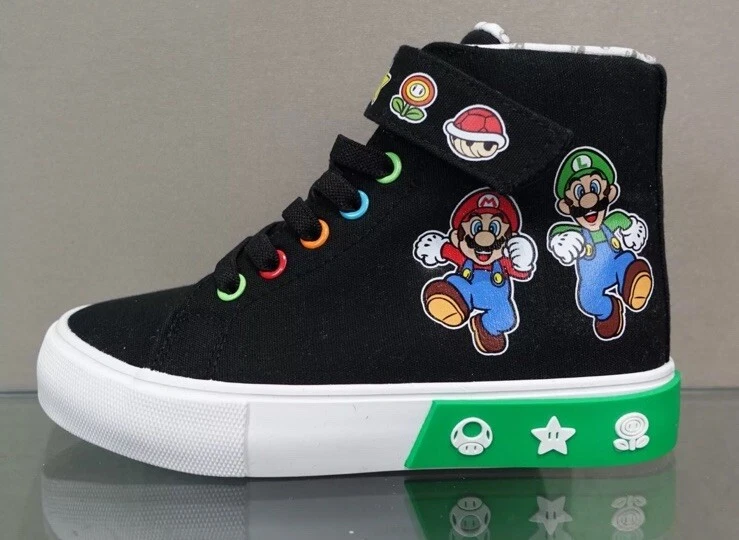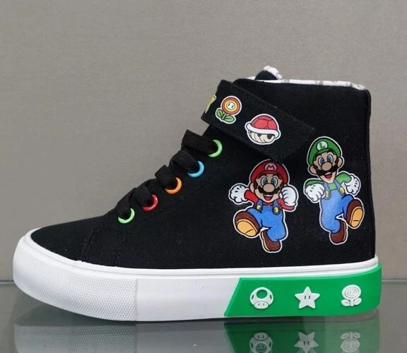 Step up your little one's shoe game with these stylish and comfortable Nintendo Super Mario sneakers. Featuring a high top shoe shaft style, lace-up closure, and round toe shape, these shoes are perfect for casual occasions and walking. The black canvas upper material is accented with a Luigi logo, making it a fun addition to any outfit. The moderately cushioned level and synthetic outsole material ensure durability and comfort for all-day wear. These shoes are available in size 13 and are suitable for boys. They are part of the Nintendo product line and are perfect for fans of the cartoon, TV, and movie characters. Get these trendy sneakers for your little one today!