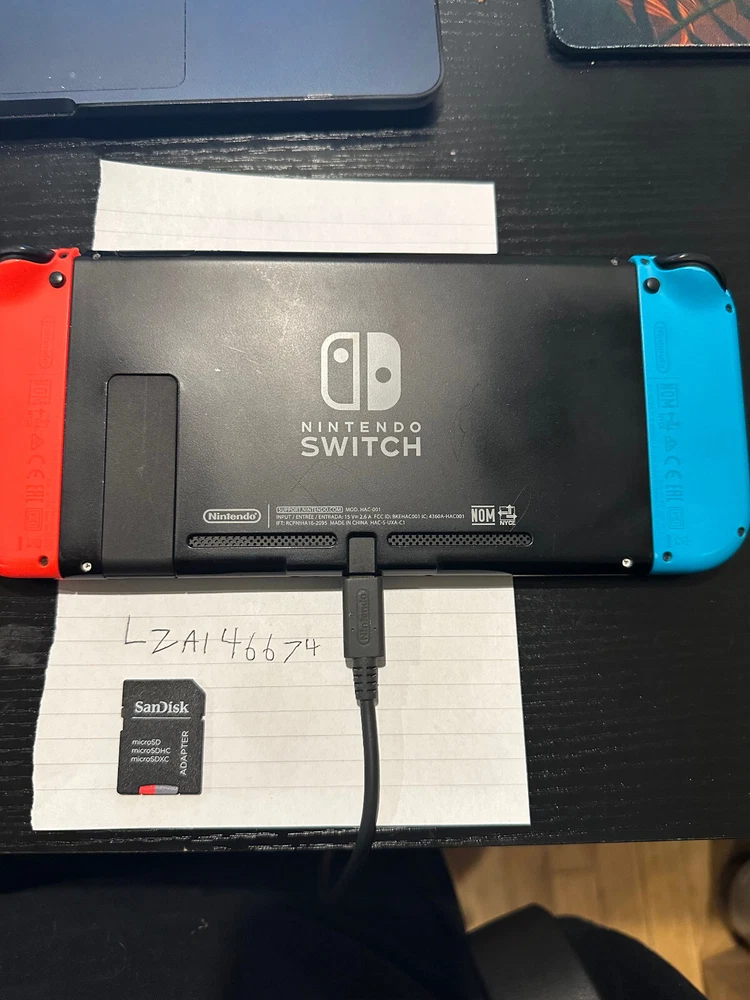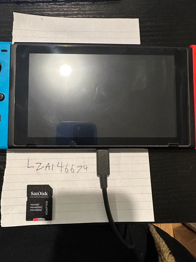 Nintendo Switch console with working red and blue joycons, factory reset. Comes with 64 gb mini sd, carrying case, and charging cable. Moddable switch via rcm jig