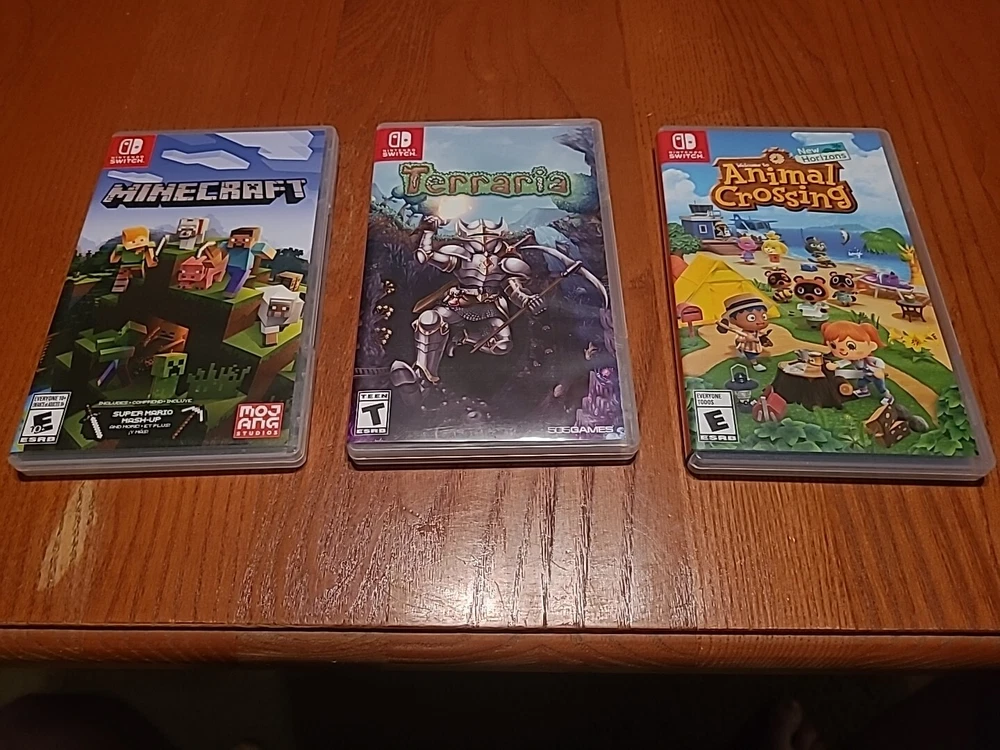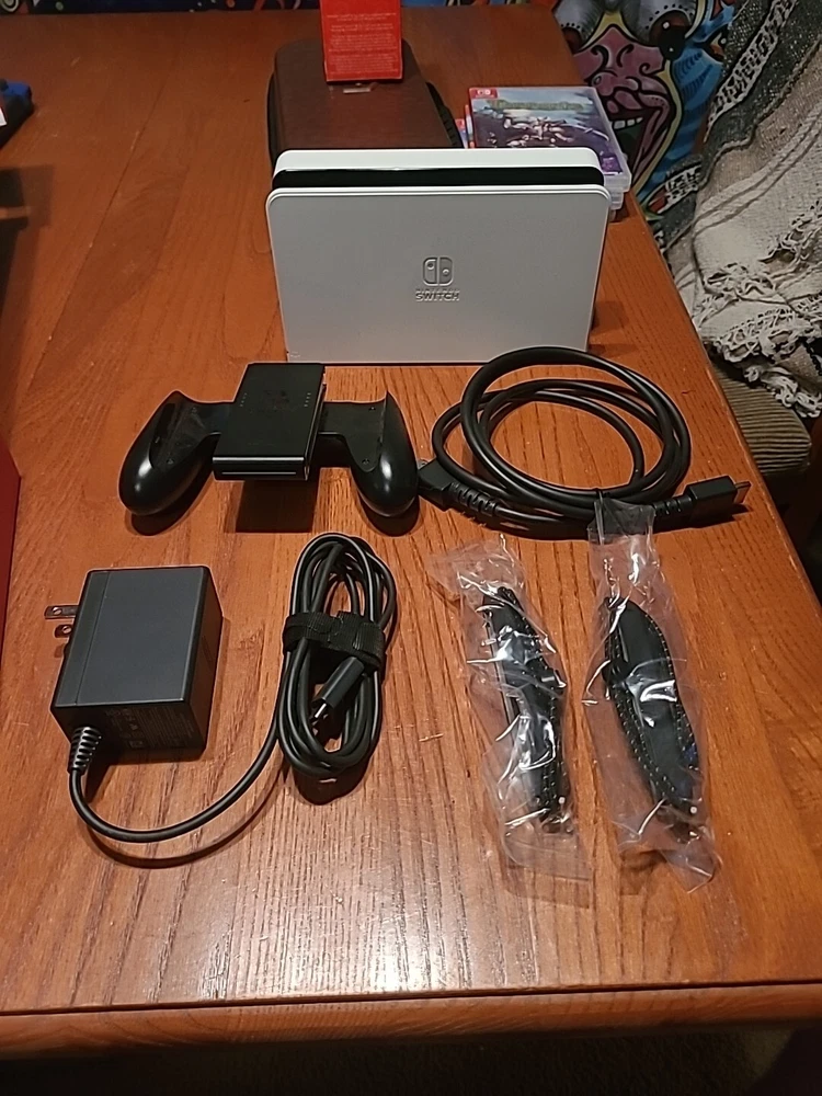 Nintendo Switch Oled Bundle The Console: Includes an OLED model switch, the dock, the power adapter, an HDMI cord, a joycon grip, joycon straps, and a set of joycons. Everything is in good condition. There is some residue on the back of the switch from a sticker I used to have on there. The screen has no scratches that I'm able to see. Includes the original box, but not the interior packaging. There is a 128 GB micro SD already installed. ***THIS DOES NOT INCLUDE THE ORIGINAL WHITE JOYCONS, ONLY THE BLUE/YELLOW ONES SHOWN*** Accessories: The console has a glass screen protector already installed. An Atrix carrying case is included. It also includes a charging station that can hold 4 joycons or 2 pro controllers. Games: Includes Minecraft, Terraria, and Animal Crossing New Horizons. This was my personal console; I did my best to keep it clean and in good condition. It has already been factory reset and may need to be updated on startup. Everything will be packaged with the utmost care. Feel free to reach out with any questions or concerns! Open to offers!