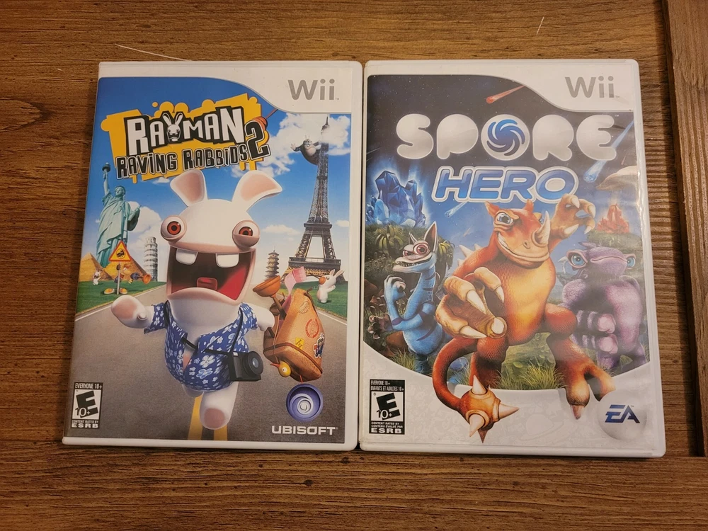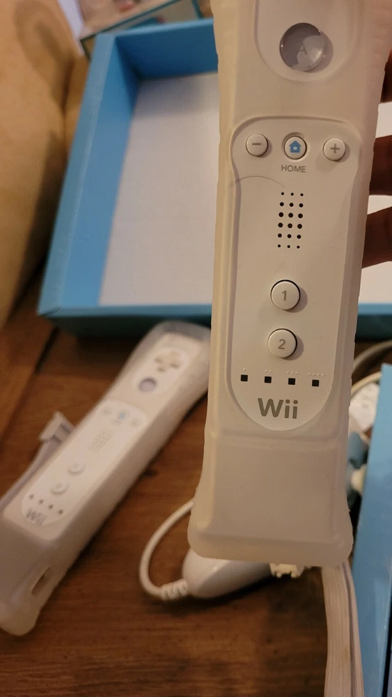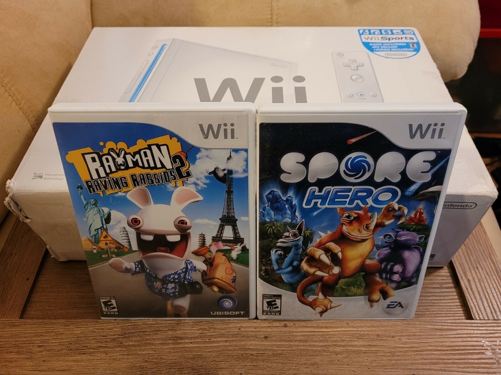 Nintendo Wii Console W/ 2 Games, Accessories, Box And Controllers Tested Working. Wii Sports console and 2 video games. In original box, box has some wear. Includes: Wii Console, console stand, 2 Wii remotes/ controllers with jackets, Nanchuck, Sensor bar, AC adapter and AC cable. Does not include sports disc. Includes Rayman Raving Ribbons 2 and Spore Hero Wii games, both complete with manuals. Pre-owned, tested and working.