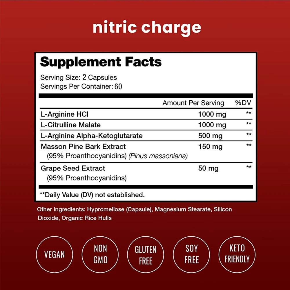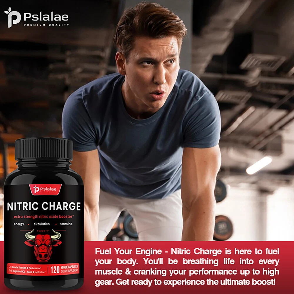 Effects: Testosterone Booster, Energy & Endurance Ingredients: L-Arginine, L-Citrulline Directions: Take 2 capsules once daily after a meal. Shipping: Ships within 48 hours on working days. Shelf life: 2 years Description: Power Through Plateaus - Whether you’re a weightlifter, athlete, or just looking to reach your personal goals, Nitric Charge will dramatically enhance overall performance by promoting oxygen delivery to your muscles. Maximum Strength - unleash a true powerhouse pre-workout formula packed with essential nitric oxide boosters; L-Arginine and L-Citrulline. Fuel Your Engine - Nitric Charge is here to fuel your body. You'll be breathing life into every muscle & cranking your performance up to high gear. Powerful Extra Strength L-Arginine Complex - The essential amino acids in our scientific super blend support physical endurance and improve blood flow for better nutrient delivery. Try Nitric Charge and experience turbocharged pumps and energy! Document