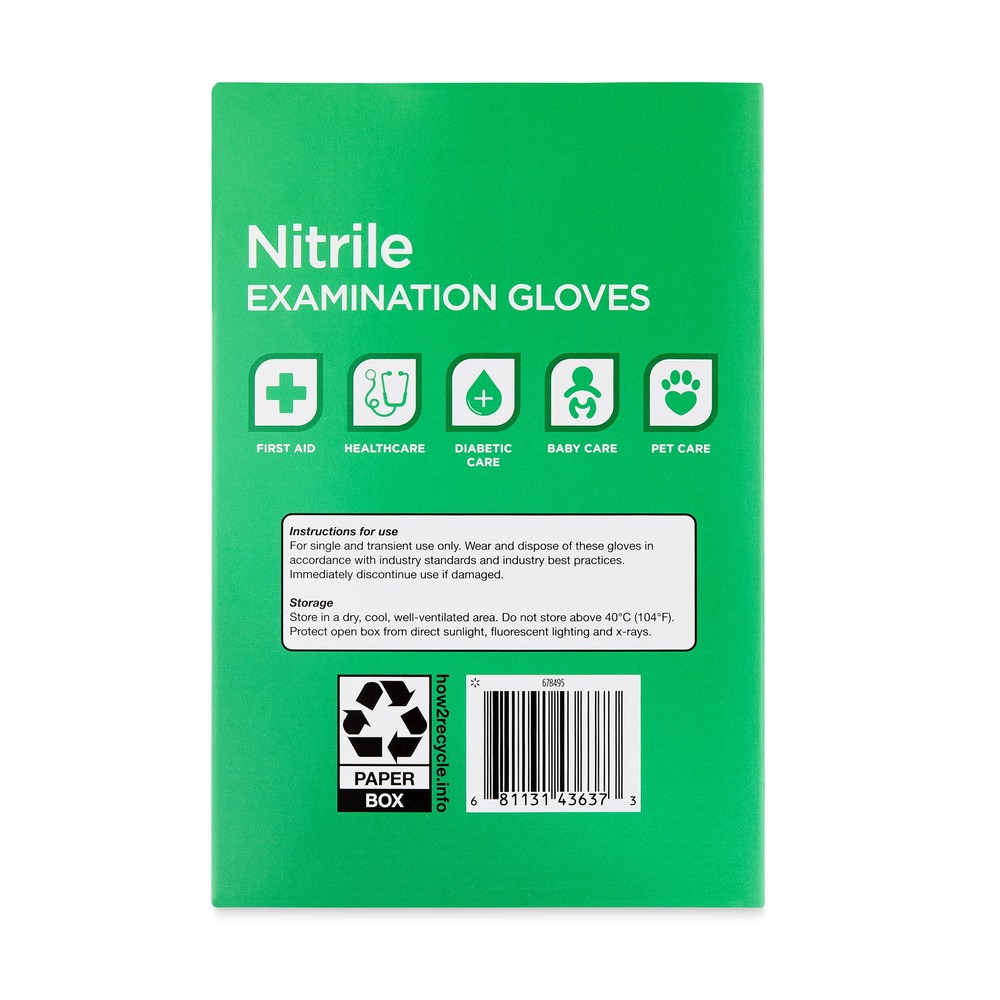 Protect your hands from dirt and grime with this box of 100 Nitrile Examination Gloves, One Size Fits Most. These medical quality gloves are not made with natural rubber latex, are non-sterile, powder-free, and meet industry quality standards. The natural fit of these gloves makes them comfortable to wear, they fit large and extra large hands, and one glove fits either left or right hands. Use these gloves to protect your hands when performing basic first aid, diabetic care, baby care, pet care, or while cleaning with harsh chemicals. Now you can easily safeguard your hands when it counts with Nitrile Examination Gloves, One Size Fits Most. Nitrile Exam Gloves, One Size Fits Most, 100 Count Provides durable protection for caregivers Protective barrier to protect from the spread of germs and infection Single use only, fits either hand Non-latex, powder-free, textured fingers for excellent grip Great protective barrier 100 count box One size fits most