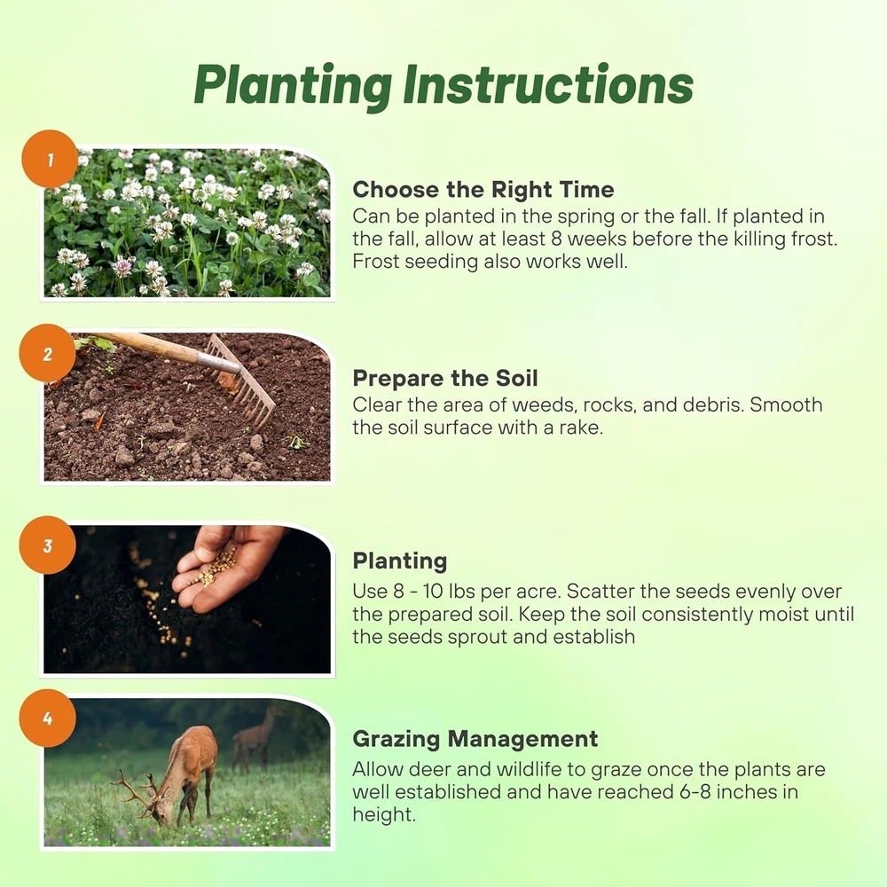 Nitrocoated 10 lbs Clover King Seed Mix - Attracts Deer & Wildlife Year-Round ‹ › ‹ › ‹ › ‹ › ‹ › ‹ › ‹ › ‹ › ‹ › Nitrocoated 10 lbs Clover King Seed Mix Attracts Deer & Wildlife Year-Round Key Features: Specially formulated to attract whitetail deer and other wildlife Low maintenance — requires minimal upkeep once established Nitrocoated and inoculated for enhanced germination and robust growth 50% Marco Polo White Clover, 40% Ladino White Clover, and 10% Alfalfa Thrives for up to 5 years without re-seeding High-protein forage essential for antler growth and overall deer health Heat, cold, and drought resistant for seamless planting and growth Versatile, suitable for USDA Zones 3-10 Aids in soil stabilization and erosion control Benefits: Support healthy herd development with minimal effort Enhance deer population nutrition with nutrient-rich forage Adaptable for various climates, ensuring thriving plots year-round Create thriving food plots in any season, promoting continual forage availability Effective erosion control, enhancing land health Why Choose Nitrocoated Clover King Seed Mix? Elevate your wildlife management game with our Nitrocoated 10 lbs Clover King Seed Mix, meticulously designed to attract and sustain deer and other wildlife effortlessly. This incredible blend not only enhances germination rates but also guarantees robust growth, ensuring that your food plot remains a reliable source of nourishment for years to come. With its unique combination of clover and alfalfa, this seed mix provides high-protein forage vital for antler development and overall deer health, allowing you to foster a thriving deer population right in your backyard. Don't wait to enhance your land; invest in the Clover King Seed Mix today and witness the wildlife flourish before your eyes! Shipping Free & Fast Shipping - We offer free shipping to most of the USA with a normal delivery time of 3-7 days. However, due to the current situation, additional delivery time (up to 3 weeks) may be required for some items. Alternative Carriers - We may use alternative carriers (e.g. USPS, FedEx, UPS, etc.) to ensure your package arrives safely and on time. Due to the use of multiple carriers, we are unable to provide a tracking number automatically. Handling Time - Orders are processed and shipped within 1-2 business days of receiving cleared payment. Shipping Restrictions - Shipping to Alaska, Hawaii, Puerto Rico, Guam, and other US territories may incur shipping charges or delivery restrictions. Please contact us before ordering, or your order can be refunded/cancelled. State Restrictions - There may be restrictions based on your state of purchase. For example, certain items may not be shipped to California due to state regulations. Contact for Tracking Updates - If you require tracking updates or have any concerns about the delivery of your order, please feel free to contact us, and we will be happy to assist you. Return 30-Day Hassle-Free Returns - We want you to be completely satisfied with your purchase. If you are not, you can return the item within 30 days of receiving it for a full refund or exchange. Easy Return Process - To start a return, simply contact us and we will provide you with a prepaid return shipping label and detailed instructions. Restocking Fee - There are no restocking fees for returns. However, the buyer is responsible for return shipping costs if the return is not due to a seller's error. Refund Processing Time - Refunds will be processed within 5 business days of receiving the returned item in its original condition. Payment We accept all major credit cards, PayPal, and Apple Pay for your convenience. Your payment information is secure and encrypted to ensure a safe and seamless transaction. Please complete your payment within 3 days of purchase to avoid any delays in shipping. Feedback Your feedback is extremely important to us. We strive to provide the best products and customer service possible. If you are satisfied with your purchase, please take a moment to leave us a positive review. If you have any concerns or issues with your order, please contact us before leaving negative feedback. We are committed to resolving any problems and ensuring your satisfaction. Contact Us If you have any questions or concerns, please feel free to reach out to our customer support team. You can contact us through the eBay messaging system. We are available Monday to Friday, 9:00 am to 5:00 pm EST, and we will do our best to respond to your inquiry within 24 hours. Buy it now and enjoy a pleasant shopping experience! UPC: Not Set Unit Quantity: 10 lb Features: Draught Resistant,Nitrocoated,Inoculated,Heat Tolerant,Cold Tolerant,Alfalfa-Enhanced,Low Maintenance,Erosion Control,Year-Round Use Season of Interest: Spring,Summer,Winter Sunlight: Full Sun,Partial Shade Climate: Humid Continental,USDA Zones 3-10 Color: White Soil Type: Loam Brand: Unbranded Type: Food Plot Seeds Common Name: Clover Genus: Trifolium Life Cycle: Perennial Watering: Light Indoor/Outdoor: Outdoor Cultivating Difficulty: Easy MPN: Not Set Country/Region of Manufacture: Not Set Growth Habit: Clumping Soil pH: Neutral Planting Time: 1 Week Unit Type: lb
