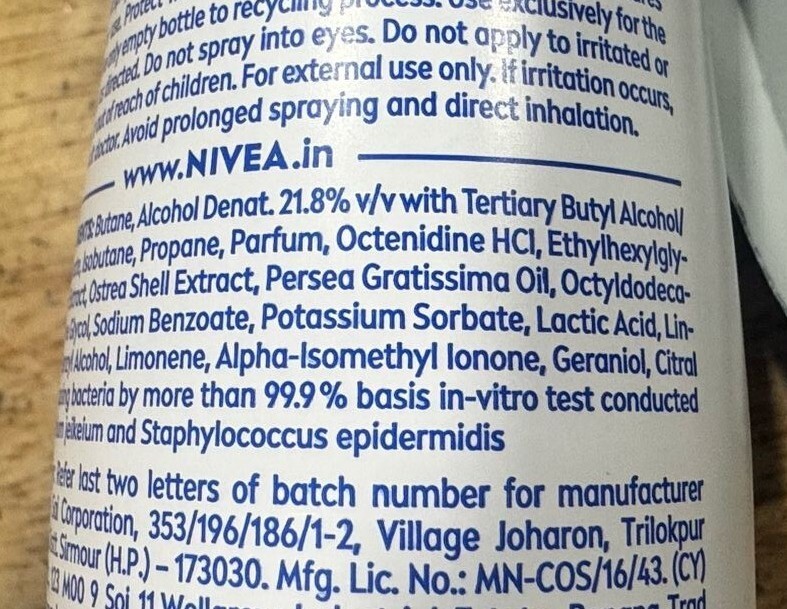 We ship same or next business day from the US You will receive a 5.07 Fl Oz (150ml) Nivea Deodorant Fresh Natural Deodorant Spray Can Product Features Deo protect ion Ocean Extract All skin types Normal skin Product Highlights No cap no breakage Easy to hold Click-Lock system Softer spray on skin Long lasting freshness Day-long odor protection Gentle NIVEA care How to slide 1 to 3 of 3 1 Shower Best, use the deodorant after taking a shower 2 Spray Hold can 15cm from the underarm and spray 3 Dry Allow product to dry completely. Product Details Care for your underarms with NIVEA Fresh Natural Deodorant. It contains ocean extracts which give you day long odour protect ion and long-lasting fresh ness. It combines NIVEA ’s gentle care and reliable protect ion. The NIVEA Fresh Natural Deodorant is dermatologically tested which makes it reliable for taking care of your underarm skin . Odour control: It contains anti-microbial agents that help keep bacteria away thus giving long-lasting odour control. Long-lasting Fresh ness: It contains Ocean Extracts that give a mild, soothing fragrance and keeps you fresh all day long. Care for your underarms: It contains caring ingredients that help in taking care of the delicate underarm skin . Special Ingredients slide 1 of 1 Ocean Extract