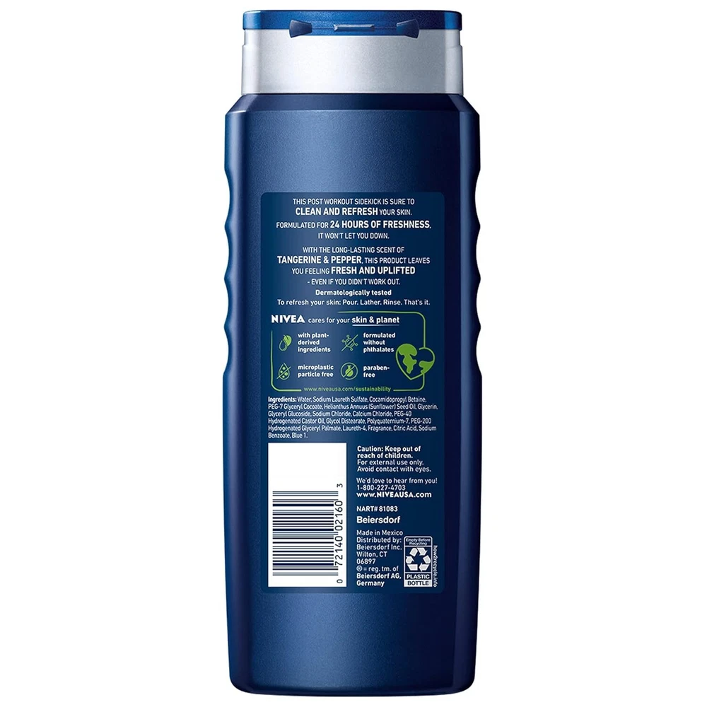 Nivea MEN Sport Body Wash with Revitalizing Minerals, Tangerine and Pepper Scent,16.9 Fl Oz 3-IN-1 FORMULA: The 3-in-1 formula can be used as a body wash, face wash and shampoo GENTLY CLEANSES: Men's body wash cleanses without drying and leaves skin feeling refreshed and comfortable LONG-LASTING SCENT: Formulated with Revitalizing Minerals, this NIVEA MEN body wash has a refreshing tangerine and pepper scent provides long-lasting, 24-hour freshness FORMULATED WITHOUT: Microplastic particles, parabens, phthalates and animal-derived ingredients INCLUDES: One (1) 16.9 fluid ounce bottle of NIVEA MEN Sport Body Wash, Citrus Body Wash for Men with Revitalizing Minerals 1.73 inches x 3.31 inches x 8.54 inches. Weight: 544.0 grams Item model number 056594011045 Item dimensions L x W x H 3.31 x 1.73 x 8.54 inches Is Discontinued By Manufacturer No Product Dimensions 3.31 x 1.73 x 8.54 inches; 1.2 Pounds Country of Origin Mexico Item Weight 544 Grams Age Range (Description) Adult Scent Fresh