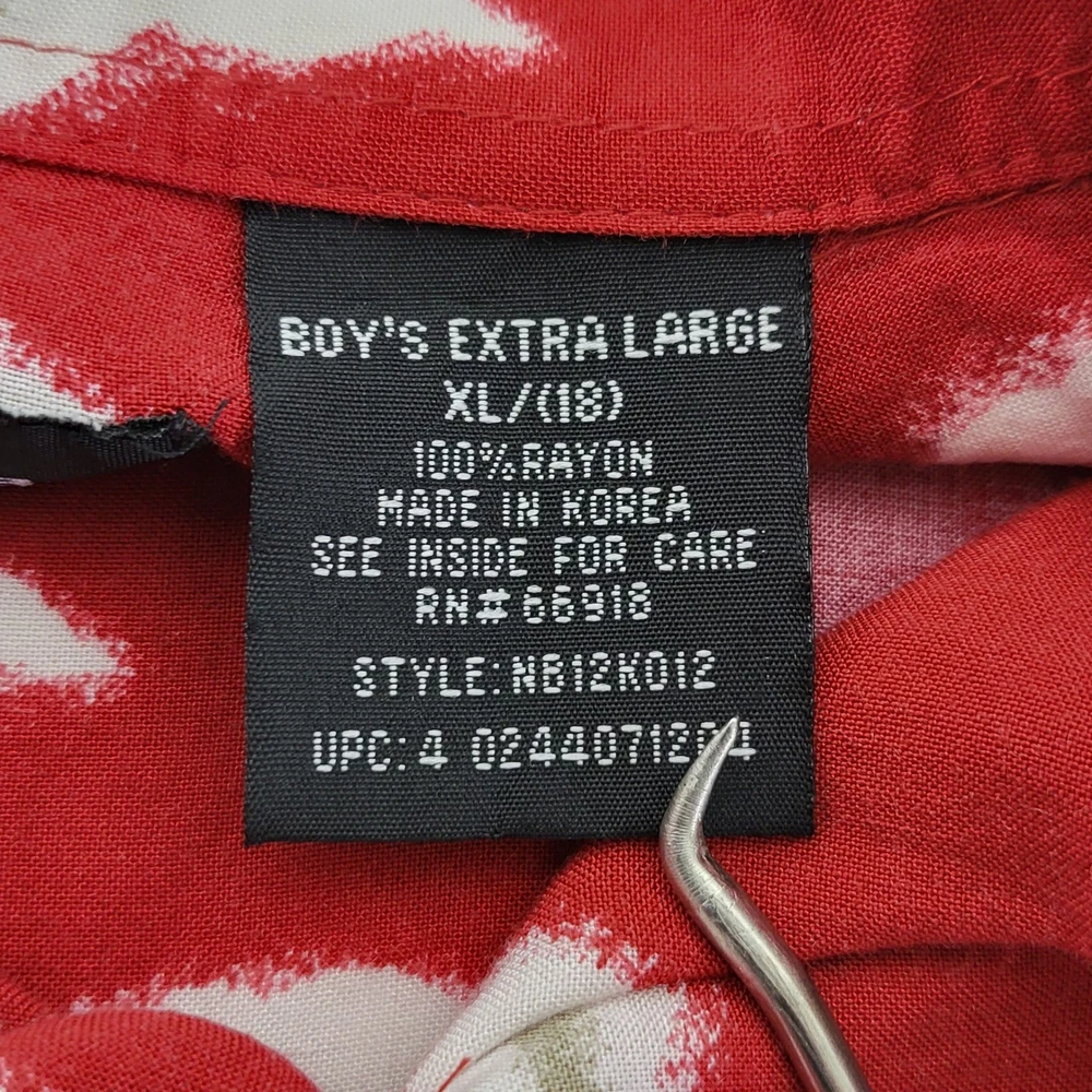 Classic short sleeve button-down shirt features a vibrant tropical beach scene with surfboards, palm trees, and vintage woodie wagons. Crafted from lightweight rayon, this camp collar top offers a relaxed fit perfect for summer vacations or casual wear. The bold red upper is accented by a whimsical cloud print that transitions into a detailed landscape graphic along the hem. Brand: No Boundaries Material: 100% Rayon Style: Hawaiian Camp Shirt Pattern: Tropical Surf Scene Color: Red, Yellow, Green Neckline: Collared Sleeve Length: Short Sleeve Closure: Button Front Hem: Straight Origin: Made in Korea Keywords: Aloha, Surf, Beach, Tropical, Vacation, Retro, Woodie, Palm Tree, Summer, Rayon, Kitsch, Coastal, Kidcore, Boys Fashion • We ship within one business day. • Please compare the measurements to something you already own. Thank you for supporting our small business!