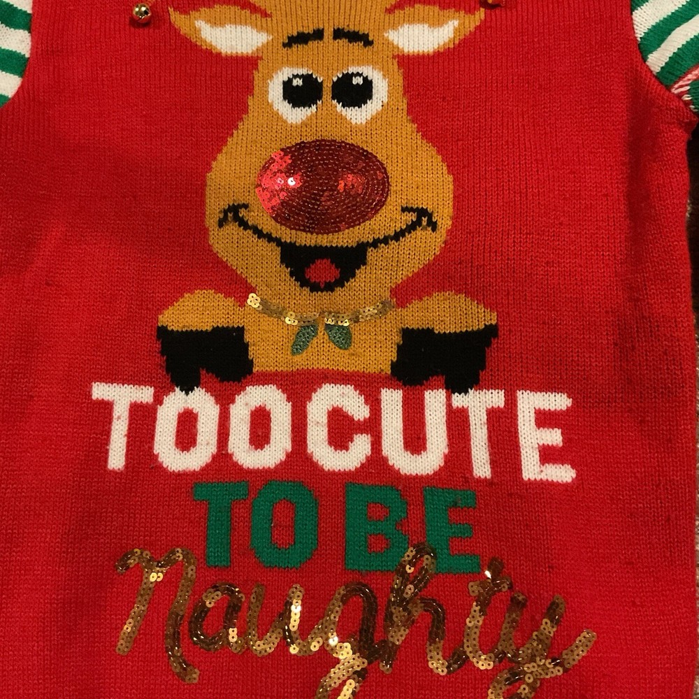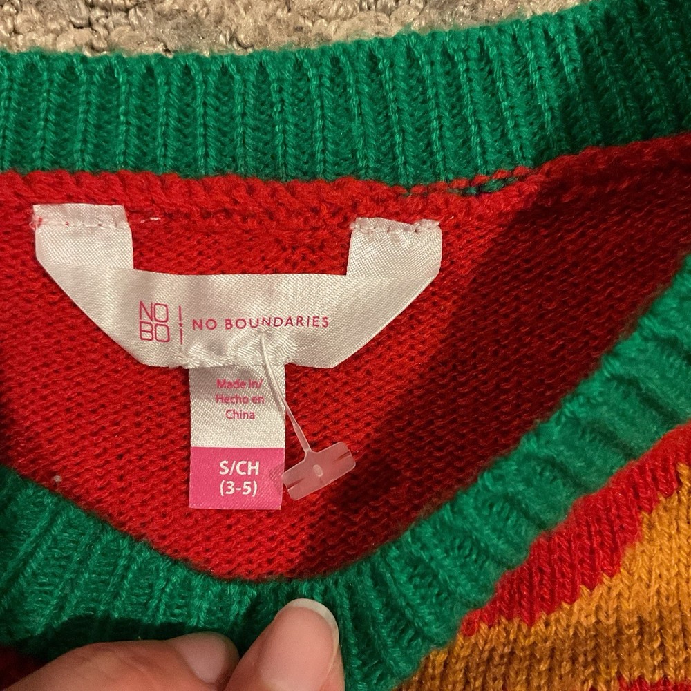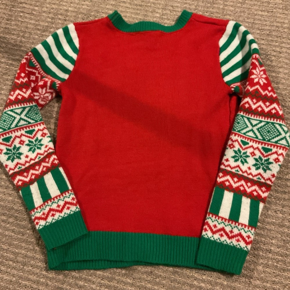 The No Boundaries Ugly Christmas Holiday sweater is a festive and cozy pullover designed for junior girls in size small 3/5. The sweater features a classic red color with a sequin accents, perfect for the winter season and Christmas theme. Made from a knit fabric, this long-sleeve sweater is machine washable and is ideal for casual occasions. This sweater from the No Boundaries brand is sure to bring holiday cheer to any young girl's wardrobe. Smoke free and pet free home