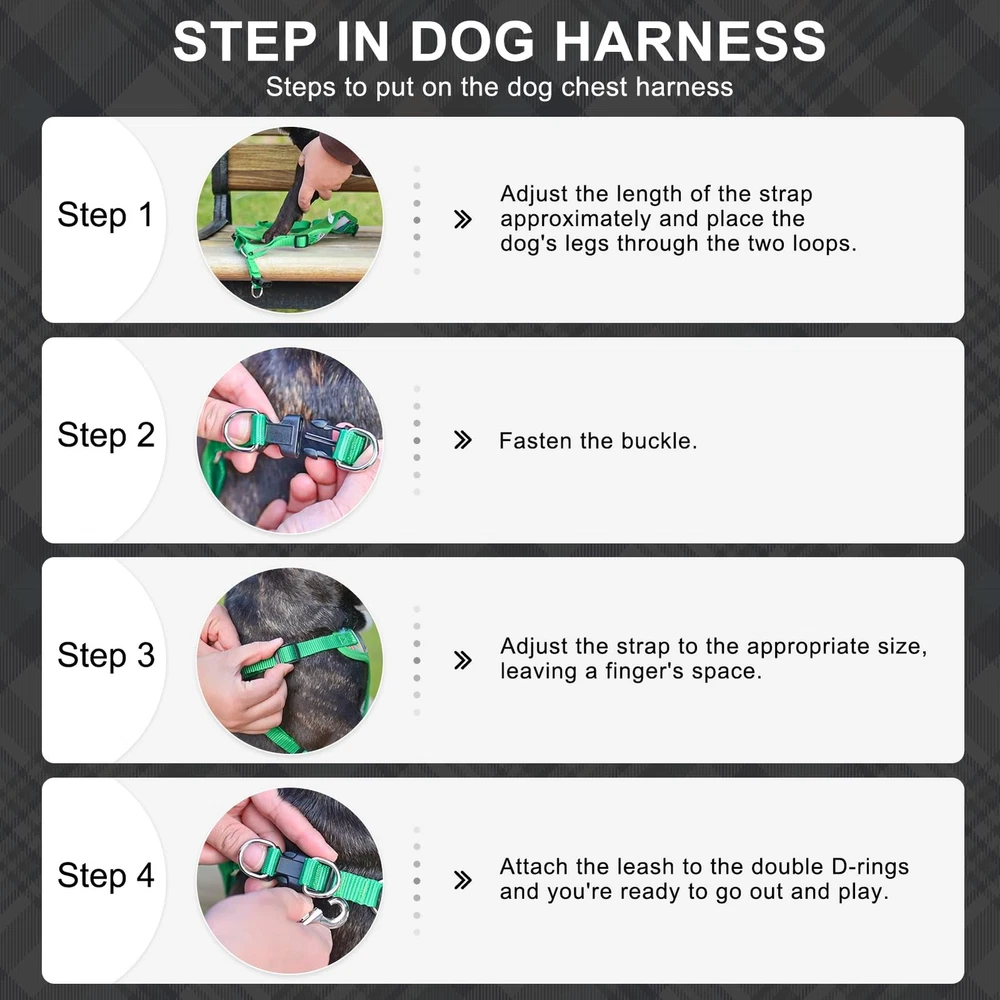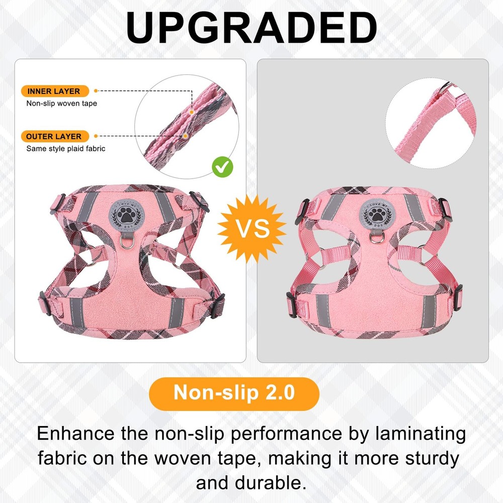 This harness set is a game桾! Easy to put on, no fuss with straps—just step in and go. The plaid design looks stylish, and the reflective material keeps walks safe. Super comfy for my dog, no pulling or choking, and the adjustable fit is perfect. The leash and collar complete the set, making it a great value. My pup loves it, and so do I!