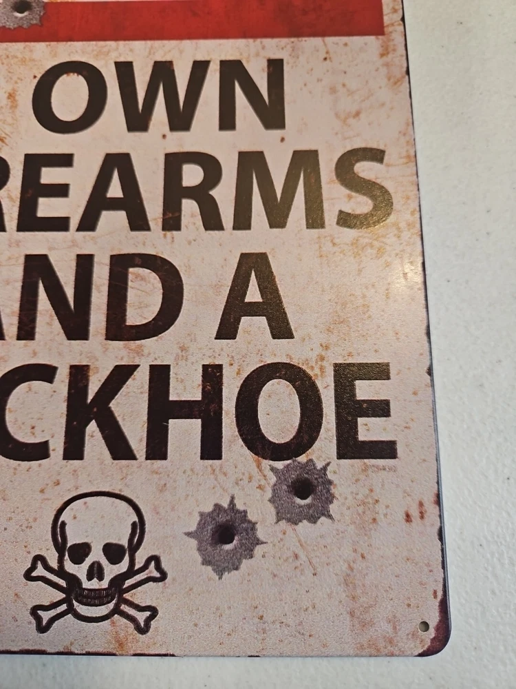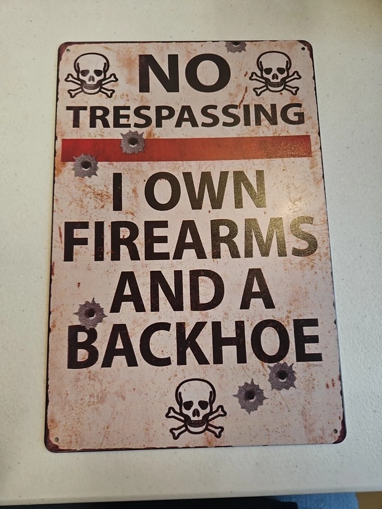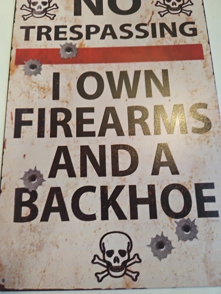This rustic-looking 8x12 metal sign is perfect for anyone who wants to add a touch of humor and novelty to their space. The sign features a warning against trespassing, with a playful and eye-catching design that includes a firearm and a backhoe. Crafted from high-quality metal, this sign is durable and weather-resistant, making it suitable for both indoor and outdoor use. It can be hung on a wall or door, or mounted on a flat surface using the provided mounting hardware. The sign is also decorated with a rusted look that adds to its primitive style.