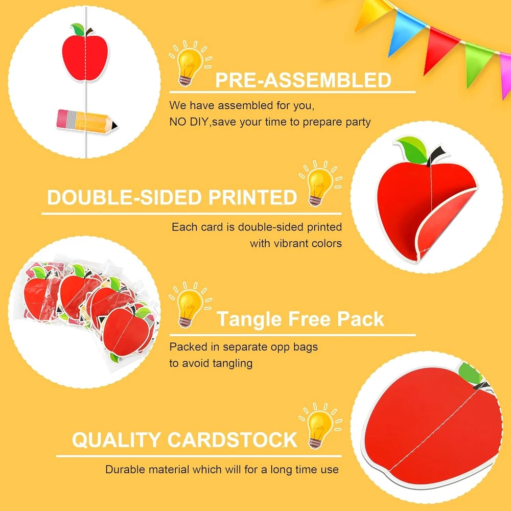 Free eBay listing template designed by dewiso.com Back to School Party Decorations - NO DIY - Welcome Back to School Hanging Decorations for Classroom Ceiling Backdrop,First Day of School Decorations for Kindergarten Elementary School Teacher Office FREE AND FAST SHIPPING! About this item 【PACKAGE INCLUDED】You will receive 4pack back to school hanging garland. The total length of a pack garland is 2m/6.56ft, and you can cut the length according to your needs. Its perfect addition to decor classroom ceiling on the first day of school. 【PRE-STRUNG & TANGLE FREE PACKAGE】We have assembled for you in advance and separating each garlands with opp bags to avoid tangling, save your time to prepare party, just hanging anywhere you like to greet friends and together enjoy happy time. 【PERFECT ADDITION TO YOUR PARTY】With our pencil Apple banner garland welcome students back to school!Which will create joyful atmosphere for first day of school,catch the students eyes! 【RELIABLE MATERIAL】The first day of school decorations are made of quality card stock, not easy to break or fade. All decorations are durable enough to be applied many times on different occasions. 【WIDELY APPLICATION】Welcome back classroom decorations can be your prior option to celebrate classroom bash. Perfect for classroom, office,children's show on the first day of school. Or as backdrop to take beautiful photos to leave great memories. Product We offer a 30-Day Return Policy on items which you are not completely satisfied with. You have the option for a full-refund or an exchange of the item. No returns are available on items shipped outside of the US . Shipping We offer Free Shipping to the US and ship within 2 business days of payment, usually sooner. We use UPS express shipping. That's why your products are usually delivered within 3 days . Contact We try our very best to make sure every customer is completely satisfied. If there's a problem , message us! We're happy to help. 24/7 live chat available.