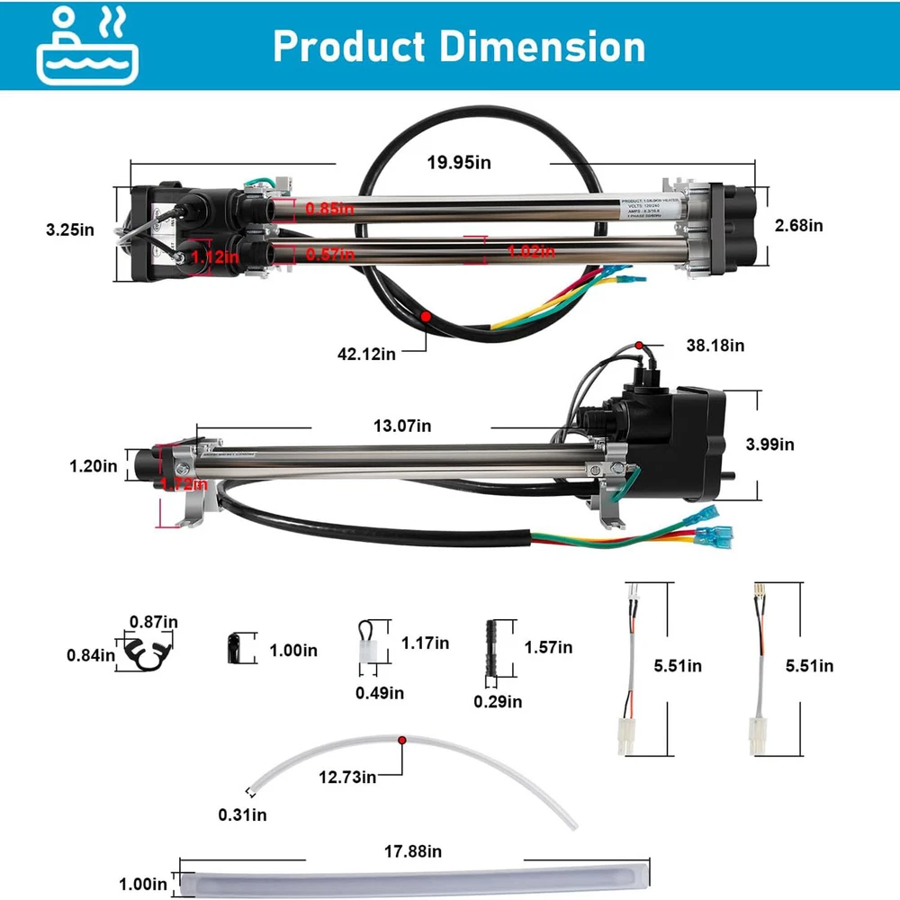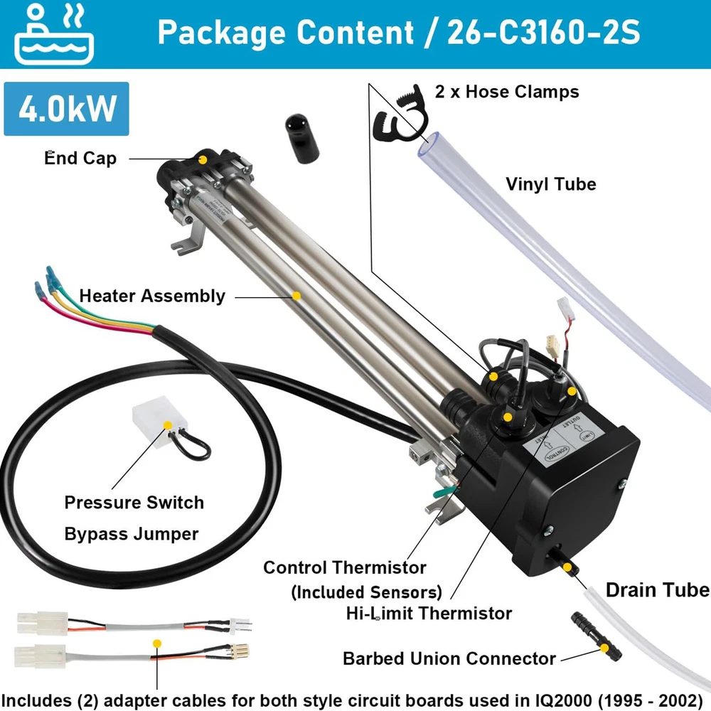 No-Fault Spa Heater for 1995+ Hot Spring Watkins Tiger River 4kW Titanium 73791 Fitment: Suitable for many 1995 to current Watkins No-Fault, Hot Springs, Tiger River, Hot Spot, Caldera and Laing tri-bend hot tubs spa models Features: 1) Replace for Watkins Heater Cross Reference MATRIX 26-C3160-2S, C3160-2S, 73039, 73791, 76228, C3564-2, 25-250-1022. Also suitable for old trumpet-style Laing Infinity 6758, IHH-4000-NHCW and IHH-4000-NHCW-6758 Triple Bend heater (confirm the number on the heater data label correctly matched) 2) 2 Sensors / Wattage: 4.0KW 240V, 1.0KW 120V / Element Material: Titanium / Amperage: 17A 240V, 8.5A 120V / Required Flow Rate: 8 GPM / Voltage: 120V or 240V / 1/4 inch tubing connection / 1/4 inch tubing extension kit / 3-wire cord 3) No Modifications Required. Includes a Bleed Tube Extension Kit with coupling & clamps for ease of installation on some spa models 4) Direct replacement for Hot Spring 4 KW PDR Heater Assemblies. Low Flow design improves efficiency. Temperature & Hi-Limit Sensors included - PDR Auto reset. Double-pass sleek design replaces discontinued trumpet style heater assembly. The double-pass feature efficiently heats the water in two stages. 4.0kW Titanium extended service life heater element Package included: 2 sensors with new style 4-pin sensor plugs (2002+) and an auto-reset high limit, 18" of 1" O.D. Tubing, 12" of 3/8" O.D. Tubing, Instructions, Barb Coupling .25" x.25", Clamps, 3 wire power cord Payment Shipping Policy Contact US About us Returns Policy Payment Please purchase and pay for the item through the eBay,only accpected the paypal payment. Shipping Policy The item will be shipped within 24 hours on payment received except the holidays.(except weekends & official holidays). You can log on to eBay to check your logistics tracking number. We use multiple warehouses for delivery and will select the nearest warehouse for delivery, according to your order address and our inventory. Shipped via USPS, UPS or FedEx (depending on location and package weight) Please confirm address before purchase, and cannot change address once purchased. Contact US 1. Negative & neutral feedback will not help resolve any problems you have, please contact us via eBay messages before leaving negative & neutral feedback, our customer service will make best effort to help you with the issues. 2. We hope to give you a positive eBay experience by working hard, and we expect to receive a positive feedback and Detailed Selling Rating (DSR) of 5 Rating in ALL of the feedback categories (Item as described, Communication, Shipping Time and Shipping and handling charges) from the buyer upon receiving the item . 3. If you are not satisfied with our items or service, please don't hesitate to contact us before you leave any Neutral/Negative feedbacks, we will always try our best for 100% customer satisfaction. About us Our goal is complete customer satisfaction. We will be very honored to provide you with quality service. Our products are a 100% authentic and brand new. We work with the biggest suppliers of high quality products to bring you only the best items. No customer will walk away from our store unhappy. If there’s a problem, just let us know and we fix it. Contact information: Our office hours are MONDAY - Saturday 9:00PM - 6:00PM PST, but we will response you within 24 hours we get your message.There will be some delay on respons if you send message or E-Mail on Sundy. Returns Policy Please contact us first when return, exchange and refund is required. Any direct return of purchased items will not be processed. If the product is defective or damage upon arrival,please contact us immediately,we will provide the solve the problem. Returns accepted within 30 days of delivery date and item must be in original new condition. When returning an item, it must be in all of the original packaging and include all of the original accessories or items that came with it. The item and package should be in original and perfect condition.