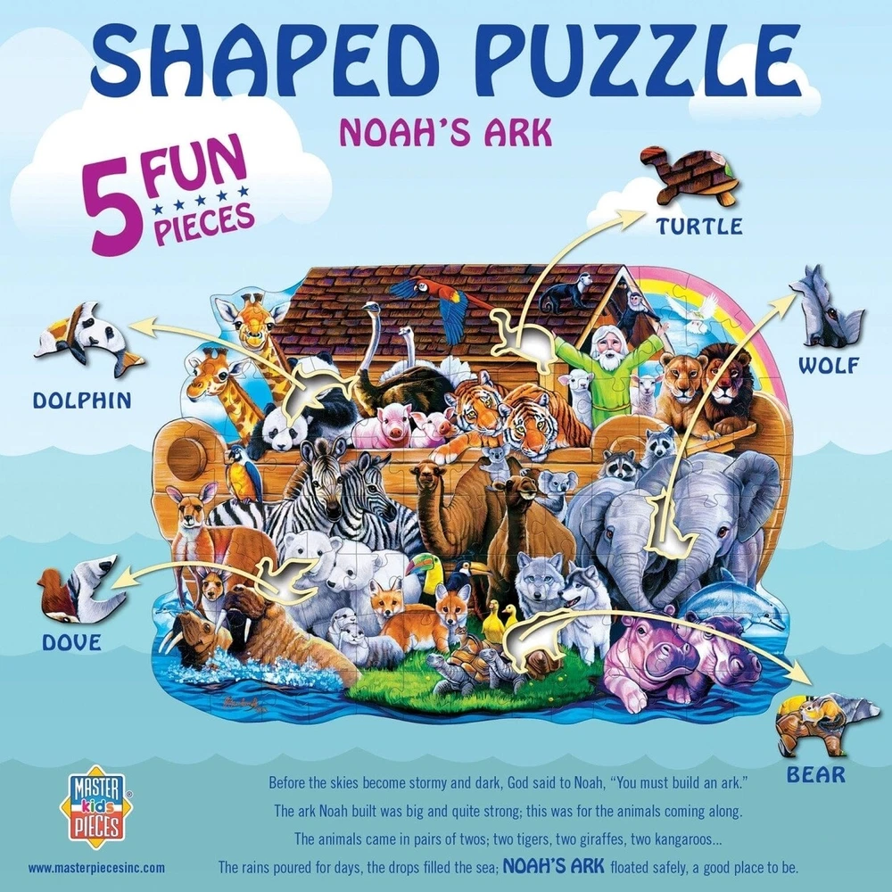 This Noahs Ark Shaped puzzle features Noah and all the animals aboard the ark, as the rainbow appears and the dove flies off in search of land. This puzzle is 100 pieces and 19.5 inches x 14 inches in size. Look for The Right Fit puzzles collection and make sure your little one gets the correct piece count and size for a good challenge for their age. This puzzle is the right fit for ages 6+. Noahs Ark Shaped Jigsaw Puzzle 100 Pieces 19.5X14 Inches Ages 6+ Right Fit This Noahs Ark Shaped puzzle features Noah and all the animals aboard the ark, as the rainbow appears and the dove flies off in search of land. This puzzle is 100 pieces and 19.5 inches x 14 inches in size. Look for The Right Fit puzzles collection and make sure your little one gets the correct piece count and size for a good challenge for their age. This puzzle is the right fit for ages 6+. Product Attributes: Weight (lbs.) : 1.00 lb UPC: 705988119255 Brand: MasterPieces