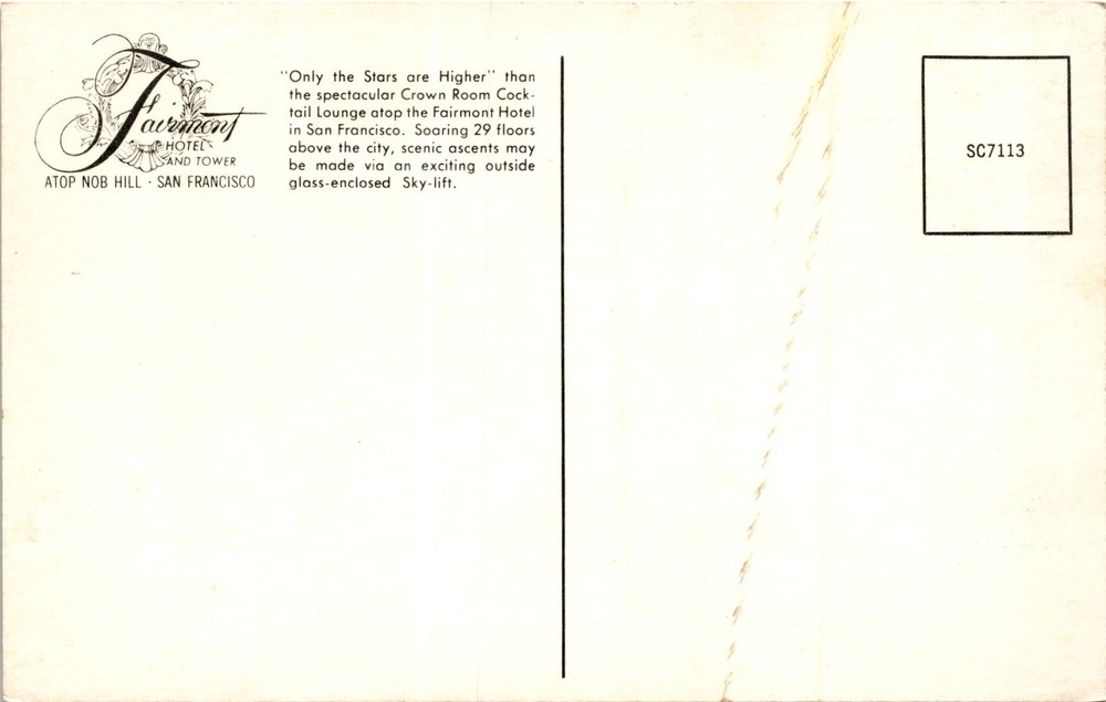 MAKE AN OFFER. THE MORE YOU BUY THE BETTER DEAL I WILL ACCEPT The postcard features a depiction of The Hotel and Tower atop Nob Hill San Francisco, specifically highlighting the Crown Room Cocktail Lounge at the Fairmont Hotel. The lounge is described as being located at a height where Only the Stars are Higher, emphasizing its spectacular views.