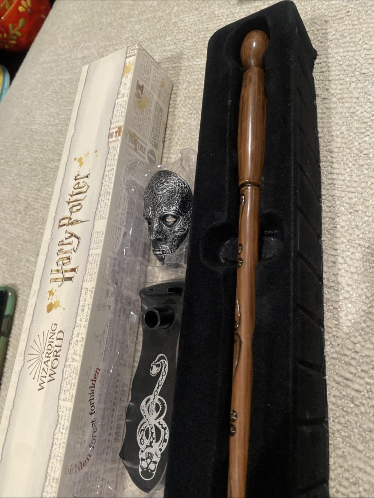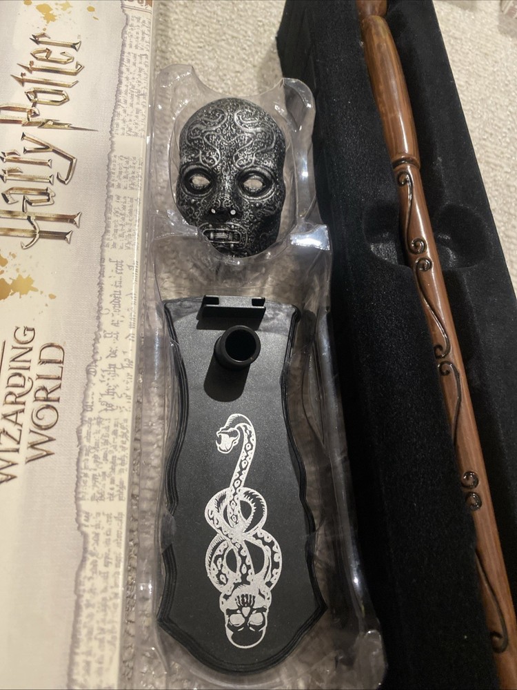 New open box The plastic casing broke that holds the wand. The product is a collectible Harry Potter wand made by Noble Collection. It is designed to depict various characters from the Harry Potter franchise, including Death Eaters and the Patronus. The wand is made of plastic and measures 12 inches in length. It comes with a collectible Dark Wizard Display Stand and a small Death Eater mask. The product is packaged originally and has been opened. It is a great item for all occasions and perfect for fans of the Harry Potter series.