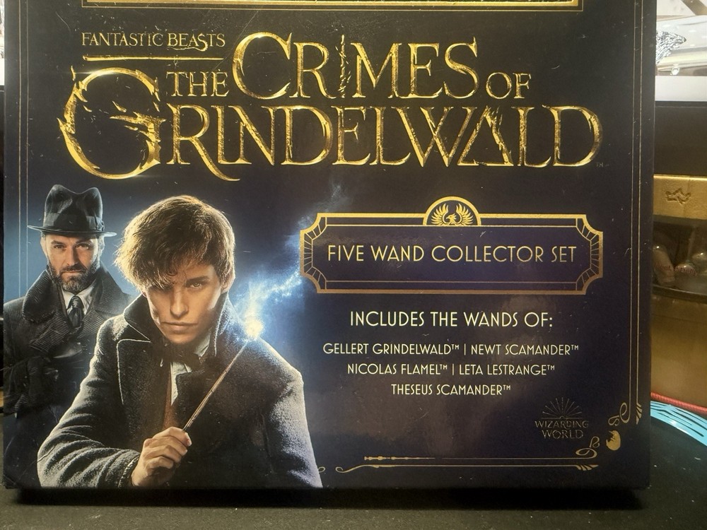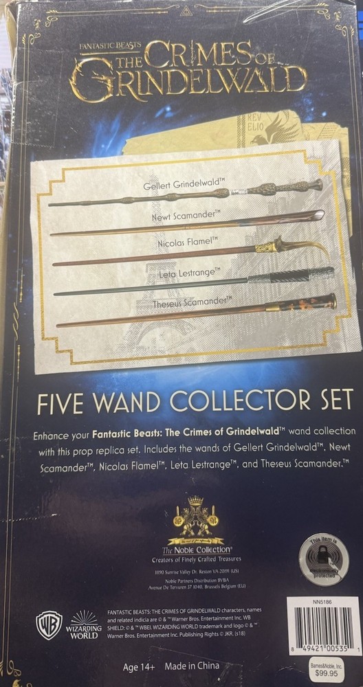 The Noble Collection The Crimes Of Grindelwald Five Wand Collector Set is a highly sought after collectible for fans of the Harry Potter franchise. This set includes five intricately designed wands inspired by the iconic magical world created by J.K. Rowling. Each wand is meticulously crafted and embodies the essence of the fantasy genre, making it a must-have for any collector or Harry Potter enthusiast looking to add a touch of magic to their display. With The Noble Collection's reputation for quality and attention to detail, this set is sure to be a prized possession for any fan of the series. The box is banged up (see pictures), but the wands are new in the box. Set includes the wands of Gellert Grindewald/Albus Dumbledore (Elder Wand), Newt & Theseus Scamander, Leta Lestrange and Nicolas Flamel.