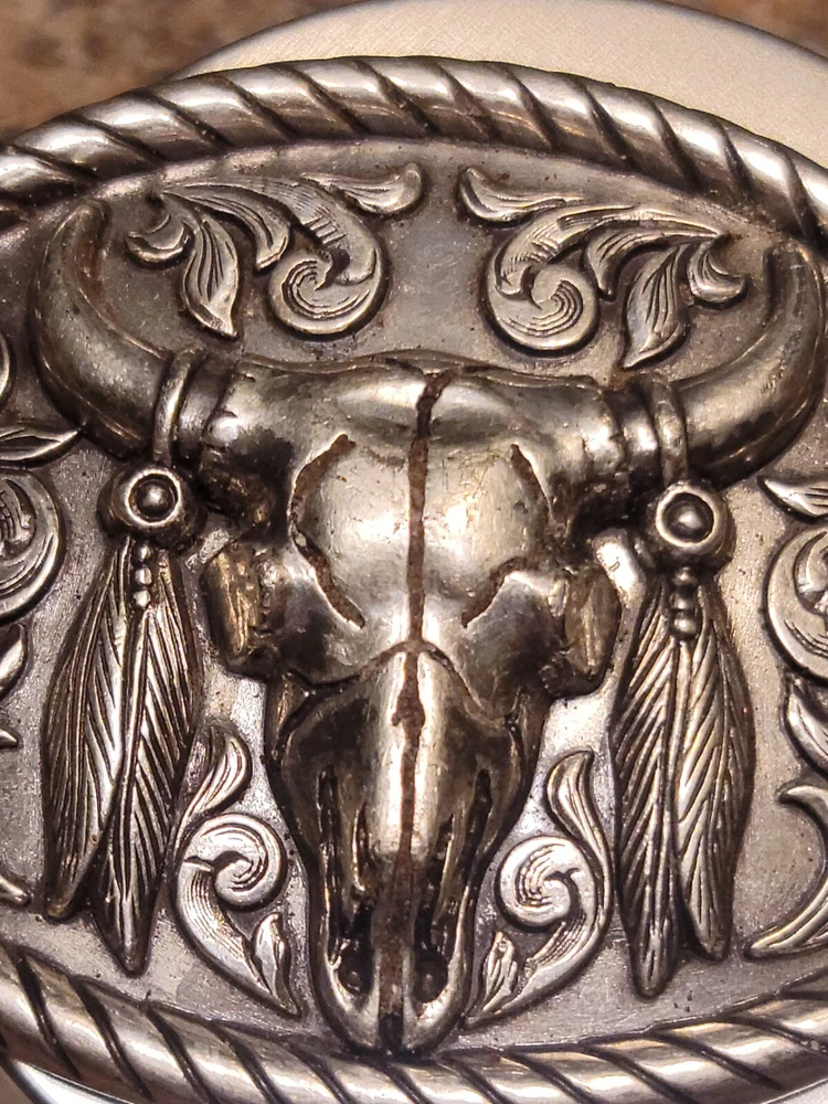 Nocona Western Buckle Oval Steer Skull Floral Antique Silver Tone 37030