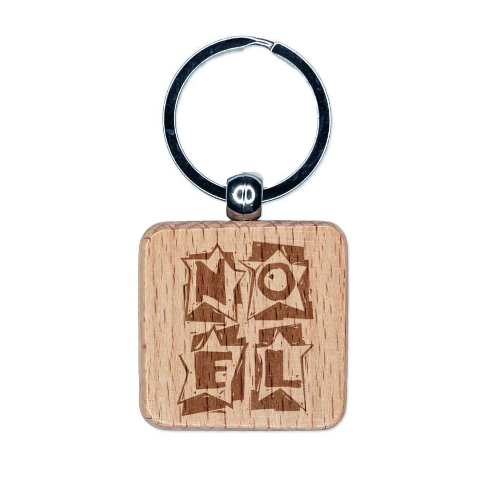Noel in Stars Christmas Engraved Wood Square Keychain Tag Charm