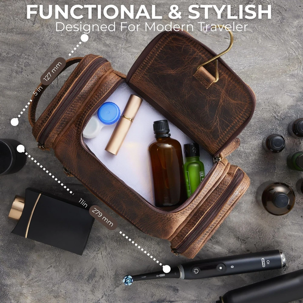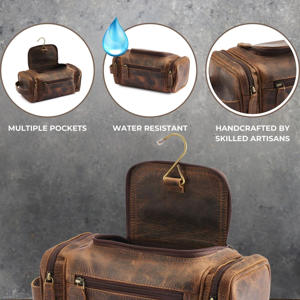 Elevate your travel experience with our premium Toiletry Bag Men, a versatile mens toiletry bag for travel that combines style and functionality; this leather pouch serves as the perfect shaving kit bag for men travel, ensuring all your essentials are organized in one place—ideal for those seeking mens toiletry bags for traveling, our leather travel bags for men are designed to withstand the rigors of travel while maintaining a sleek appearance; whether you need a dop kit, men toiletry travel bag, or a mens travel kit, this men's toiletry bag is your go-to solution; personalize your grooming routine with our personalized toiletry bag for men, or opt for our mens dopp kit for travel, which doubles as a practical toiletry case; crafted from high-quality materials, our leather dopp kit bag men is perfect for the modern traveler, serving as a travel bathroom bag men will love; with ample space for your shaving bag for men travel, mens shave bag, and mens cosmetic travel bag, this toiletry bag is the ultimate companion for any journey. PREMIUM QUALITY- Crafted from 100% full-grain buffalo leather, this mens toiletry travel bag is durable and luxurious. It features a waterproof lining, sturdy handle, zippers, and a flexible design, offering style and practicality for any trip VERSATILE & PRACTICAL - This mens travel bag toiletry with an extra-wide lid offers quick access to shaving kits, makeup, and travel essentials. A stylish dopp kit for men, it’s perfect as a shower, hygiene, medicine, or all-in-one organizer bag. SPACIOUS & STYLISH - This mens shaving bag is versatile for men and women, sized at 11" L x 5" W x 4.5" H to hold all travel essentials. A solid brass hook allows easy hanging. Perfect as a travel kit for men, combining style and functionality. EASY ACCESS: The men travel toiletries bag is equipped with multiple compartments, allowing you to quickly find your hygiene bag men essentials without rummaging through your belongings. TSA APPROVED & GIFTABLE - NomadCraftsCo.'s mens bathroom bag is TSA-approved for hassle-free travel and efficient security checks. Stylish, durable, and giftable, it’s the perfect leather gift for men. Backed by our promise to ensure your satisfaction!
