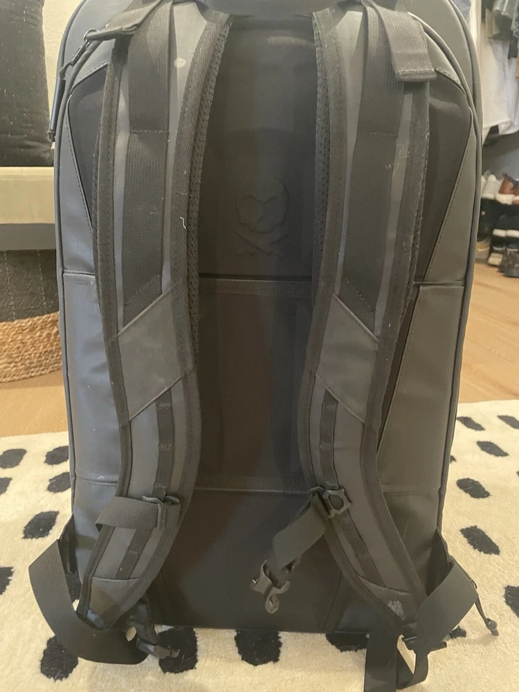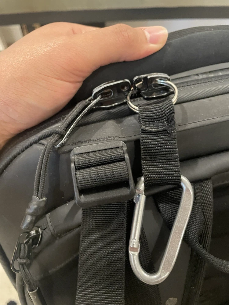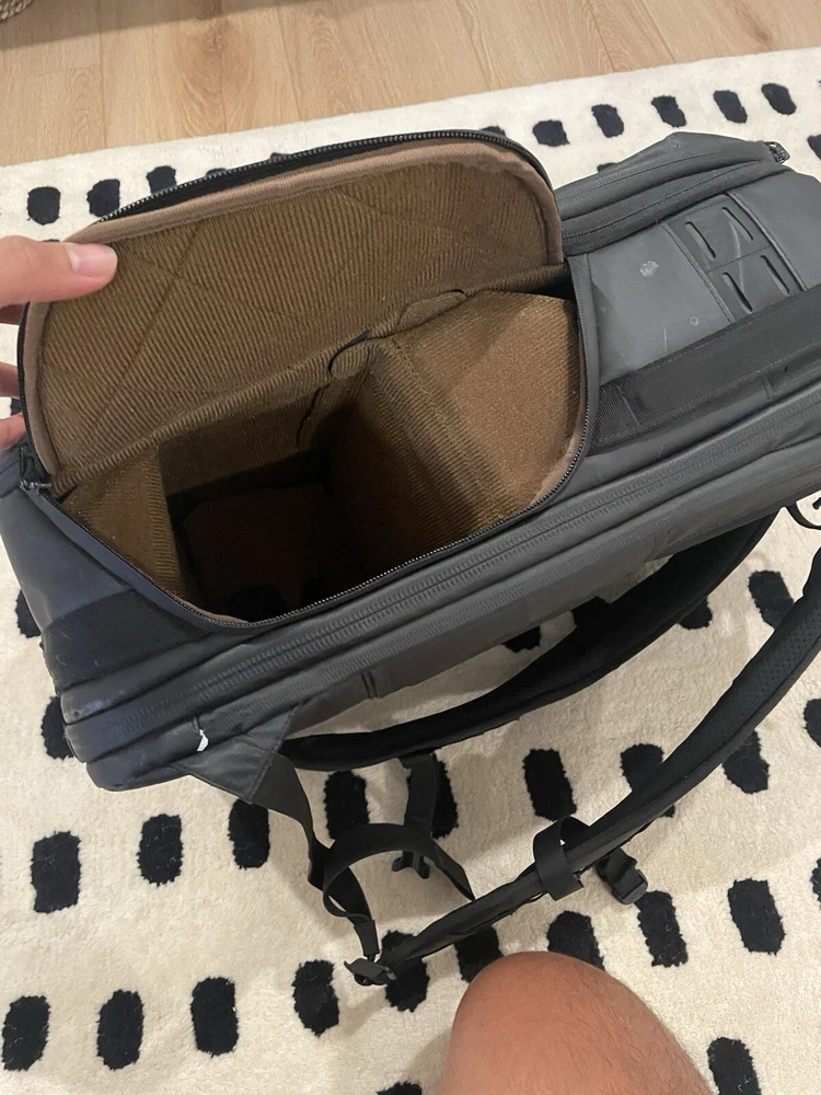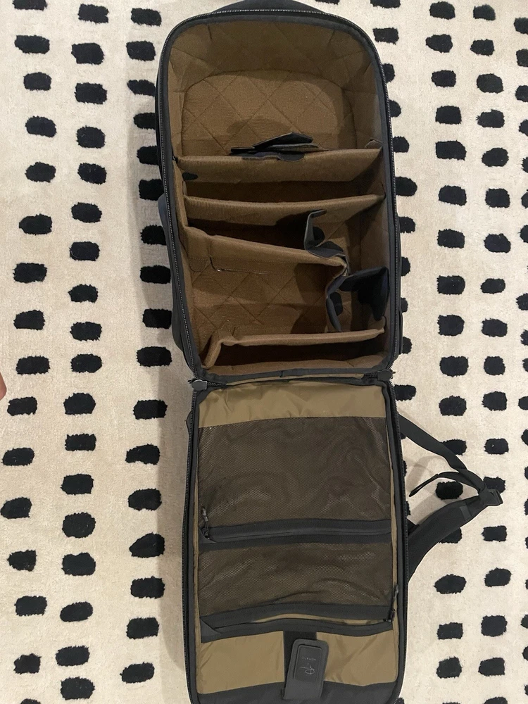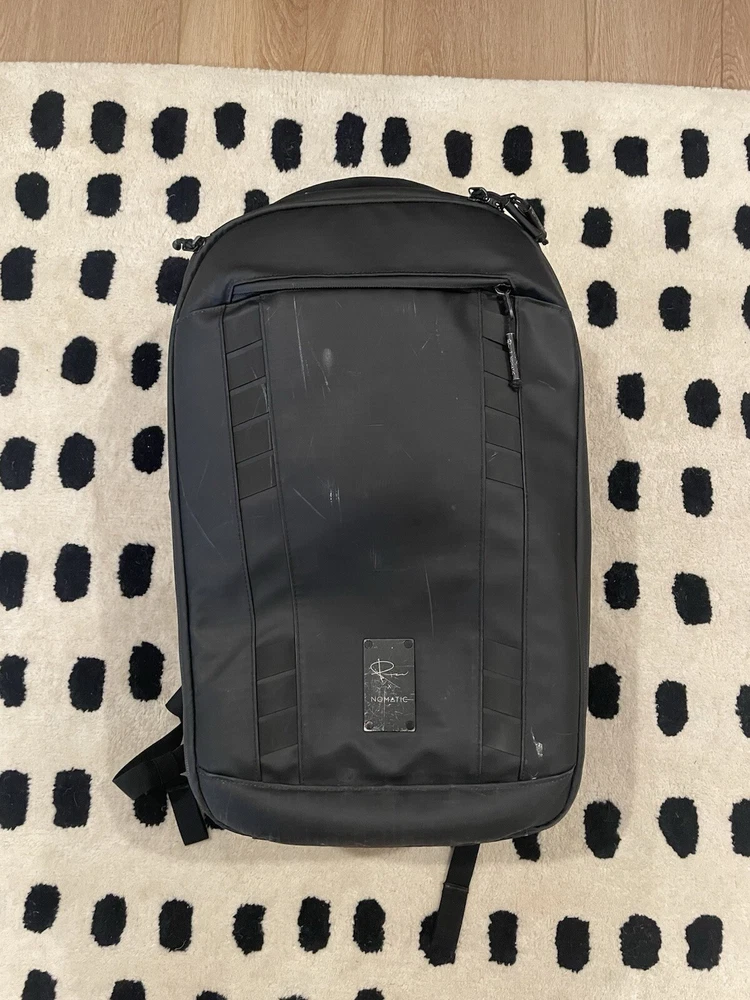 The Nomatic McKinnon 35L Camera Backpack is made of durable Nylon material featuring waterproof zippers with large anodized aluminum pulls, a magnetic closure water bottle or travel tripod pocket, and zippered side access into the main camera compartment. Additionally, it has a padded, water-resistant tarpline exterior material, quick side access directly into the primary camera body pocket, and accessory compartments. The backpack is designed to fit camera accessories and camera equipment. The bag is in used condition and a zipper tag is missing, but the zipper remains is in function 100%. This is shown in the last photo with a carabiner solution (which won’t be included).