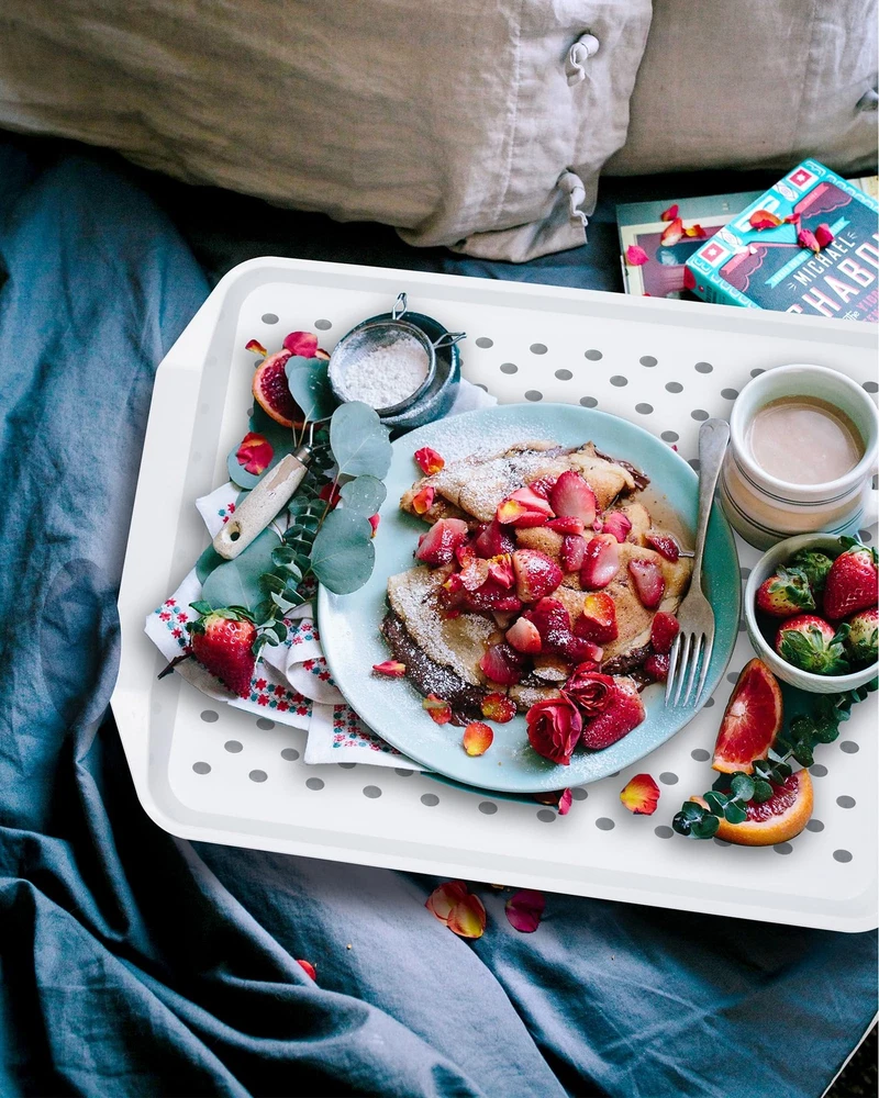 Non Slip Serving Tray with Handles, White STURDY NONSLIP SERVING TRAYS: The non-stick dots on the surface are ideal for carrying glass or plates without sliding around. Moreover, the bottom has a grippy stripes, which can ensure trays stay lap or hands without sliding off and won't scratch the table VERSATILE TRAY: It is great to transport your food as breakfast or dinner tray, perfect for a snack or cup of coffee working as a bed tray for eating, Nice for enjoying football match in a recliner to be tv trays, to Keep in the car for tailgating while traveling, to have picnics and carry dinner to the porch, to celebrate activities at outdoor patio, etc. PREMIUM MATERIAL: Made of plastic and rubber material, it is a stiffer food tray, direct food contact with this tray is available. This plastic serving tray is shatterproof and will not lose its flat surface overtime, dishwasher is not applied in this tray, we recommend to clean by flowing water or damp cloth ( 2pcs cleaning pack are included ) THOUGHTFULLY DESIGNED: The size is manageable Roomy enough for a 10” dinner plate, glass and saucer on it, looking as a modern rectangular style meal tray with hand size fit, it is easy to hold on hands and stackable for storage in your kitchen. It doesn’t stain and easy to clean BRAND FEATURE: Best wish for life and minimized messes, try to provide confident building trays for serving food, and willing to think more for those who get a bit hand shaky, Great for older people to eat on, messy fur babies who eat off in the meals, the pets who contain messy kibble on the floor