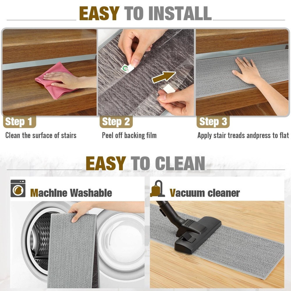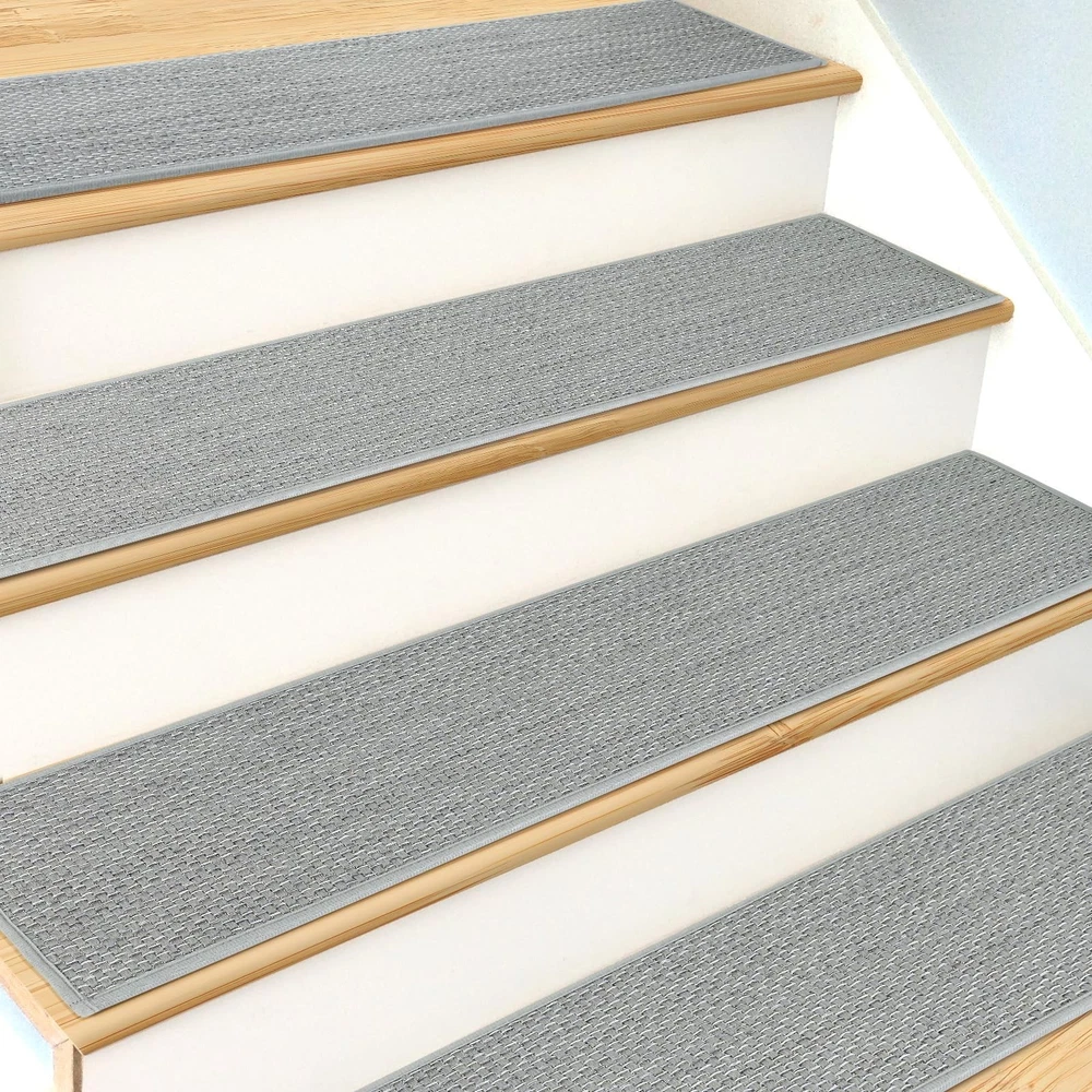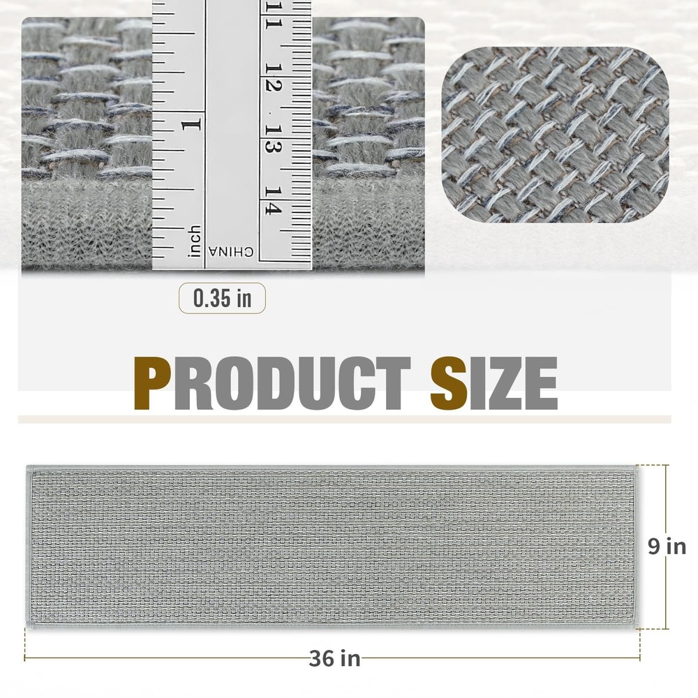 Stair Treads Non Slip for Wooden Steps Indoor 9" x 36" 8 Pack Extra Wide Stair Tread Carpet Stairs Runner, Step Pads with Reusable Adhesive for Dogs Kids Elders, Machine Washable, Light Grey Product Details Size: 9 x 36 inch Color: Light Grey Number of Items: 8 Brand: SMILOOL MPN: XYL-50-1 UPC: Does not apply EAN: Does not apply Material: Polyester (PET) Brand: SMILOOL Color: Light Grey Number of Items: 8 Item Weight: ‎3.76 pounds Package Dimensions: ‎14.88 x 12.91 x 4.92 inches Date First Available: November 19, 2024 Anti Slip Stair Runners for Wooden Steps: The back of safety stair rug is made of specially engineered TPE slip-resistant material that grips surfaces of stairs firmly, securing the stair mats in place on steps. Protect your family, kids, dogs and pets from slips and falls while going up and down stairway. Easy to Install and Remove Without Damaging Stairs: We've redesigned the staircase step treads backing for easier peel-off. Just clean and dry the stairs, peel off the backing, and stick the interior temporary stair treads on steps. Our unique non skid self adhesive material lets you reposition or remove the extra large step rugs for stairs easily, without leaving sticky residue or damage the stairs like glue or permanent adhesives over time. Easy to Clean and Reusable: When it's time to clean the stair covers for wood stairs, simply vacuum them or put them in the washing machine with mild detergent, or hand wash. Let air dry completely before putting the stair mat back on the stair, the carpet strips for stairs maintain their non-slip grip and shape. Durable, Comfortable Material: Our individual woven stair treads are made of fade-resistant, non-toxic soft fiber similar to natural linen, sisal, jute, sawgrass or seagrass that's safe for kids and pets. These stair carpets for wooden steps can reduce noise while walking on stairs and feel comfortable underfoot, even when barefoot in winter. Our stair case runner for wood stairs have a very attractive look to decorate your stairs and elevate the tastefulness of your home's style. Widely Applicable: Removable stair treads for wooden steps set of 8, single stair tread measuring 9 x 36 x 0.35 inches for each piece. These extra wide long stair treads fit most indoor stairs, they grip smooth surfaces like over wood, tiles, stone, hardwood, cement, metal, and glass stairs. Great for floor, kitchens, restaurants, rooms, hallways, basement, game rooms and kids' bedrooms.