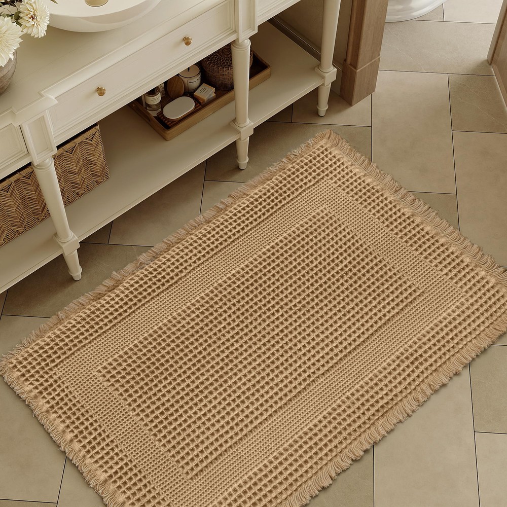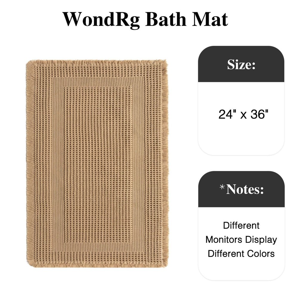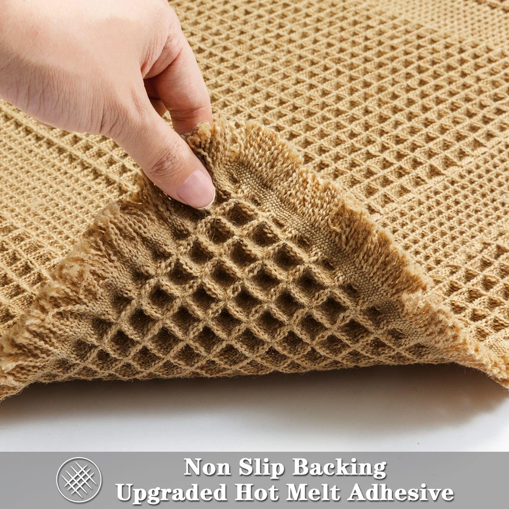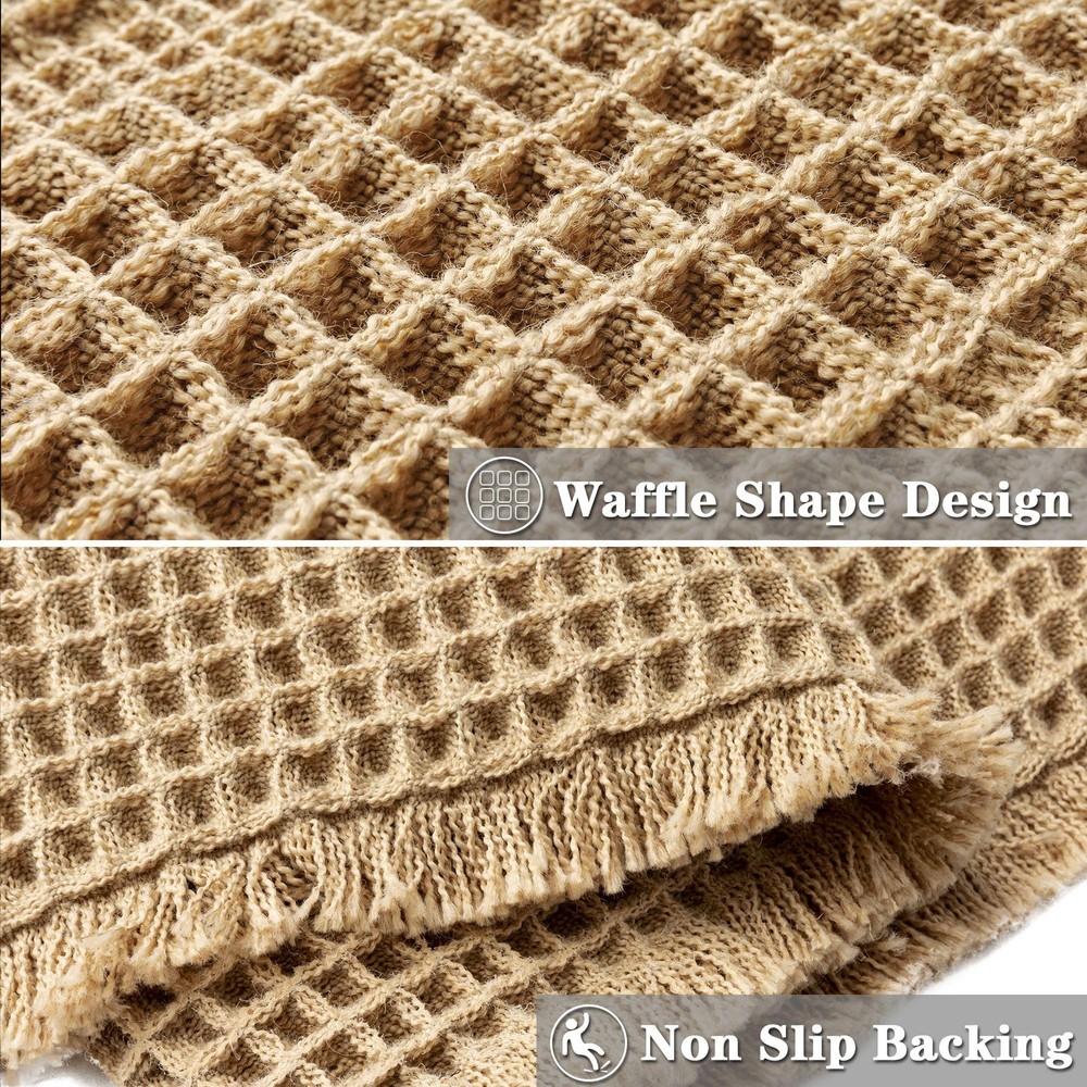 Waffle Bath Mat Stylish Boho Kitchen Floor Rugs Bathroom Rugs Set 2 Piece Versatile Waffle Bath Rug Product Features: Distinctive Waffle Design: This waffle bath mat features a unique 3D waffle texture with tassels that adds a modern, stylish touch to your bathroom decor. Crafted with upgraded yarns, it is durable, decorative, and never out of shape, ensuring a premium experience every time. Super Absorbent Bathroom Rugs: The deep waffle texture and double-layer microfiber yarns provide exceptional absorbency, soaking up water instantly like a sponge. This helps keep your bathroom floors dry and safe, even after a shower or bath. Its breathable material promotes quick drying, keeping the mat fresh for extended use. Antislip Waffle Bath Mat: This rubber backed bath rugs is equipped with a hot melt adhesive backing, it can firmly grips the floor and avoid unwanted slipping or movement. It ensures safety for all, especially kids, pets and seniors, and is perfect for use in bathrooms, kitchens, or hallways. Boho Woven Bath Runner Rug: The thicker and heavier waffle texture and flexible yarns create a cozy, cloud-like feel underfoot. Bath mat is available in multiple sizes, making it suitable for various placements such as outside the shower, by the tub, in front of single or double sinks, or even in the kitchen and hallway. Warmth Warning: 1. Check the size information carefully before purchasing to choose the most suitable size; 2. Machine washable on a gentle cycle in cold water with a laundry bag. Hang Dry. Do not iron or use bleach. 3. Due to manual measurements, there may be about 2 inch difference. 4. Slight variations in color may occur due to lighting and display differences. Non Slip Waffle Bath Mat: The waffle bathroom rug is power-loomed with upgraded yarns and designed with lantern-shaped lines,making the bathroom rug more durable without compromising on decoration and elegance. The thicker and more compact weave and 3D waffle grids ensure the pattern stays intact and never loses shape. Super Absorbent Bath Rug: Featuring a double-layered waffle texture, this soft bath mat quickly absorbs water underfoot, keeping your bathroom or kitchen floor dry and clean. The breathable high-density fabric promotes airflow, aiding in faster drying and soak up water. Washable Bathroom Rugs: The antislip waffle mats for bathroom and kitchen are designed with a hot melt adhesive backing, making the bath mat firmly grips the floor and preventing slips and falls after stepping out of tub, taking a bath or washing by the sink. Good partner for any family with kids or seniors, it provides enhanced safety and stability. Soft and Versatile Bathroom Mat: The three-dimensional waffle texture combined with flexible yarns delivers exceptional softness, providing a cozy, cloud-like feeling underfoot. Ideal for protecting your feet from cold bathroom floors after a shower. This bathroom mat is vailable in multiple sizes to suit various uses, such as outside the shower, by the tub, beside the toilet, by single or double sinks, along hallways, or even in the kitchen. Easy Care Floor Rug: Machine washable for hassle-free cleaning, this bath mat maintains its vibrant color and texture wash after wash. For best results, wash on a gentle cycle in cold water with a laundry bag and hang dry. For simple cleaning, just shake the dust off from the waffle bath rugs.