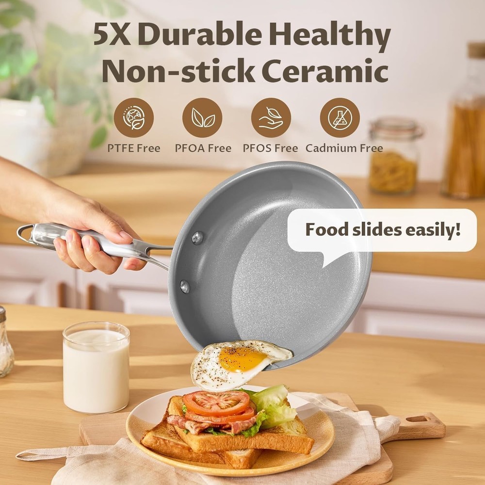 About this item - : Our induction cookware set provides a maximum contact area for faster, more energy-efficient cooking and offers unmatched durability that surpasses dotted bases % : Thanks to our molecular-bonded full-surface induction layer, direct energy transfer with minimal loss cuts down your electricity bill, saving you time and energy from the very first use %- : Say goodbye to flickering and error messages common with dotted bases. Our seamless base of non stick frying pans deliver a stable connection on all induction hobs : Unlike spot-welded bases that can buckle over time, our ceramic frying pan's molecular-bonded base resists deformation and delamination for superior durability : The seamless molecular-bonded layer ensures every inch of the frying pan heats evenly, so your food never scorches in the center while the edges remain uncooked : Whether induction, ceramic, gas, or electric, this pan delivers excellent performance on all stoves. Oven-safe up to 230°C - -: Food slides right out. The exceptional food release means cleanup is incredibly fast and simple. Added peace of mind - our ceramic frying pans are 100% free of PTFE and PFOA - : Includes induction pans with diameters of 8", 10" and 11", as well as 2 pan lids. This all-in-one set covers everything from quick single portions to large family meals : This kitchen frying pan set is more than just a gift — it's something they'll truly use and enjoy. With its stylish design, it’s perfect for Christmas, housewarming parties, New Year’s, Mother’s Day or wedding Material: Aluminum, Ceramic Coating, Free of PTFE , PFOS and PFOA Color: Gray Brand: Size: 5-Piece Frying Pan Set with Lids Handle Material: Cast Steel