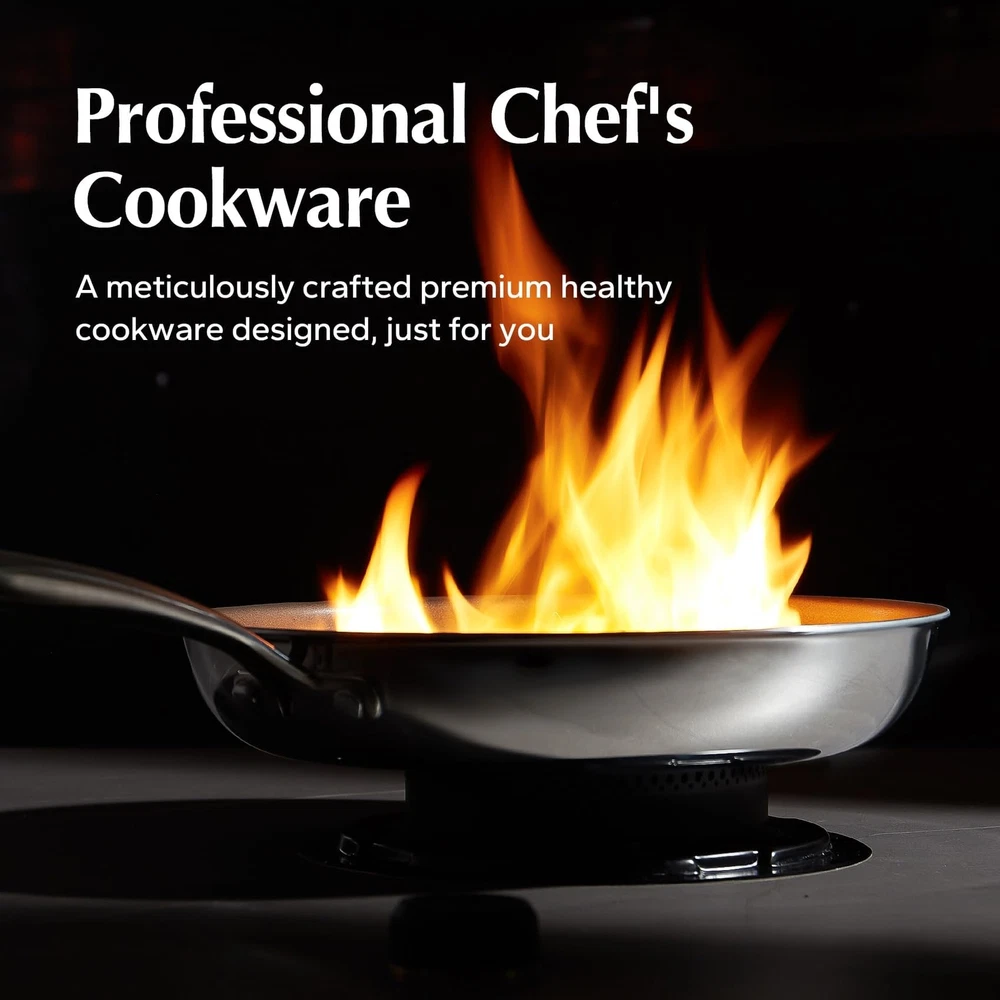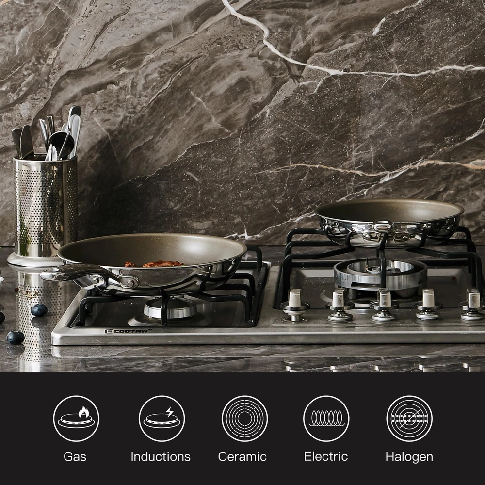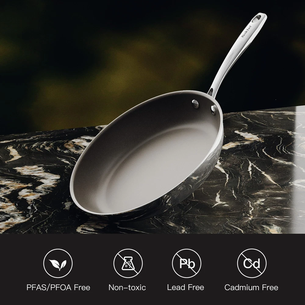 Long Lasting Nonstick: With Titanium Ceramic technology and scratch resistant 1.5 Million Times. Titanium Ceramic is a healthy and durable coatings with excellent non-stick and frying properties, has good abrasion resistance and extreme long-lasting Healthy Cooking: All non stick frying pans contain no PTFE, PFOA, PFAS, lead, cadmium, or other harmful materials that can leach into your food, making them safe for you and your family Easy To Clean: These ceramic cookware set have exceptional nonstick performance coating. Provides unprecedented non-stick cooking performance for easy food release, easy clean up. Simply wipe off any residue with a soft sponge or cloth, and it's ready for the next cooking Tri-Ply Design: The non stick frying pans is built with sturdy tri-ply stainless steel construction – aluminum between two layers of stainless-steel, cover with our unique Ti-ceramics nonstick technology to deliver the searing power of stainless, durability of cast-iron and easy cleanup of nonstick Oven & Stovetop Safe: Stovetop agnostic & oven safe, heats up quickly and evenly with extended bottom design. High magnetic conductive stainless steel base allows our nonstick cookware to work on all cooktops, including induction. The non stick frying pans frying pans is made for any kitchen and cooktop. It can be used effectively on induction, gas, and electric stove tops, and is oven-safe, the good non stick frying pans for every kitchen
