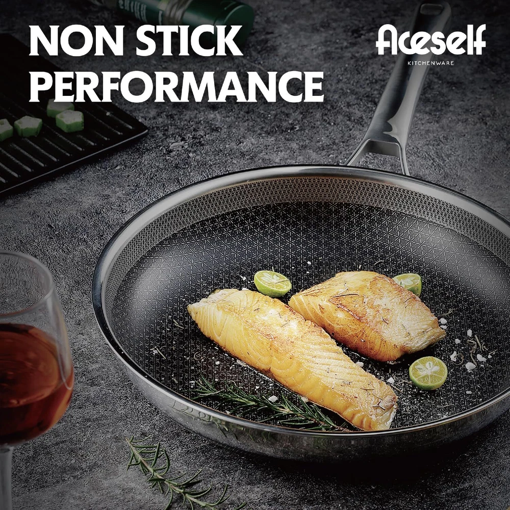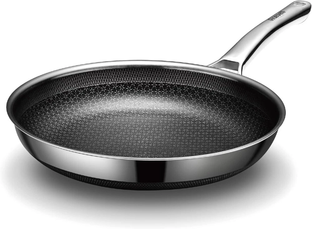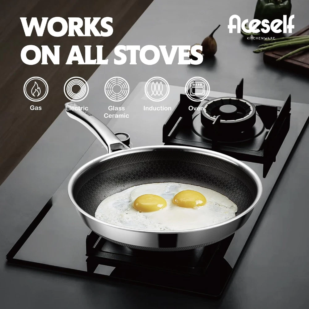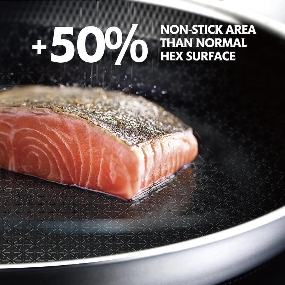 【SNOW FLAKE TECHNOLOGY】Our design is created through a etching process to provide both stainless steel and non stick surface. This dual surface allows to cook with less oil, grease, and butter.Our cladding surface is 50% more than usual Hex surface pans. 【SPECIALITY】Multi-layer compositse steel effectively solves the heat conduction problem of pure steel and makes quick & even heat transfer for cooking. 【HIGH-QUALITY MATERIALS】Made with High-quality stainless steel, our pan is built to last. The surface is completely non-toxic for the best balance of utility and performance. 【EASY TO CLEAN】Thanks to its non-stick surface and easy-to-clean materials, our pan makes cleanup a breeze. 【UNIVERSAL】Our pan works on all types of stovetops, including gas, electric, glass, halogen, making it a versatile addition to your cookware collection.