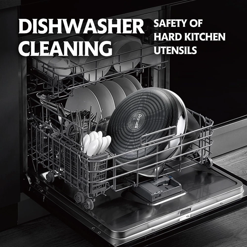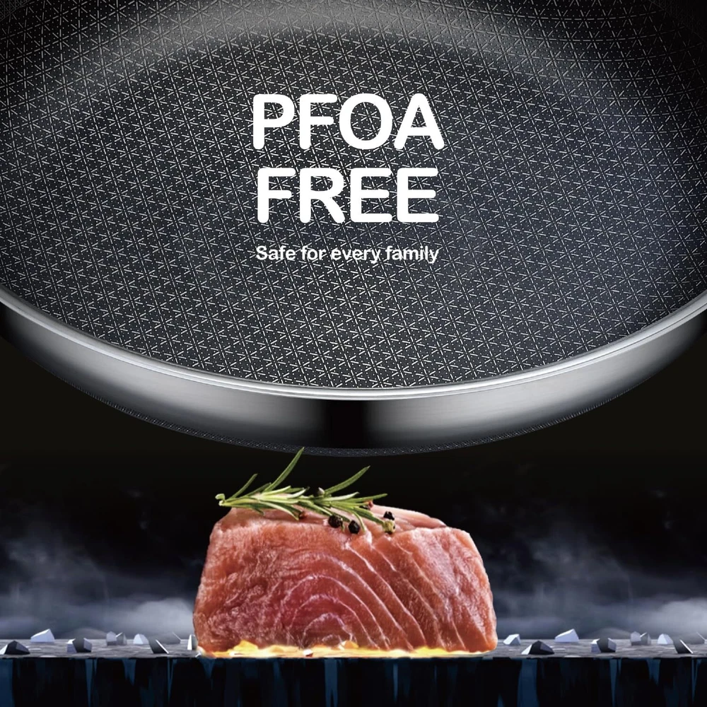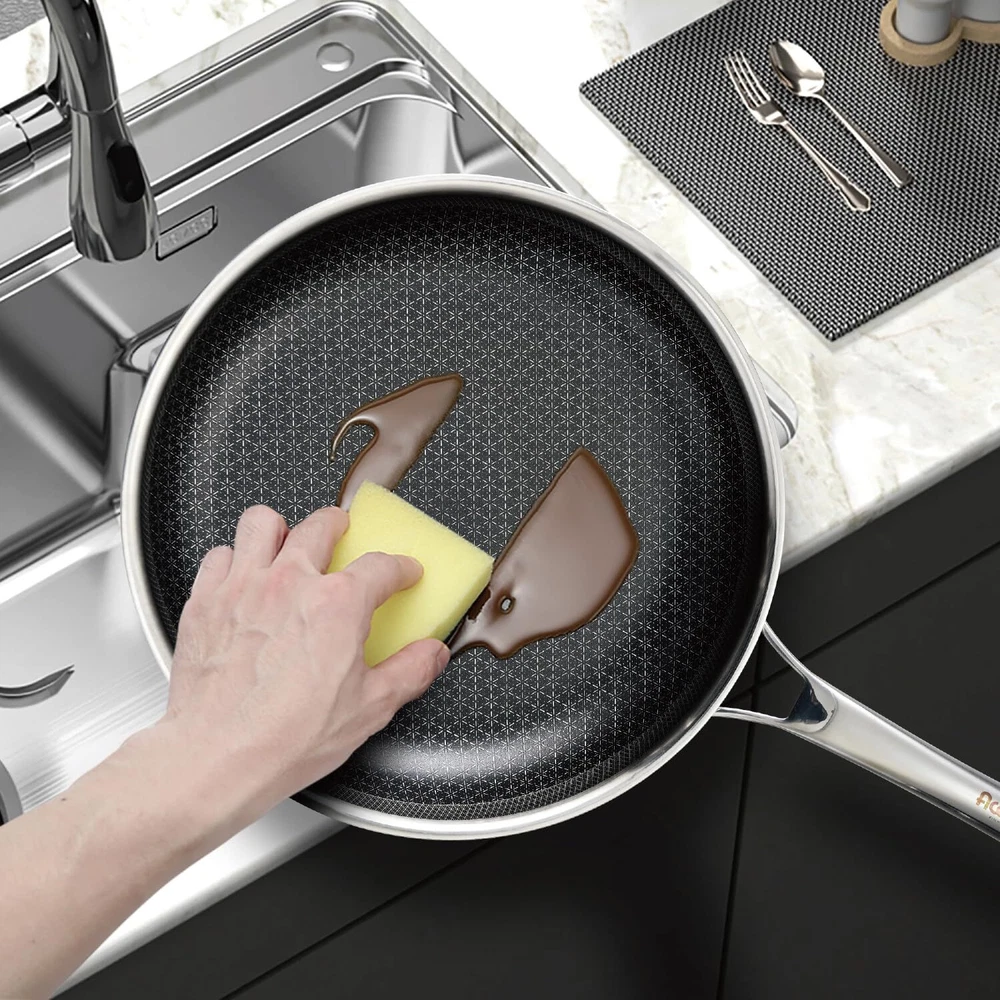 【SNOW FLAKE TECHNOLOGY】Our design is created through a etching process to provide both stainless steel and non stick surface. This dual surface allows to cook with less oil, grease, and butter.Our cladding surface is 50% more than usual Hex surface pans. 【SPECIALITY】Multi-layer compositse steel effectively solves the heat conduction problem of pure steel and makes quick & even heat transfer for cooking. 【HIGH-QUALITY MATERIALS】Made with High-quality stainless steel, our pan is built to last. The surface is completely non-toxic for the best balance of utility and performance. 【EASY TO CLEAN】Thanks to its non-stick surface and easy-to-clean materials, our pan makes cleanup a breeze. 【UNIVERSAL】Our pan works on all types of stovetops, including gas, electric, glass, halogen, making it a versatile addition to your cookware collection.