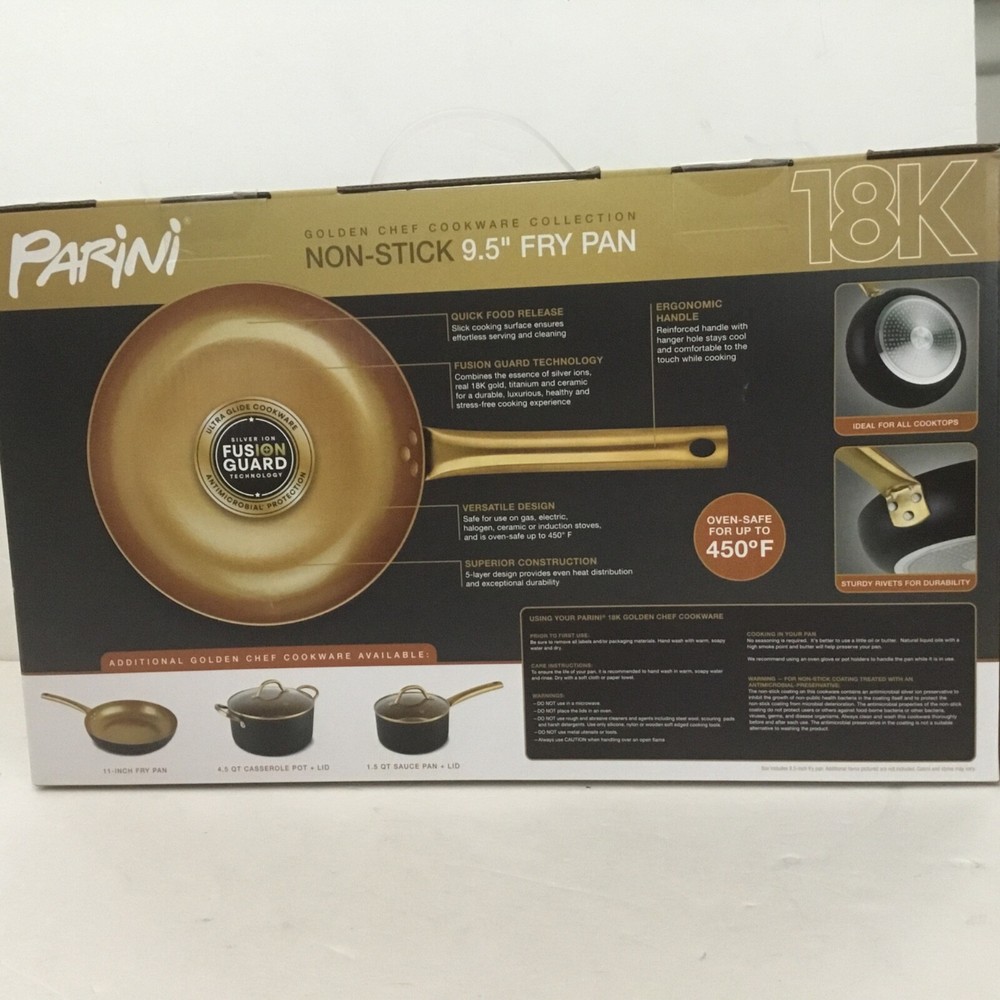 The Non-stick Parini 9.5" Fry Pan is a high-quality frying pan coated with 18k gold, suitable for use on various stove types including induction, glass top, electric, gas, and ceramic. With a round shape and a diameter of 9.5 inches, this frying pan is perfect for cooking a variety of foods. The non-stick surface coating ensures easy cooking and cleaning, while its oven-safe design adds versatility to your kitchen. This frying pan is a must-have for any home cook looking for a durable and efficient cookware option.