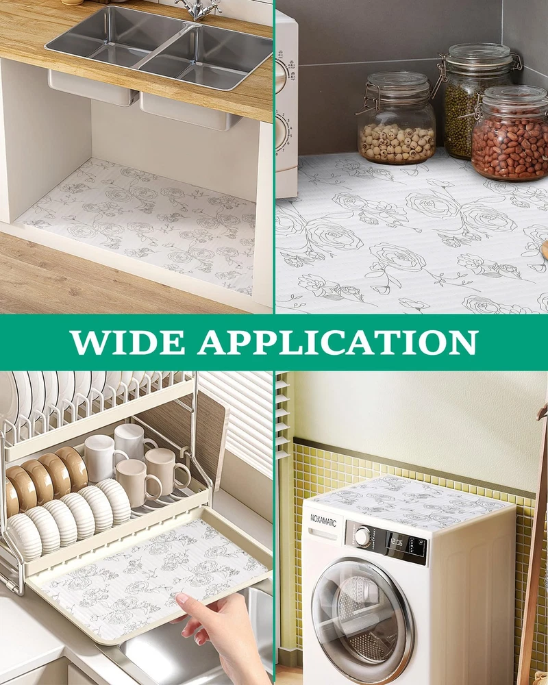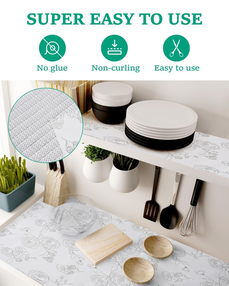 QUALITY AND DURABILITY: Our drawer cabinet liner is thicker, tear-resistant, soft material, has a slight "padded" quality, non-curling edges, durability, and it can be reused, is the great liners to protect surfaces from dust, dirt, and scratches STRONG GRIP: Our drawer liner has a stylish geometric pattern on the top, the other has soft foam anti-slip design that has a slightly cushioned feel to it. And this design offers a double non-slip that keeps them from slipping and keeps in place EASY TO USE: Our drawer cabinets are functional and pretty, the soft material allows the liners to flat against your shelving or drawers. Non-adhesive, won’t worry about leaving residue. It is perfect for home use, also the best choice for renters EASY TO CLEAN: The smooth surface of this drawer cabinet is designed to act as a great waterproof, just washable, or wipe with a damp or dry cloth or paper, keeping a clean, new surface MULTIFUNCTIONAL LINERS: In addition to lining your shelves and drawers, the liners can be used for cabinets, wire shelves, tool storage cabinets, under the sink, and in the laundry room, ensuring that the furniture is long-lasting and as good as new