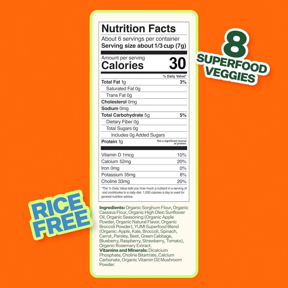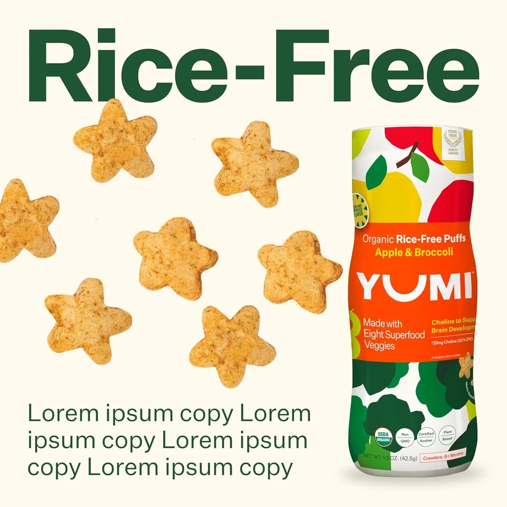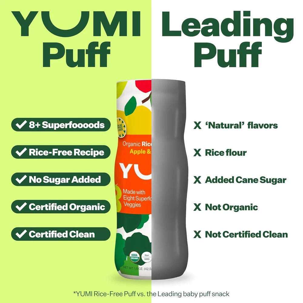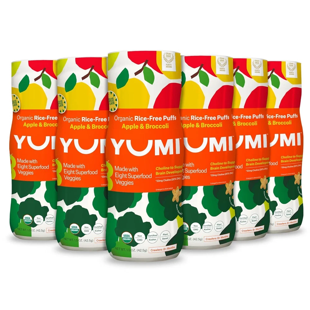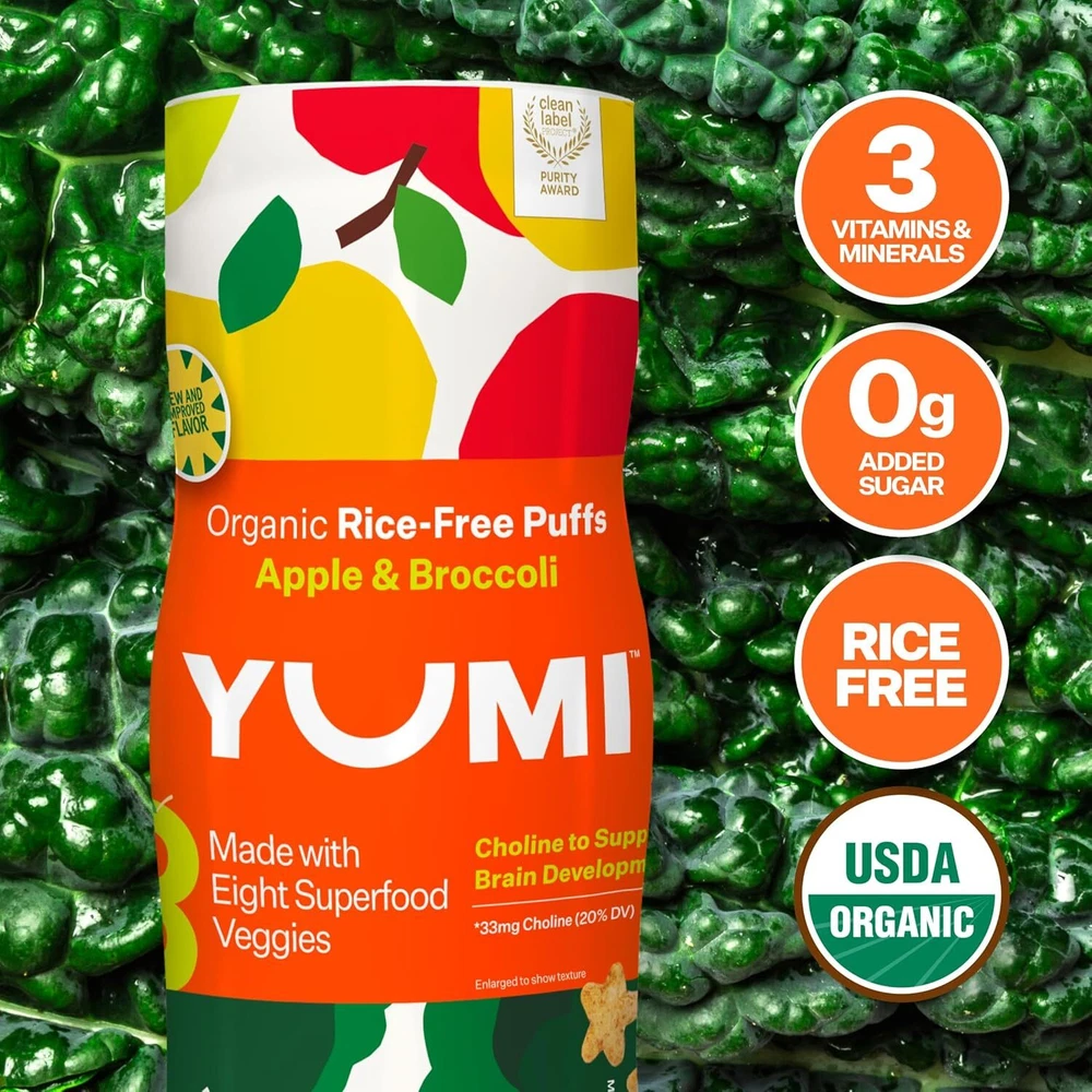 DEVELOPMENT-FOCUSED: YUMI Puffs contain +8 superfood veggies and are a good source of 3 essential nutrients. They're an excellent source of calcium and choline, two nutrients crucial for childhood growth and development. Give your child a nutritional advantage with snacks formulated with their development in mind. SIMPLE INGREDIENTS: YUMI Organic Infant Puffs are made with easily recognizable ingredients, and free from artficial colors and flavors. 100% USDA Certified Organic, BPA-free, dairy-free, gluten-free, Kosher certified, and 100% plant-based. Gold-mellin Your best online business partner Non-GMO Baby Snack Puffs School Safe for Daycare and Lunchboxes Apple & Broccoli DEVELOPMENT-FOCUSED: YUMI Puffs contain +8 superfood veggies and are a good source of 3 essential nutrients. They're an excellent source of calcium and choline, two nutrients crucial for childhood growth and development. Give your child a nutritional advantage with snacks formulated with their development in mind. SIMPLE INGREDIENTS: YUMI Organic Infant Puffs are made with easily recognizable ingredients, and free from artficial colors and flavors. 100% USDA Certified Organic, BPA-free, dairy-free, gluten-free, Kosher certified, and 100% plant-based. CLEAN LABEL PROJECT PURITY AWARD WINNER: YUMI products have been independently verified and awarded the Clean Label Project Purity Award, which tests for over 400 contaminants, including heavy metals. NO RICE: Our puffs have a sorghum base instead of rice, avoiding the heavy metal concerns associated with rice-based baby foods and toddler snacks. NO ADDED SUGAR: Yumi is committed to no added sugar in all its puffs, bars and toddler snacks. SCHOOL SAFE SNACK: Discover our range of school-safe snacks that are perfect for kids of all ages. Our snacks are meticulously crafted to meet school guidelines and regulations, ensuring a worry-free option for lunchboxes and snack times. Each of our school-safe products are carefully prepared with high-quality ingredients and are made with nut-free, dairy-free, and gluten-free recipes. HEALTHY AND CONVENIENT: Perfect at home or on-the-go, these individually wrapped bars are perfect in a pinch, or as your go-to school-safe, allergen-free recipe, lunchbox snack. 1 1 1 0 1 Item Specifics Brand Unbranded Type Snack Foods Product does not apply flavor nameSize Apple & Broccoli Package Dimensions 9.65 x 8.74 x 6.26 inches; 1.63 Pounds UPC 850033324716 Flavor Apple & Broccoli Age Range (Description)