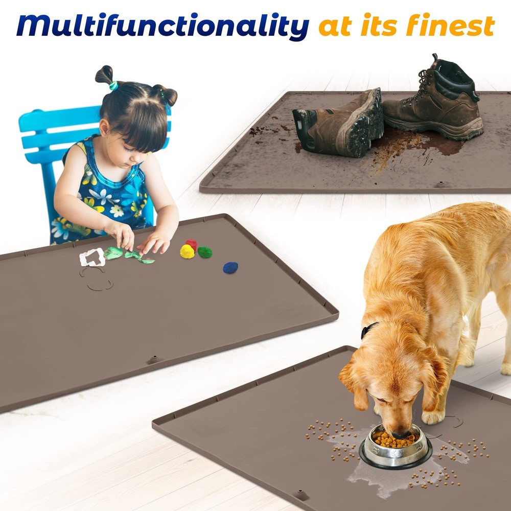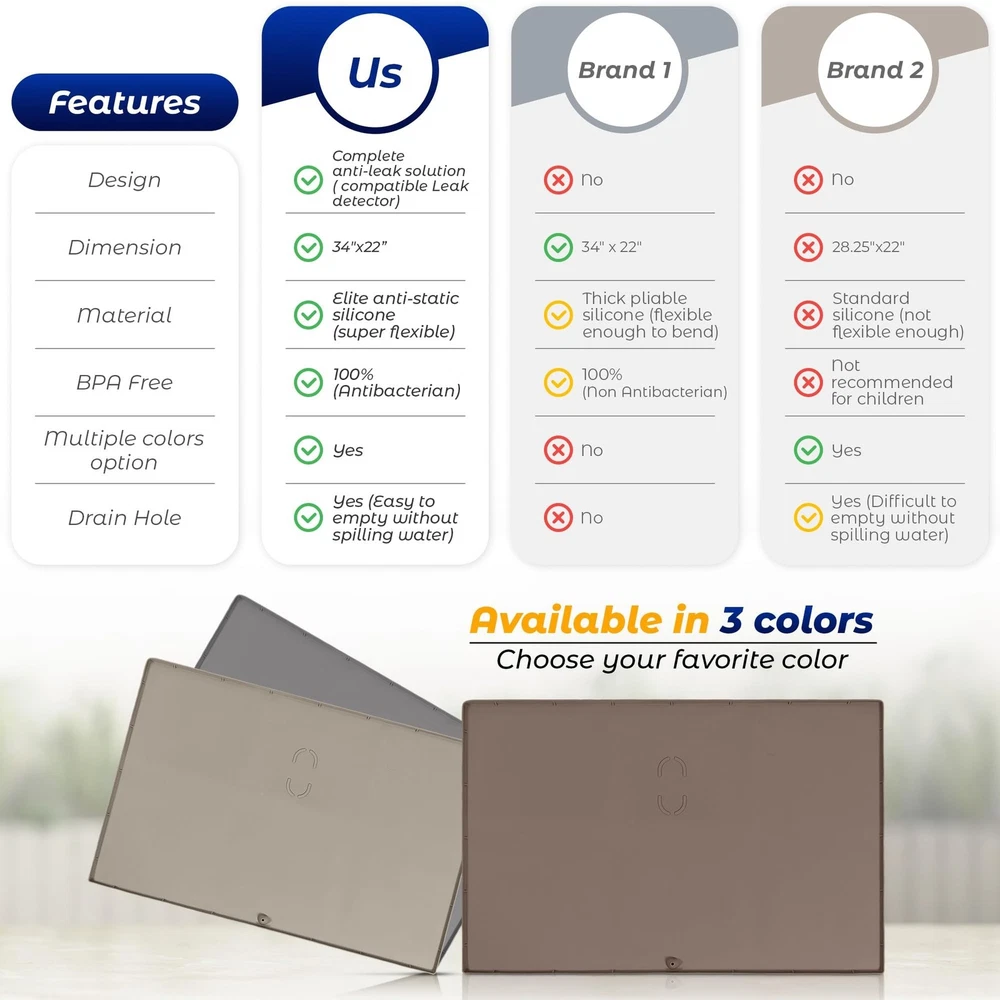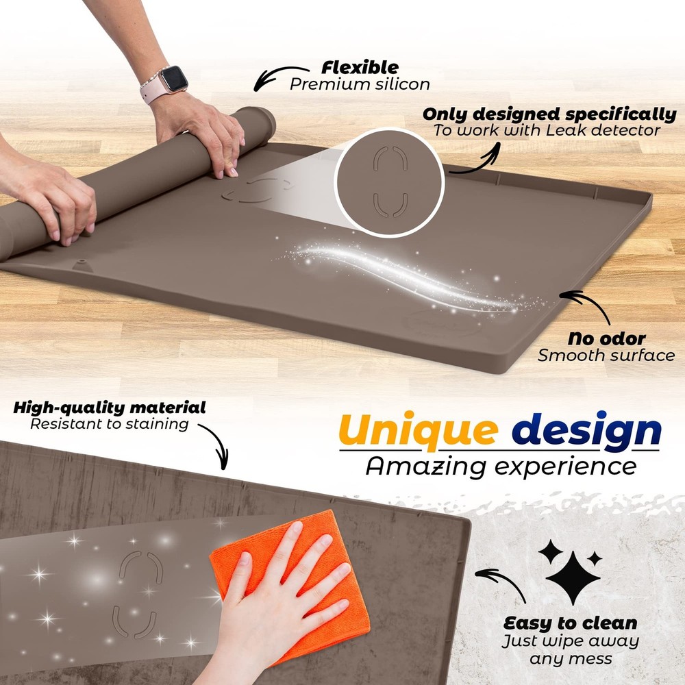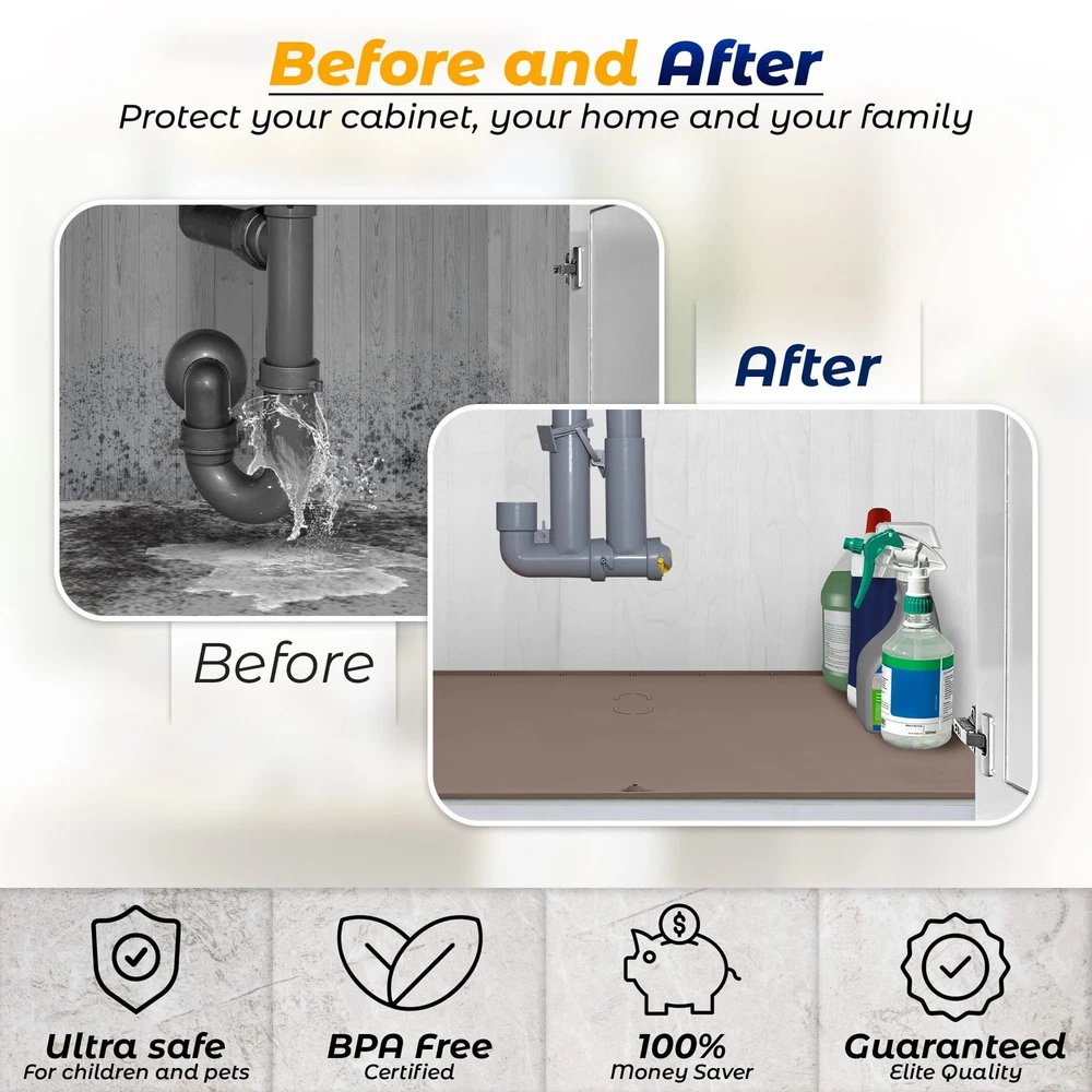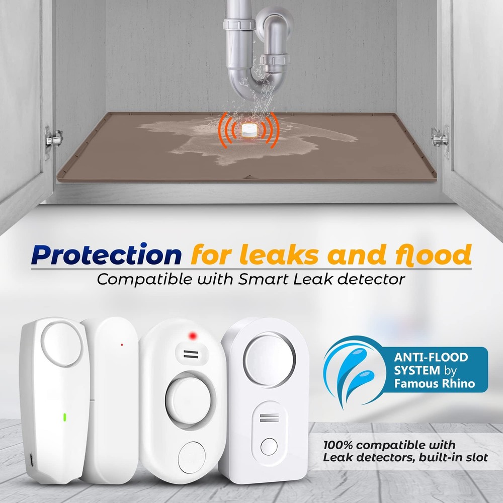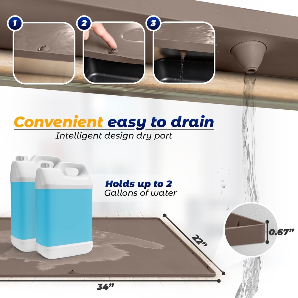 Under Sink Mat 34" x 22" Silicone, Under Sink Liner, Under Kitchen Sink Mats, Waterproof & Flexible Sink Mats for Kitchen and Bathroom - Brown Product Details Color: Brown Brand: Famous Dino MPN: Newmats_BROWN UPC: 679628397085 EAN: 0679628397085 Color: Brown Material: Silicone Product Dimensions: 34"L x 22"W Fill Material: Polyurethane (PU) Brand: Famous Dino Product Care Instructions: Hand Wash Only Shape: Rectangular Pattern: Solid Manufacturer: Famous Dino Size: 34" x 22" UPC: 679628397085 Product Dimensions: 34 x 22 x 1 inches Item Weight: 3.25 pounds Country of Origin: China Item model number: Newmats_BROWN Refill: Polyurethane (PU) Finish types: Mixed Assembly required: No Number of pieces: 1 Batteries required: No Included Components: Under sink mat PERFECTLY FITS 36 CABINETS - The size of our under the sink mat is 34'' x 22'', fits standard 36-inch kitchen and bathroom cabinets. The lip of the mat is 0.67" in height, holds up to 2 gallons of water, giving you more time to address a leak. DRAIN HOLE - drain port design, allows you to drain the leaking water easily without taking out the sink cabinet mat. Our cabinet protectors for kitchen cabinets were built with user feedback in mind. Our shelf liners for kitchen cabinets has a reinforced lip around the edge to contain spills. STABLE STRUCTURE & FLEXIBLE: Thick premium silicone design is making the sink mats for bottom of kitchen sink stronger and sturdy. The professional production process makes the under sink pan highly flexible and soft, so it is easy to fit into a cabinet. It is easy to fold and not easy to deform, no warping or curling. The reusable features of kitchen cabinet liner really save you money. LEAK DETECTOR COMPATIBLE - our under sink mats for kitchen waterproof are a deal for kitchens, bathrooms, or utility rooms. Has mark for placing the Smart Wifi leak detector in the best position to capture any leakage from kitchen sink tray. MULTIPURPOSE : Our under sink liners are not only suitable for kitchen cabinets, but also suitable for bathroom cabinets, pets, crafts, and any more occasions to prevent messes and spills!