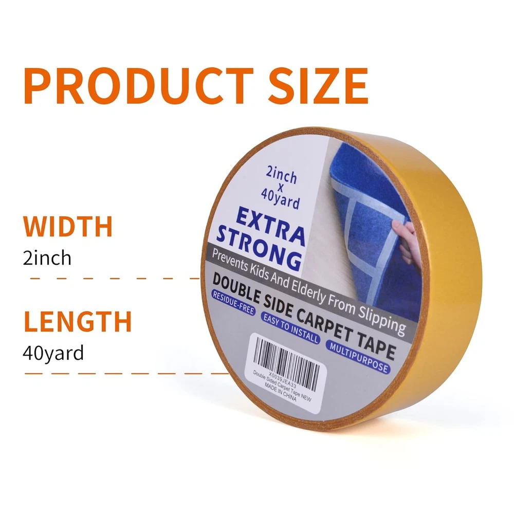 2-inch Double Sided Carpet Tape Core Parameters Material: Not specified Size: 2-inch by 40-yards Color: Not specified Technical Specifications • RESIDUE-FREE: The 2 sided carpet tape for area rugs have super strong grip to carpets and rugs in place,but also work well with wood, tiles, vinyl, and carpet surfaces, and it will be safe and residue-free without worry about your floor being damaged. • STRONG ADHESIVE: Our 2 sided tape carpet gripper for area rugs tape is designed with an extreme strength adhesive that holds rugs in place and prevents curling and slipping. • PROTECT YOUR FAMILY : The double sided rug tape protects every household by preventing the area rugs and carpets from curling or slipping.Don't worry about your family being hurt by tripping over the rug. It is a proven protector of every household. • EASY TO INSTALL: This 2-inch by 40-yards carpet tape double sided is easy to use. Just tear off the backing and you can optionally tear it to length without having to hunt for scissors! • WORKS ON MULTI SURFACE:This rug tape works well with wood, tiles, vinyl,marble, carpet and any other indoor smooth surface without damaging them. Also using for installing carpets to hardwood floors, stair treads, pads, mats. Package Information Package Dimensions: 6.02 x 6.02 x 1.93 inches Package Weight: 1.57 lbs