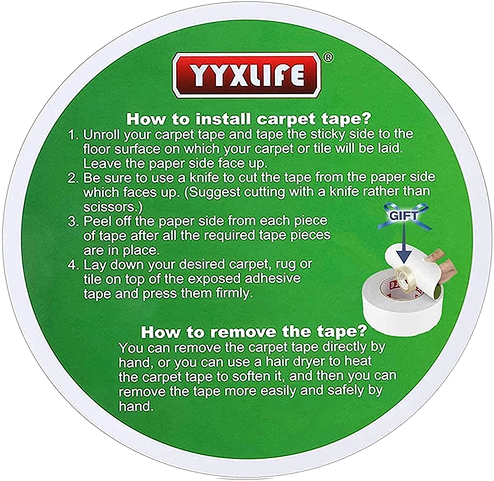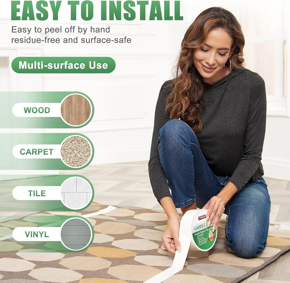Store New Arrivals Add to Favorite View Feedback Double Sided Removable Rug Tape - Carpet Adhesive for Hardwood Floors,Non Slip anti Curling Floor Tape for Area Rugs,Mats,Carpets - No Residue Strong Hold for Tile, 2Inch X 10Yards,White Description Item model number carpet tape Style carpet tape Number of Items 1 Power Source Carpet Tape Item Thickness 0.25 Millimeters Upper Temperature Rating 180 Degrees Fahrenheit Country of Origin China Cutting Diameter 4.2 Inches Batteries Included? No Unit Count 30.0 Feet Batteries Required? No Material Glass Fiber, Adhesive Type of Bulb carpet tape Installation Method carpet tape Coverage 0.8 m2 Is Discontinued By Manufacturer No Included Components carpet tape Item Package Quantity 1 Water Resistance Level Waterproof Tensile Strength 30 Pounds Item Weight 7.4 ounces Size 2Inch x 10 Yards Surface Recommendation Wood,Tile Special Features Double Sided, Residue-free, Surface-safe, Wood-safe, Heat-Resistant, Anti Slip, Heavy Duty Assembled Diameter 4.2 Inches Special Feature Double Sided, Residue-free, Surface-safe, Wood-safe, Heat-Resistant, Anti Slip, Heavy Duty Part Number DSN10 Compatible Material Carpet on Carpet Applications, Wood,tile, Area Rug on Carpets, Hardwood Floors, Tile, Lamiante, Area Rug on Carpet Applications, Carpet on Hardwood Floors, Tiles, Laminate Floors Certification Rug Tape Carpet Tape Rug Double Sided Carpet Tape Heavy Duty Rug Tape for Hardwood Floors Ca Color White Global Trade Identification Number 00759675599936 Shape Circular Recommended Uses For Product function(f) {var _np=(window.P._namespace("DetailPageProductOverviewTemplatesJava"));if(_np.guardFatal){_np.guardFatal(f)(_np);}else{f(_np);}}(function(P) { P.when('A').execute(function(A){ A.on('a:truncate:po-attribute-truncate-4:updated', function(data) { var isTruncated = !data.truncateInstance.getIfTextFits(); var seeMoreElement = document.getElementById('po-attribute-see-more-id-4'); if(seeMoreElement) { seeMoreElement.style.display = isTruncated ? '' : 'none'; } }) }); })); Mounting, Home DIY, Pads, Mats & Runners, Repairs, Craft Projects, Installing Carpets, Securing Rugs, Stair Treads, Indoor, Outdoor, Multipurpose See more Number Of Pieces 1 Heavy-Duty Grip for All Floor Types:YYXLIFE Stronger Adhesive (tested to 20 lbs/sq ft) secures carpets, rugs, and mats on wood, tile, marble, and concrete—no sliding or curling even under heavy furniture or pet claws. Ideal for high-traffic homes, gym mats, and office lobbies. Thick 0.01" rubberized texture resists indentation from chair legs, while -20°F to 150°F temperature range ensures year-round use in garages, patios, and heated floors. Easy to install - 5 minutes DIY:Carpet tape is a super-strong double sided tape heavy duty on the market.Peel-and-stick design cuts easily with scissors—no tools or measuring needed.Product includes a user-friendly instruction guide specifically designed for seniors and first-time users, featuring clear visuals and simple step-by-step directions for effortless installation. Invisible & Damage-Free: Ultra-thin 0.01" clear tape is hidden completely under rugs, with no visible strips or color mismatch. It could remove cleanly without residue from floors and carpets, and protect security deposits in apartments, short-term rentals, and dorm rooms. Reusable for temporary events such as weddings or trade shows, it has passed tests—safe on vinyl, laminate, and luxury vinyl plank (LVP) flooring. Multi-Surface Mastery — From Living Rooms to Construction Sites:YYXLIFE carpet tape bonds instantly on 15+ surfaces without residue.Indoor Essentials: Securing rugs on hardwood floors (oak, bamboo), tiles (ceramic, porcelain), vinyl planks (LVP, SPC), and concrete basements. High-Traffic Zones: Withstanding rolling chairs in offices, gym equipment on epoxy floors, and shopping cart traffic in retail stores. Outdoor Toughness: Gripping outdoor carpets on cement patios, brick walkways, decking boards, and rough stone textures (granite, slate). Specialty Surfaces: Being compatible with plywood subfloors, carpet tiles, rubber gym mats, and aged uneven surfaces (up to 0.3" gaps). Pet & family Household Solution: With reinforced glass fiber and higher durability, YYXLIFE carpet tape provides the utmost safety to kids and elderly by preventing your carpets from slipping suddenly. While withstanding dog zoomies, cat scratching, and toy cars without lifting, it is easy to vacuum over, with no fuzz buildup. Bonus use: Secure loose cables or area rugs in home theaters. Lifetime customer support for installation questions. Perfection in service: We are so confident in the extreme power of our carpet tape, unless you want to remove it. It is multi-purpose for any home use, rather than just rugs. If you are not satisfied with durability of tape, please contact us. Product Description Professional-Grade Double-Sided Carpet Tape About The YYXLIFE Double Sided Carpet Tape The video showcases the product in use. The video guides you through product setup. The video compares multiple products. The video shows the product being unpacked. carpet tape Merchant Video Easy to Install Multi-Surface Use Easy to remove without residue You can remove the carpet tape directly by hand. or you can use a hair dryer to heat the carpet tape to soften it,and then you can remove the tape more easily and safely by hand. Hover over the image below for more size choices: Add to Cart Add to Cart Add to Cart Add to Cart Customer Reviews 4.6 out of 5 stars 54,405 4.6 out of 5 stars 2,596 4.6 out of 5 stars 1,861 4.6 out of 5 stars 54,405 Price $9.97 $ 9 . 97 $15.97 $ 15 . 97 $13.97 $ 13 . 97 $9.97 $ 9 . 97 Colour White White White White Size 2"x10Yards 2"x30Yards 2"x20Yards 2"x10Yards Item Weight 7.5 ounces 20 ounces 12.8 ounces 7.5 ounces Material Type Polycarbonate backing Polycarbonate backing Polycarbonate backing Polycarbonate backing Item Thickness 0.2mm 0.2mm 0.2mm 0.2mm ABOUT US We offer the best prices around on high quality p