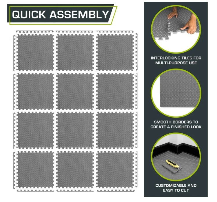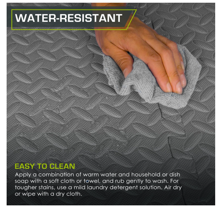 Exercise Mat, Foam Floor Tiles for Home Gym, Mat for Home Workout Equipment ABOUT THIS ITEM: Protective Exercise Flooring - Durable, non-skid textured squares and tiles that cover and protect your floor or even carpet while creating a comfortable workout room with exercise accessories or as a play mat for children. Easy Assembly – Lightweight interlocking foam tiles connect quickly and easily and can be disassembled just as simply for quick storage Versatile – The water-resistant, noise-reducing design is easy-to-clean, great for indoor purposes like in garages as a protector, gyms, a home fitness room, or even children’s play areas as a playmat. Covers 24 Sq Ft - Each Tile measures 24 in x 24 in x ½ in - thick from the highest point of the texture; Includes 6 tiles with end borders for a polished look. Care: Apply warm water and dish soap with a soft cloth or towel and air dry. High Quality Foam - High-density EVA foam mat provides excellent support and cushion; Contains NO toxic phthalates. Excellent alternative to rubber gym mats. SHIPPING: We offer FREE shipping on all orders! We ship within Three business days of payment, usually sooner. We use a selection of shipping services such as UPS, FedEx, USPS etc. We only ship to the lower 48 states, no APO/FPO addresses or PO Boxes allowed. Local pickups and combined shipping options are not provided at this time. PAYMENT: We accept payment by any of the following methods: PayPal Please pay as soon as possible after winning an auction, as that will allow us to post your item to you sooner! FEEDBACK: Customer satisfaction is very important to us. If you have any problem with your order, please contact us and we will do our best to make you satisfied. Thank you for shopping with us!