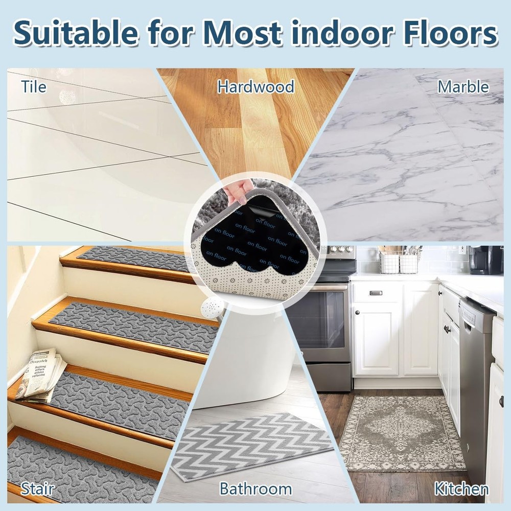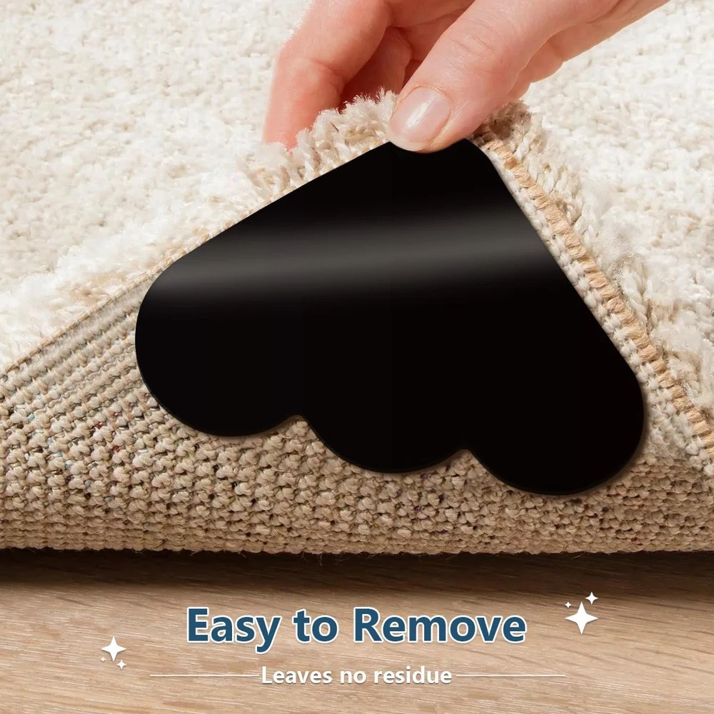 INNOVATIVE TRIANGLE DESIGN: These rug gripper for hardwood floors feature a triangle design with strong double-sided adhesive, increasing kitchen rug contact area and grip. The rug tape hardwood floor no damage ensures rugs fit securely. PREVENTS CURLING AND SLIDING: The rug corner grippers use anti-slip technology to keep rugs steady. The rug stickers for wood floor prevent sliding, ensuring carpets stay in place. These rug gripper for carpet also prevent bunching, keeping rugs neat. WASHABLE AND REUSABLE: The non slip rug grippers are made of PU adhesive, allowing repeated washing with water. Rug grip are easy to remove without residue. For lint-backed rugs, heat the rug corners to hold rug down before removal to soften glue. EASY TO USE: Install our carpet stickers for area rugs by peeling the adhesive backing, attaching it to the carpet, and pressing it firmly. Then secure the rug gripper for tile floors to the floor. Ensure clean surfaces before use for optimal performance. WIDELY APPLICABLE: Our carpet grippers for hardwood floors work on wood, tile, marble, and smooth carpets. The rug stoppers to prevent sliding are versatile for doormat,kitchen,bedroom rug. Cut these carpet gripper stickers to your desired size and shape. IMPORTANT NOTE: After cleaning, rug sticker must be fully dry before reuse. Rug stopper stickers are not recommended for carpeted floors, jute, or rubber-backed carpets.Because the anti-slip rug grips is sticky, it will pick up the pile SUITABLE KIT: This set of rug anchors includes 10 pieces, ideal for customizing your rug placement. Our corner rug grippers is only 0.04 in thick.The durable rug slipping grippers ensures carpets stay secure and enhances room aesthetics.
