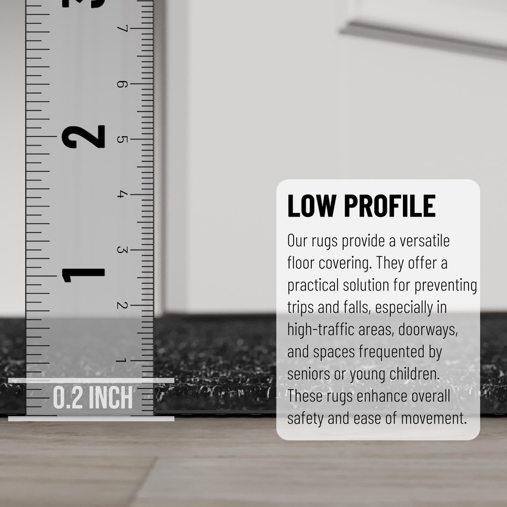 Our Scrape Rib Collection boasts a wide array of rugs, mats, and stair treads ranging from solid colors to unique prints and come in a wide range of shapes and sizes. Made in India, these Polyester rubber back rugs/stair treads will provide style throughout your home while also keeping your family safe with its non-slip rubber backing. Our sleek and functional ultra thin pile will help you place these rugs in areas where it would otherwise be difficult. These rugs are made from quality materials that are family and pet friendly and perfect for high traffic areas of your home such as the living room, bathroom, kitchen, and hallways! Here at , our mission is to deliver the highest quality rugs! [KEY ATTRIBUTES]: Size: 2' x 3' | Thickness: 0.2 in. | Color: Black [ULTRA THIN]: An ultra thin pile thickness of 0.2 inches offers ideal functionality that is perfect for busy areas, underneath furniture, and in entryways as it will not obstruct doorways [NONSLIP & STAIN RESISTANT]: Made in India with high quality Polyester material. The rubber backing minimizes slipping. To ensure comfort and additional grip please purchase double sided rug tape. [TRENDY STYLE]: This contemporary custom size rug features a solid design, adding color and enhancing the look of your home. [KID & PET FRIENDLY]: Safe for everyday high foot traffic areas and more resistance to life’s unpredictable messes from kid or pet activity.