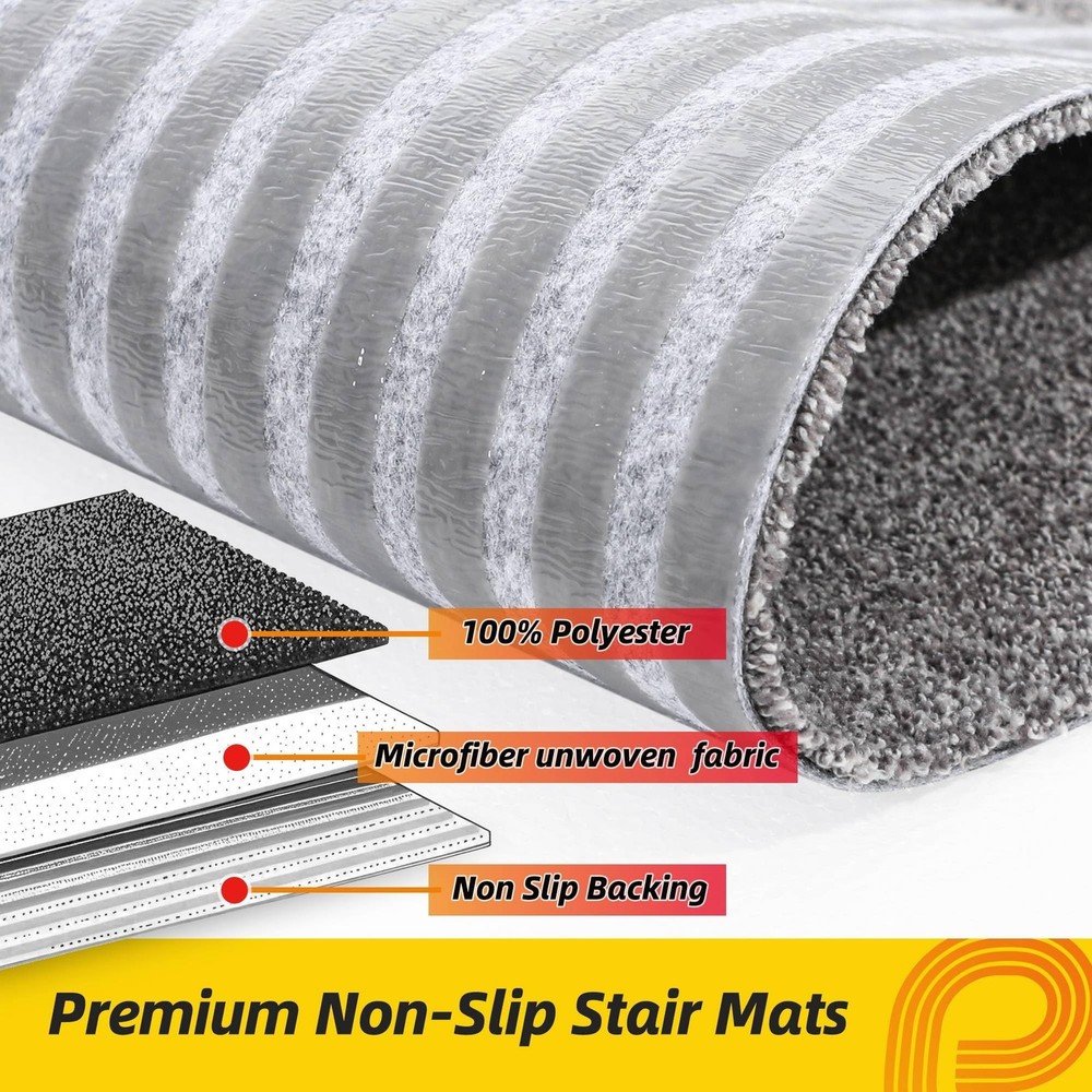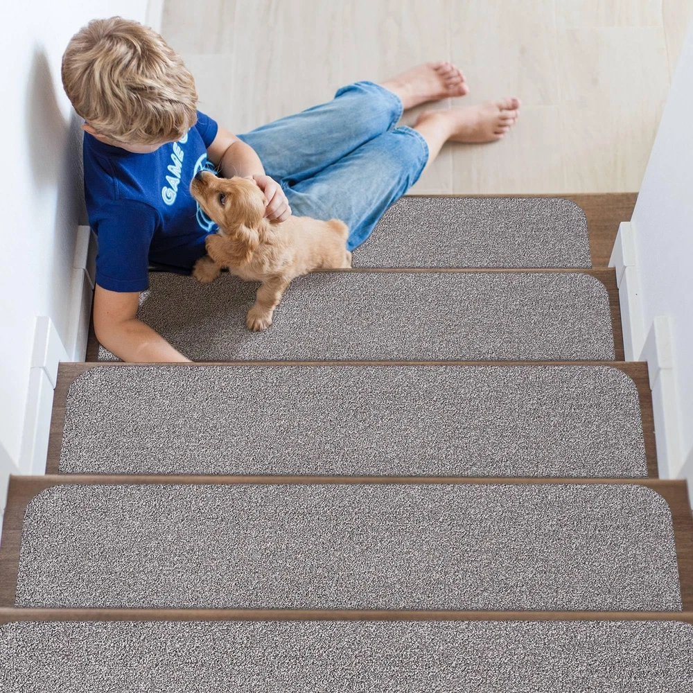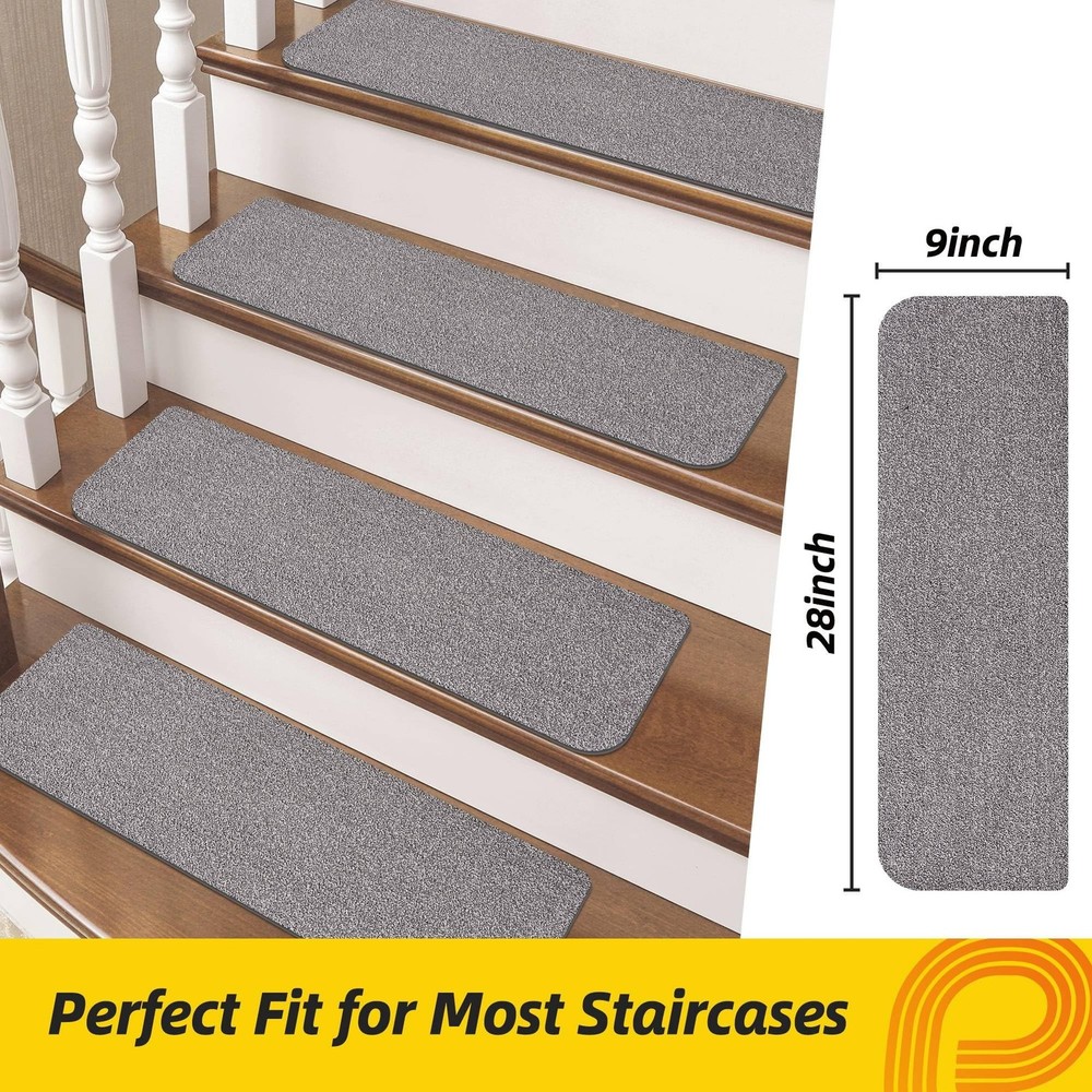 Non-Slip Stair Treads for Wooden Steps Indoor, 15 Pack 9" X 28" Stair Carpet Mats with TPE Backing for Kids Elders and Dogs, 0.3" Thick 100% Polyester Soft Stair Runner Rug, Light Grey Product Details Size: 28''x9'' Color: Light Grey Number of Items: 15 Brand: JSEI MPN: HLE-7779 UPC: Does not apply EAN: Does not apply Material: Polyester Brand: JSEI Item dimensions L x W x H: 28 x 9 x 0.3 inches Color: Light Grey Shape: Rectangular Item Thickness: 0.3 Inches Item Weight: 7 Pounds Number of Items: 15 Product Dimensions: 28 x 9 x 0.3 inches Item Weight: 7.03 pounds Manufacturer: JSEI Country of Origin: China Date First Available: January 21, 2025 Anti-slip Strips Enhance Safety: These multi-purpose stair rugs feature a TPE anti-slip backing and built-in anti-slip strips to provide superior grip on dry floors, preventing slipping and protecting the surface from wear and tear. Our premium wooden stair mats help your kids and dogs go up and down the stairs easily without worrying about slipping. Freely Cut to Fit: These non-slip stair tread carpets for wooden stairs can easily cut these stair treads to the size you want to match your corners or special step lengths. Our stair carpets are made with high-stability crease technology, so you don't have to worry about delamination.They stay firmly in place, even when wet. Genuine Material, Superior Quality: The surface of this non-slip stair tread mat is made of 100% polyester material, which is soft and wear-resistant. It is durable and not easy to pull and pile up. The appropriate thickness not only ensures that you can step on our stair tread carpet comfortably, but also helps keep your feet away from the cold stairs. Reduce the noise of going up and down the stairs, giving your family a quiet and relaxing environment. Easy to Remove and Clean: If you need to reposition or remove the stair treads, it will not leave any residue, protecting your original stairs from damage. When the stair carpet gets dirty, just vacuum the hair and stains. Or throw the stair carpet treads into the washing machine. After washing in water, it is recommended to dry in the shade, not in the dryer or in the sun. Works on Any Stairway: Our stair treads for wooden steps measure 9"x28", the stair mat adopts a clean solid color design suitable for any indoor stairs that are made of wood, laminate, marble, tiles, glass, etc.