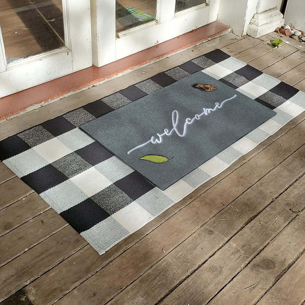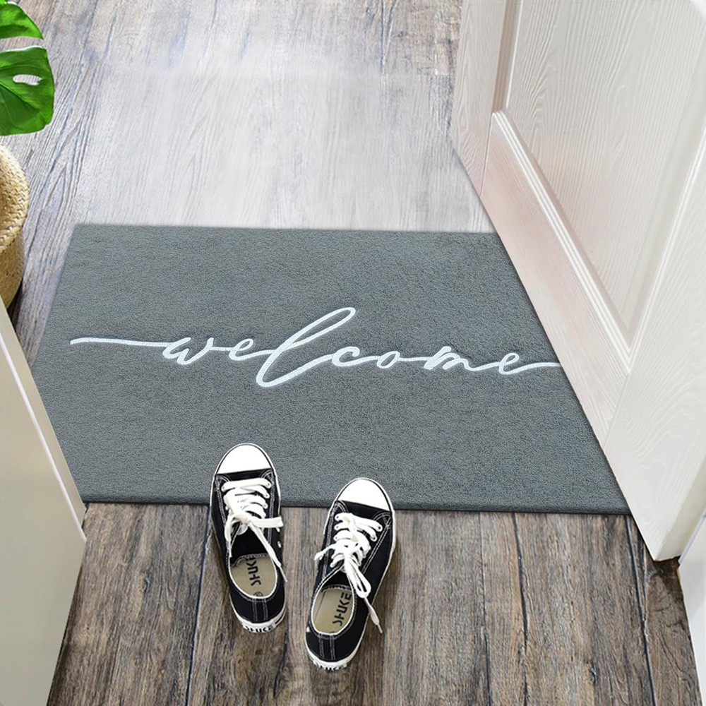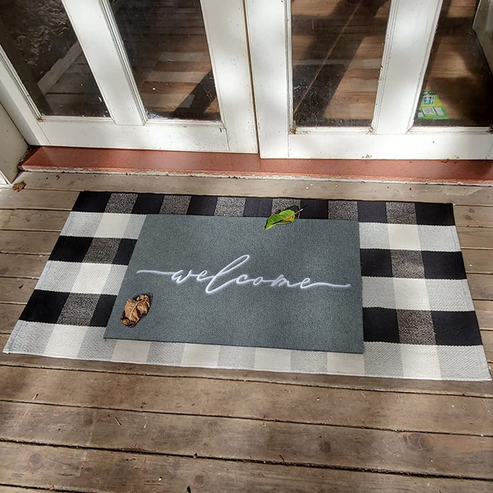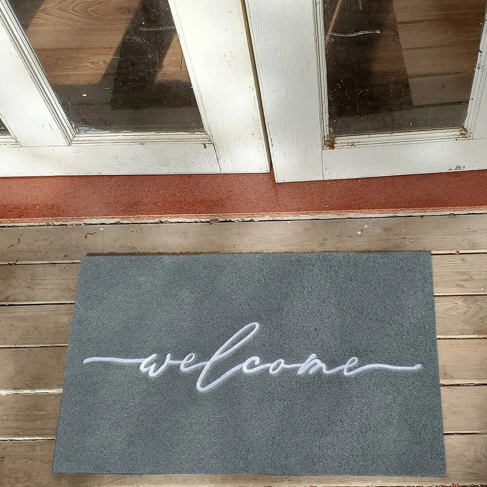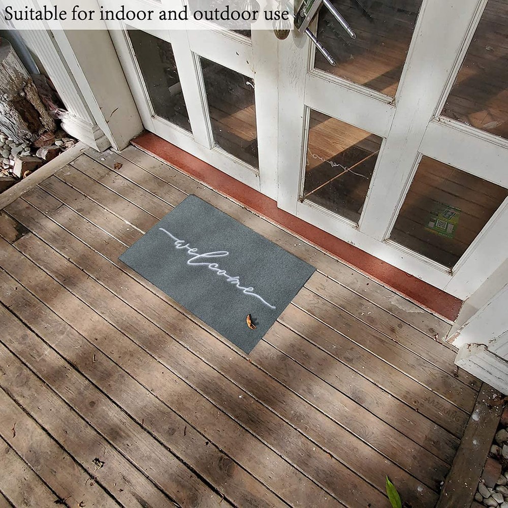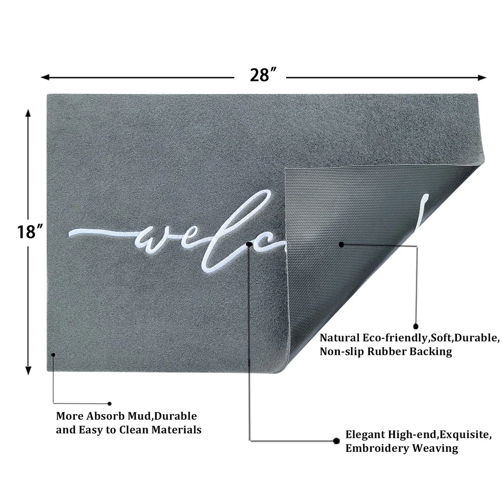 ElEGANT HIGH-END EMBROIDERIED WEAVING DOORMAT The letter of the mat is embroideried with exquisite workmanship. It is so unique and beautiful to decorate any deck or entryway. Your guest will love the elegant doormat when they come for a visit. SOFT RUBBER BACKING The mat has a soft rubber backing. So it is more non slip than ordinary other backing to ensure safety while wiping away the dirt from underneath your shoes. and it is also strong. ATTRACTIVE DESIGN The beautiful design of our entrance mat fits any interior exterior and compliments any decor. Our sophisticated embroideried craftsmanship add a tasteful decor to your front-door or high traffic areas. USE INDOORS OR OUTDOORS The rug is designed specifically for both indoor and outdoor use, making it ideal for any room or entryway in your home. Built to last, the material will withstand whatever weather or conditions come its way. NON SLIP BACKING: The backing of our doormat is constructed of soft rubber; It is designed to be more skid-resistant and strong,yet flexible for all-around versatility IDEAL SIZE FOR YOUR ENTRYWAY: door mat outdoors measures 18"x28" and is 1/4" thick providing a low-profile to prevent tripping and provide an easy door clearance KEEP FLOOR TIDY: Our front door mat is made of polypropylene fabric,which is more easy to absorbs dust,sand or grass from muddy boots and paws,helping you to keep unwanted debris off of your floor EASY TO CLEAN: Our outdoor mat is easy to clean,just need simply shake,sweep or wash the dust,mud and debris with your garden hose;Keep your entryway nice and clean with the addition of an exquisitely neat look of this stylish doormat VERSATILE DOORMAT: The entry mat isn't just for your front door or entry way, use on patios, in a garage, laundry room, office,apartment and any entry or exit with high traffic would benefit from these indoor or outdoor mats