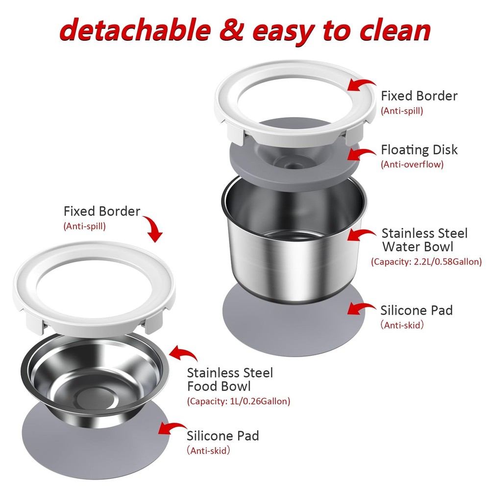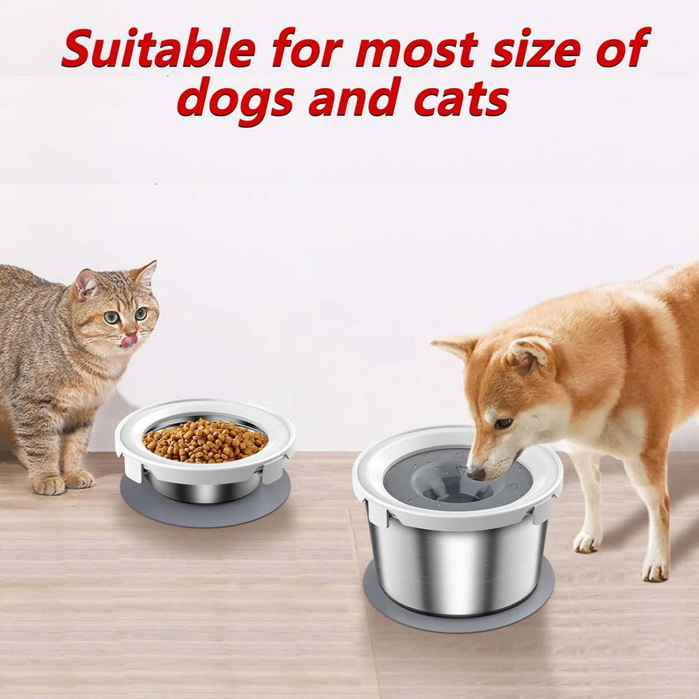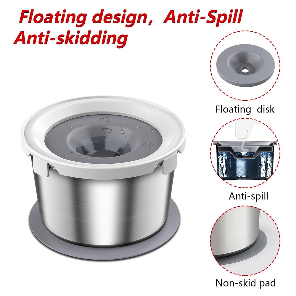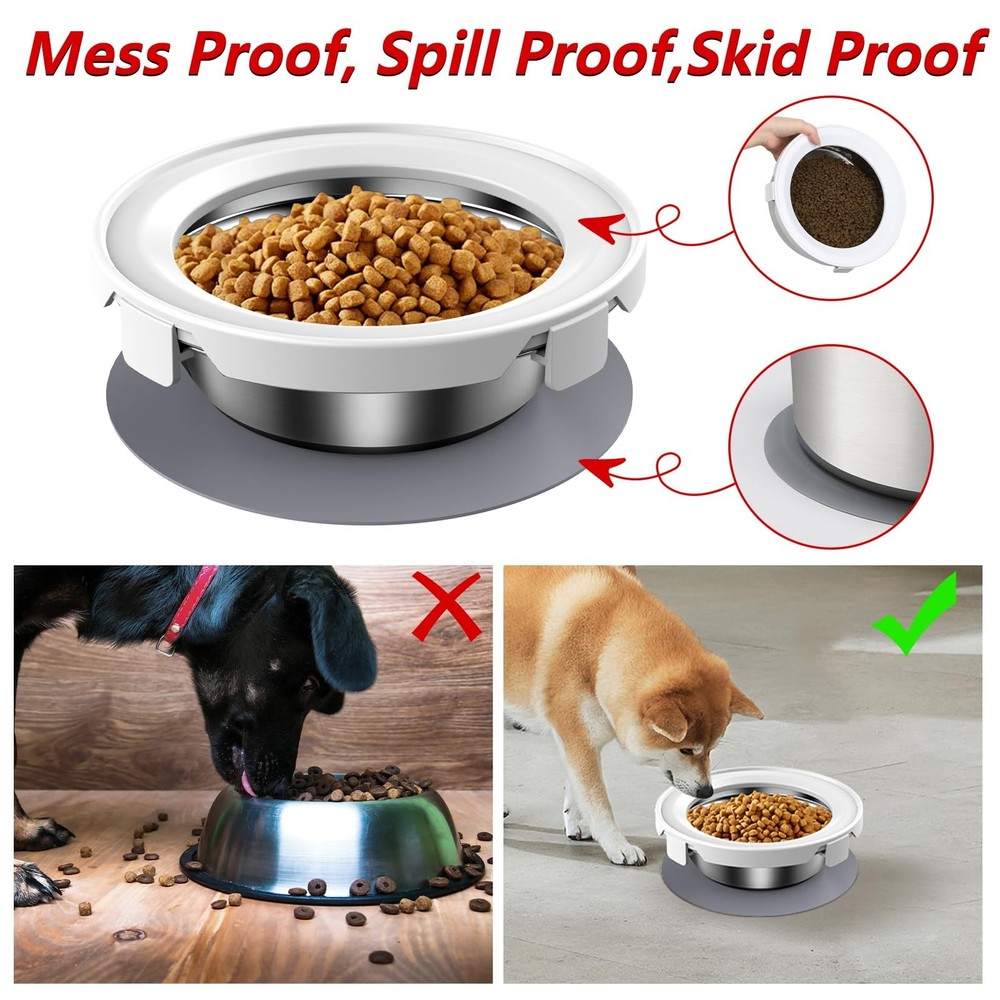 Steel Stainless Dog Water and Food Bowl Set, Stainless Steel Dog Bowl No Spill, Dog Food Water Bowl Slow Water Feeder Optimal Size: dog water and food bowl set contains 2 steel stainless bowls, which can hold all kinds of dog food and water, suitable for all sizes of dogs. The size of the dog water bowl:212*212*133mm(capacity:2.2L/8.8CUP), the size of the dog food bowl:212*212*70mm(capacity:1L/4CUP). Suitable for all size of dogs. It is also suitable for cats. No Spill Dog Bowl:dog water and food bowl set designed with the fixed border,floating disk to prevent water from overflowing and food from spilling, keeping your floor dry and tidy. Non-skidding Pet Bowl Set: no splash dog water and food bowl set comes with a silicone gel pad, prevent the bowls from slipiping. Slow Dog Water Feeder: There is a floating disk in the Mess proof dog water bowl, it can control the amount of water and help the dog drink water slowly, prevents your dogs from drinking too much. Easy to Clean: Simple and detachable design make the Dog food and water bowl set easy to clean and refill. You just wash the dog bowl by hand or in the dishwasher and wipe down the surface of the fixed border and floating disk. Guarantee: We provide 12-month after-sales service. If you received a defective or used product, please feel free to contact us to get a satisfied solution.