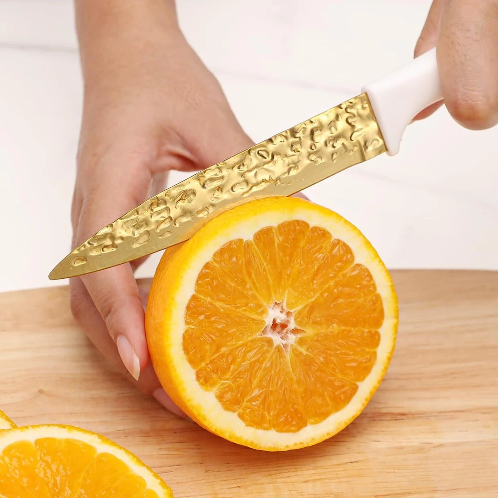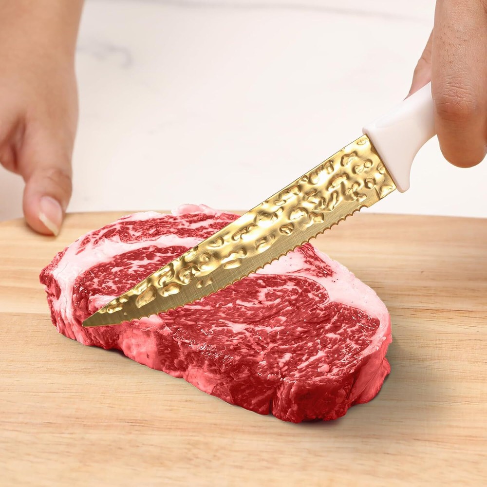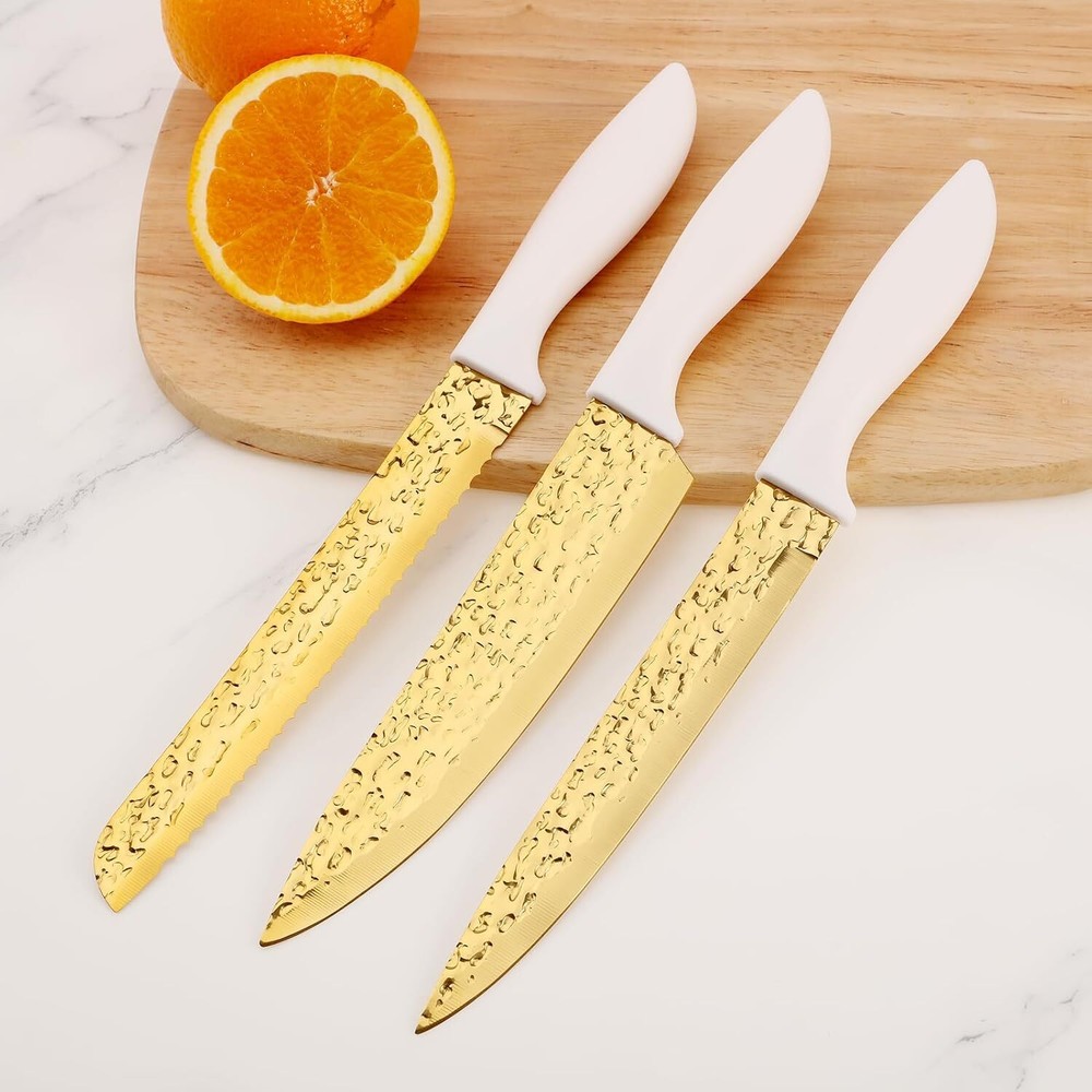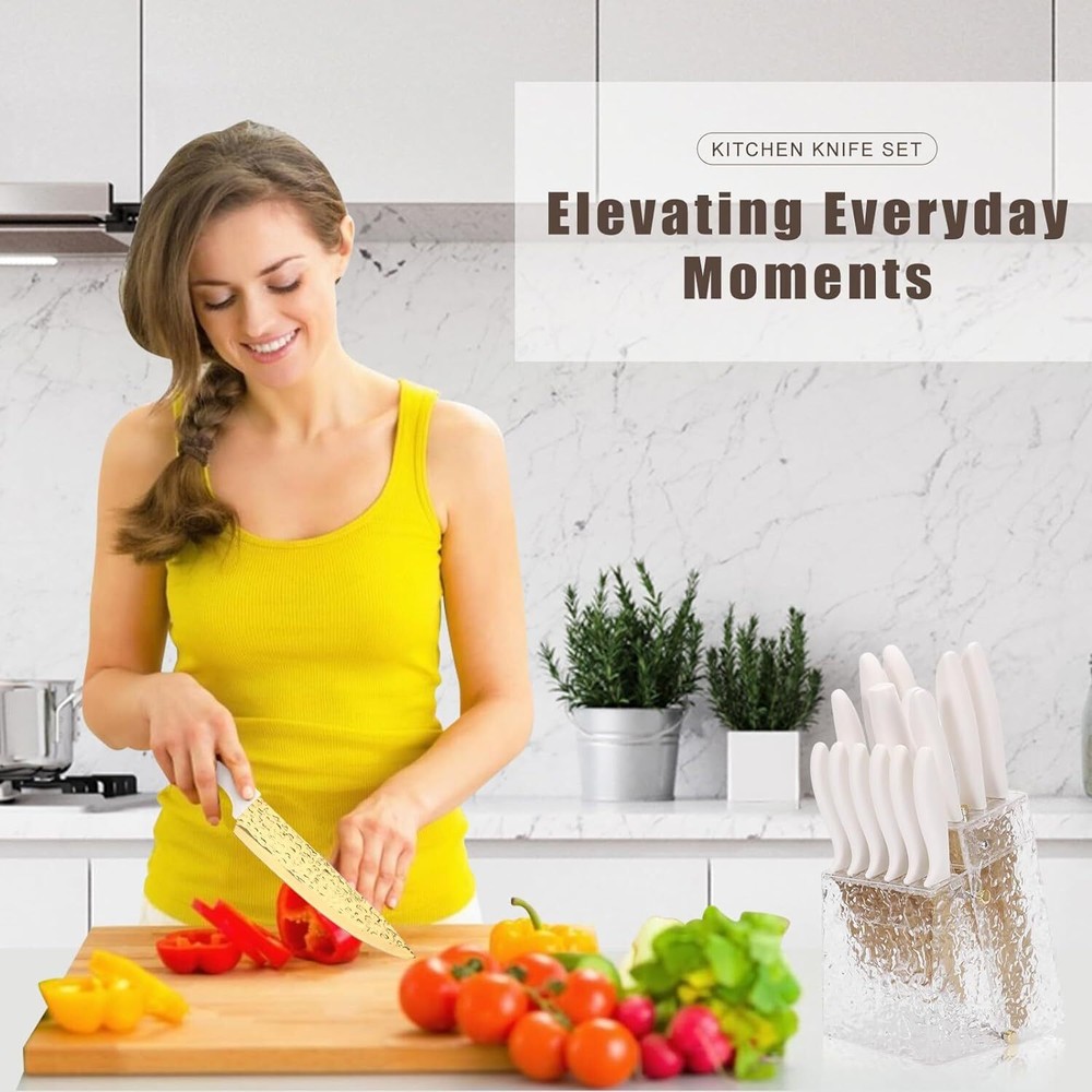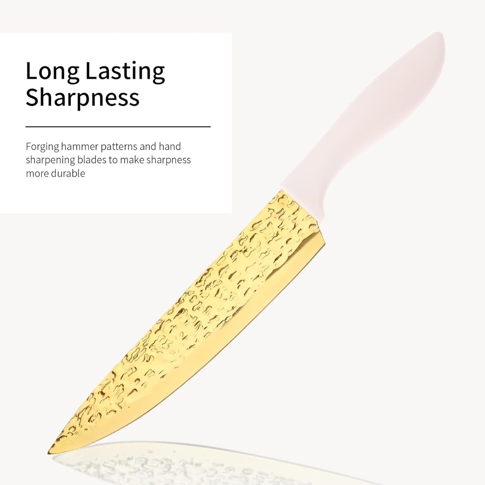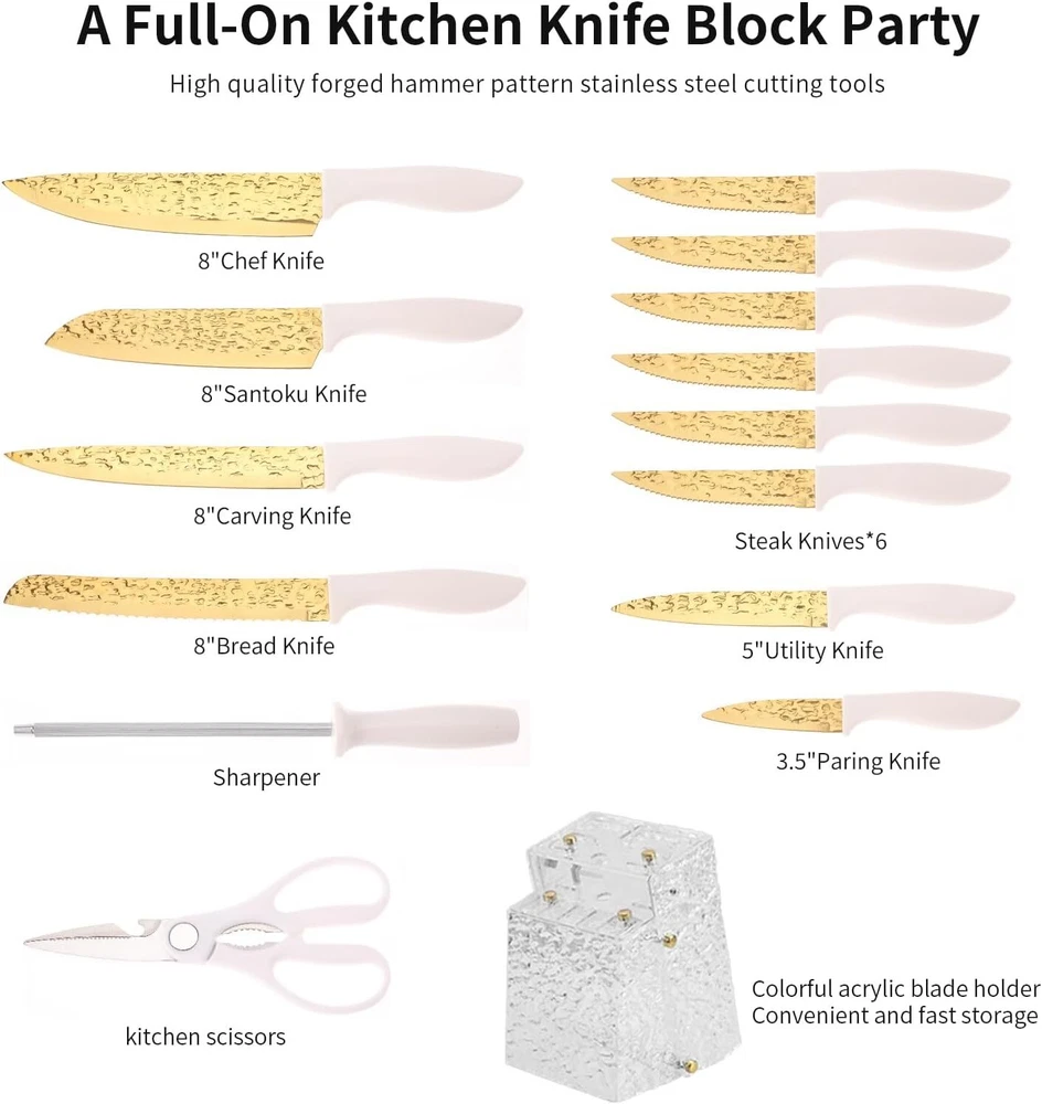 Product Description Kitchen Knife Set Non Stick Knives Set with Block Cutlery Knife Block Sets, Serrated Steak Knife, Scissors and Sharpener, 15Pcs Stainless Steel Chef Sharp Quality with Gold Blade for Home & Pro Use A Knife Set for Your Cutting Needs - - This 15 Pieces knife set includes 1x 8" Santoku Knife 1x 8" Chef Knife 1x 8" Carving Knife 1x 8" Bread Knife 1x 3.5" Paring Knife 1x 5" Utility Knife 1x Sharperer 1x Kitchen Shears 6x Steak Knives 1x Knife Block. All the cooking knives you need in one pack. High-Quality Material to Cutting Items - - This stainless steel knife is made of stainless steel, doesn’t contain any heavy metals and chemical elements. It will not react chemically with food, leave residue or emit an odor when used, allowing food to retain its original flavor and freshness for longer. Non Stick Forging & Hammering Texture and Thick Knife Blade Design - - Unique Forging & Hammering Texture Knife Blade makes this knife nonstick,and easy to maintain. Our tough stainless steel knives are not only sharp, also lightweight, comfortable to hold, and easy to grip. Easily cut anything (such as meat, bread, fruits, and vegetables) and let you enjoy the fun of cooking. Colors Optional & Ideal Gift - Our knife set will come with a stand that is beautiful and space-saving. Makes it easy for you to pick up the knife you need. Colors for you, Perfectly adapted to all kinds of kitchen styles. Also can be a great gift option for family and friends on birthdays, weddings, anniversaries, housewarming days, etc. Easy To Clean - - After using the kitchen knife set, simply rinse quickly and wipe with a kitchen towel, (Take care when cleaning to prevent cutting fingers). It’s an essential and practical kitchen cutting tools, by the way if became dull after using for many times you can sharp it with a sharping. About Us We are a reputable seller with many years of experience selling on eBay. Our goal is to provide high-quality products and excellent customer service. Shipping Items will be shipped within 1-3 business days when we received payment. (Orders are not processed on weekends & holidays) Tracking information will be sent once item is shipped. Delivery time depends on destination and other factors Item is shipped to ebay address. Leaving correct address can minimize delay. For international shipping and shipping to Guam, Hawaii and Alaska, Please contact us before placing the order. International buyers please note: Import duties, taxes and charges are not included in the item price or shipping charges. These charges are buyer’s responsibility. We will try our best to reduce the risk of the custom duties. Local pick-up is unavailable at the moment. Contact Us We reply any email messages within 1 business / working days(off-duty at weekend). If you do not get a response from us, then please check your junk or spam mailbox. Our Business hours: Mon-Fri 9:00-18:00, UTC/GMT +8 hours. Please contact us either by clicking "contact seller" in the "purchase history" section or simply click "ask a question" at the bottom of this page. If you are unsatisfied with our item or service, please contact us before leaving any feedback. We are committed to resolve all issues in a friendly and satisfactory manner.
