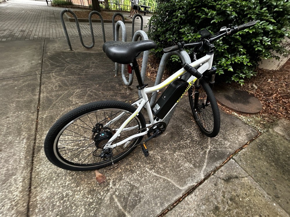 Heybike Bike for Adults, 750W Peak Brushless Motor, up to 50Miles, 22mph Max Speed Electric Mountain Bike, 480WH Removable Battery Ebike, 27.5'' Tires, 7-Speed and Front Suspension. Brakes don’t work and it is a little bit rusted. Battery is not included. Would recommend only for parts.