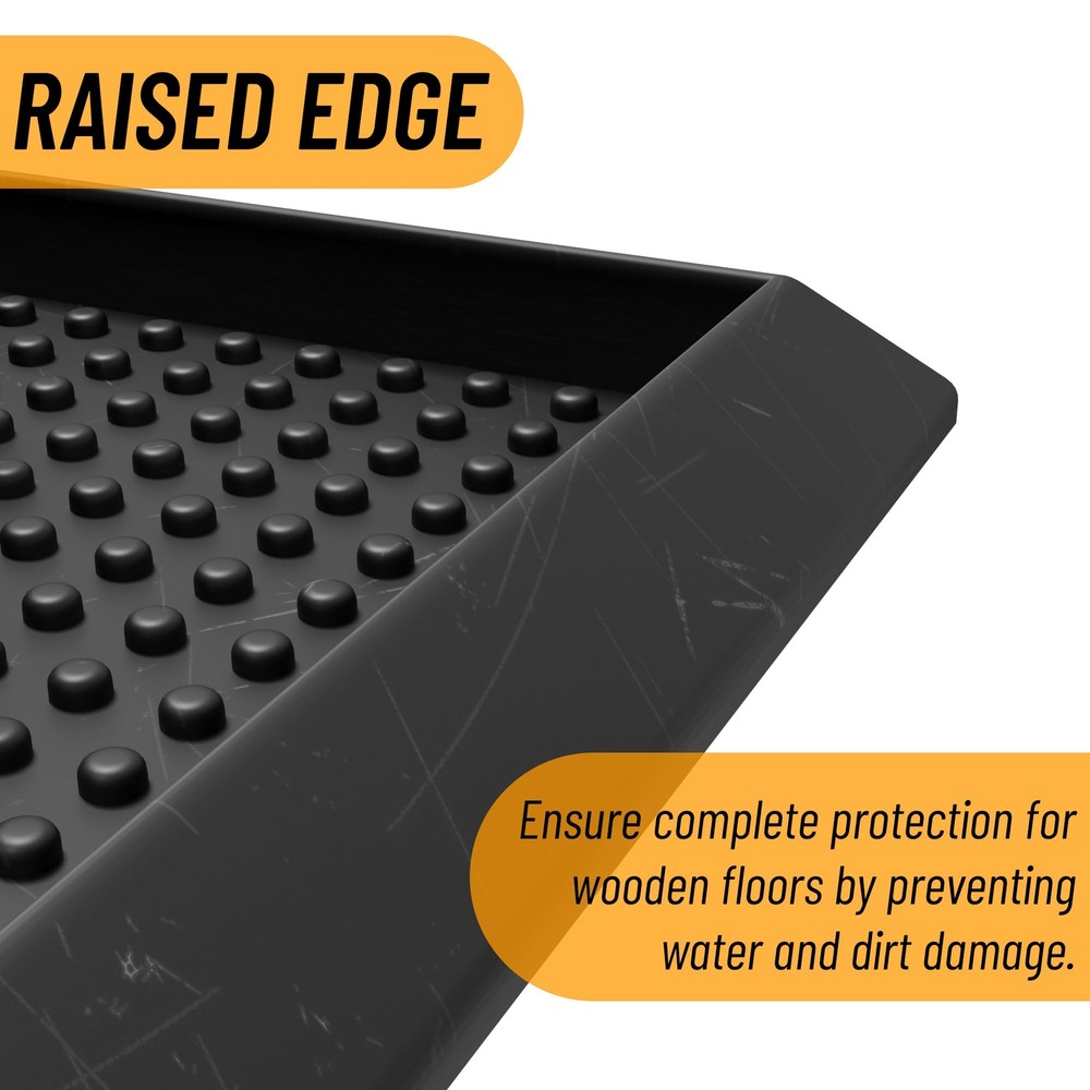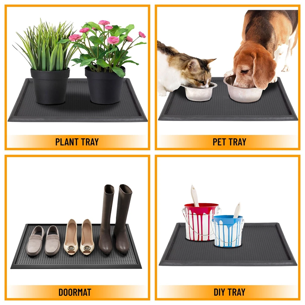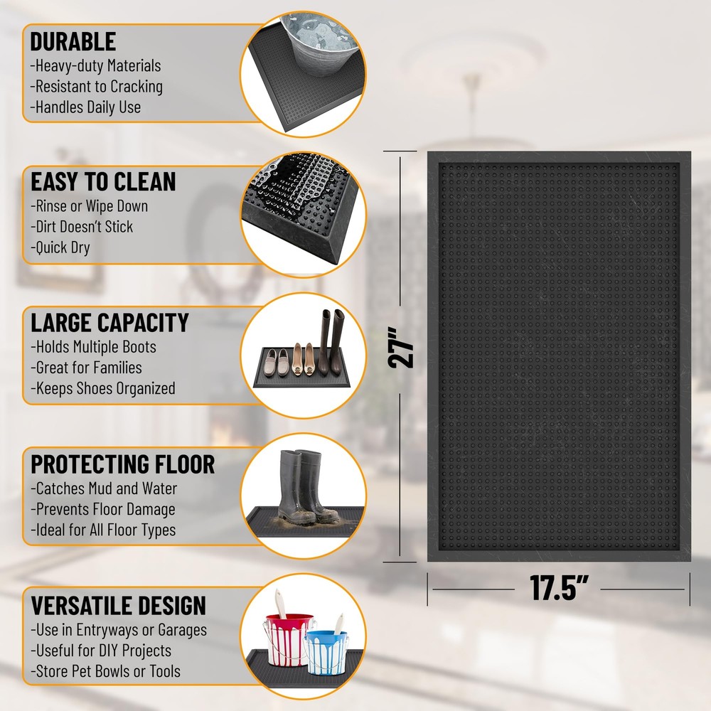 Our heavy duty rubber boot trays boast a wide array of beautiful patterns and shapes. These indoor and outdoor trays are designed brilliantly to let minimum dirt and moisture inside your house and to keep your home neat and clean for easy maintenance through all four seasons. Our multipurpose anti-skid boot trays are made to contain messes from dirty shoes, pet bowls, and litter boxes to potted plants and paint supplies. The quality-constructed tray makes our products so durable that it is guaranteed to offer years of service withstanding everyday foot traffic while the fade and wear resistance provides an easy upkeep, fast drying and carefree maintenance. Here at , our mission is to deliver the highest quality stain resistant boot trays possible at the most competitive rates! [KEY ATTRIBUTES]: Size: 17.5" x 27" | Thickness: 1.2 in. | Color: Black [HIGH PROFILE]: A thickness of 1.2 inches offers ideal functionality makes it easier for pets to use. While not being big and bulky making it easier to behind doors. [ALL WEATHER NONSLIP PVC]: This boot tray is manufactured with durable, high quality and all-weather material. It minimizes slipping and all-weather protection makes the boot trays long lasting and can be outside all year long with its all-season viability and waterproof material. [TRENDY STYLE]: This heavy duty boot tray features a grid pattern that will keep your home clean and make your pets feel comfortable and happy. Enjoy of its stain resistant, water resistant, wear resistant, and waterproof design. [RECOMMENDED USE]: This multipurpose tray can be utilized as a doormat, boot tray, mud mat for shoes, potty training pad for your puppy, litter catcher under your litter box, pet feeding mat, and scratcher mat for your kitten. Perfect for indoor or outdoor areas such as the entryway, doorway, patio, garage, mud room, deck, basement, kitchen, sunroom, or porch.