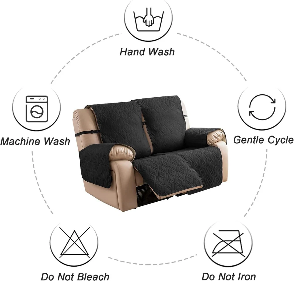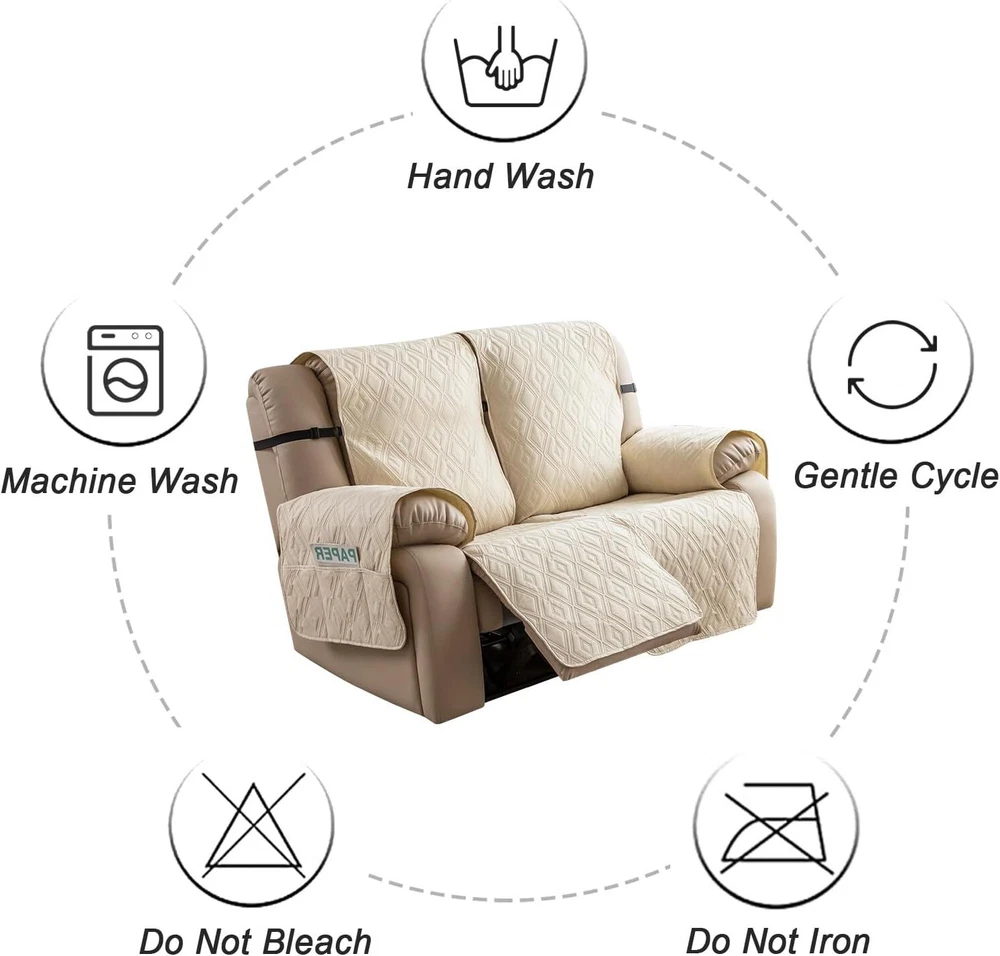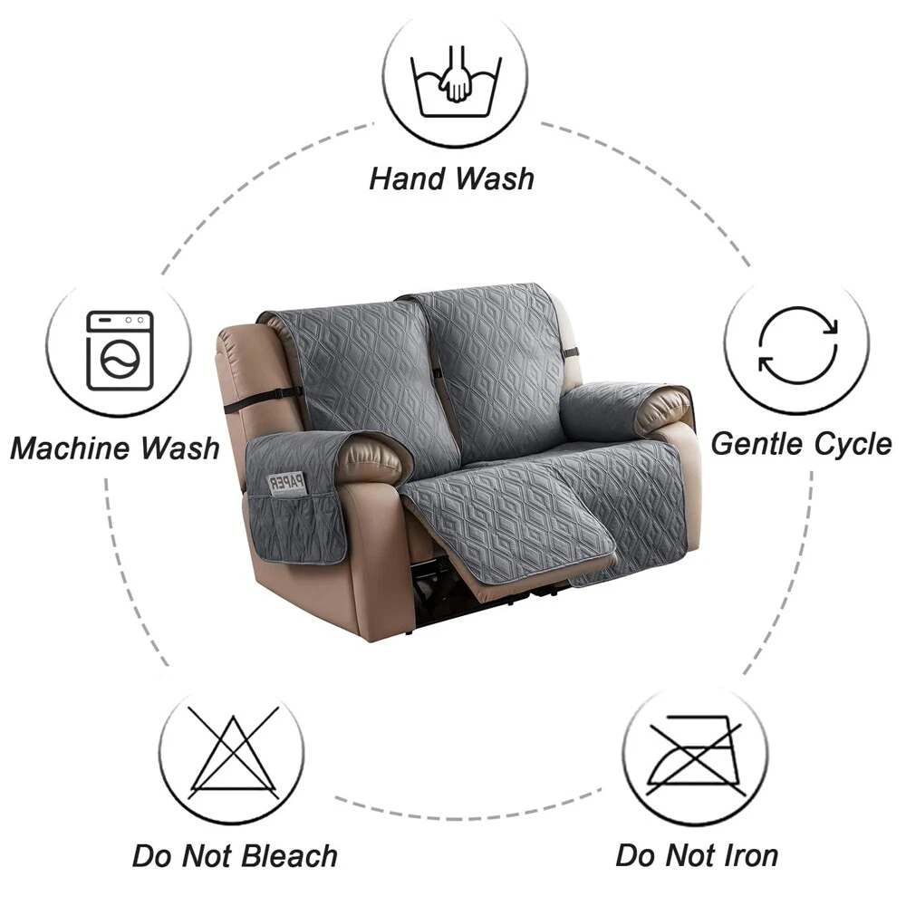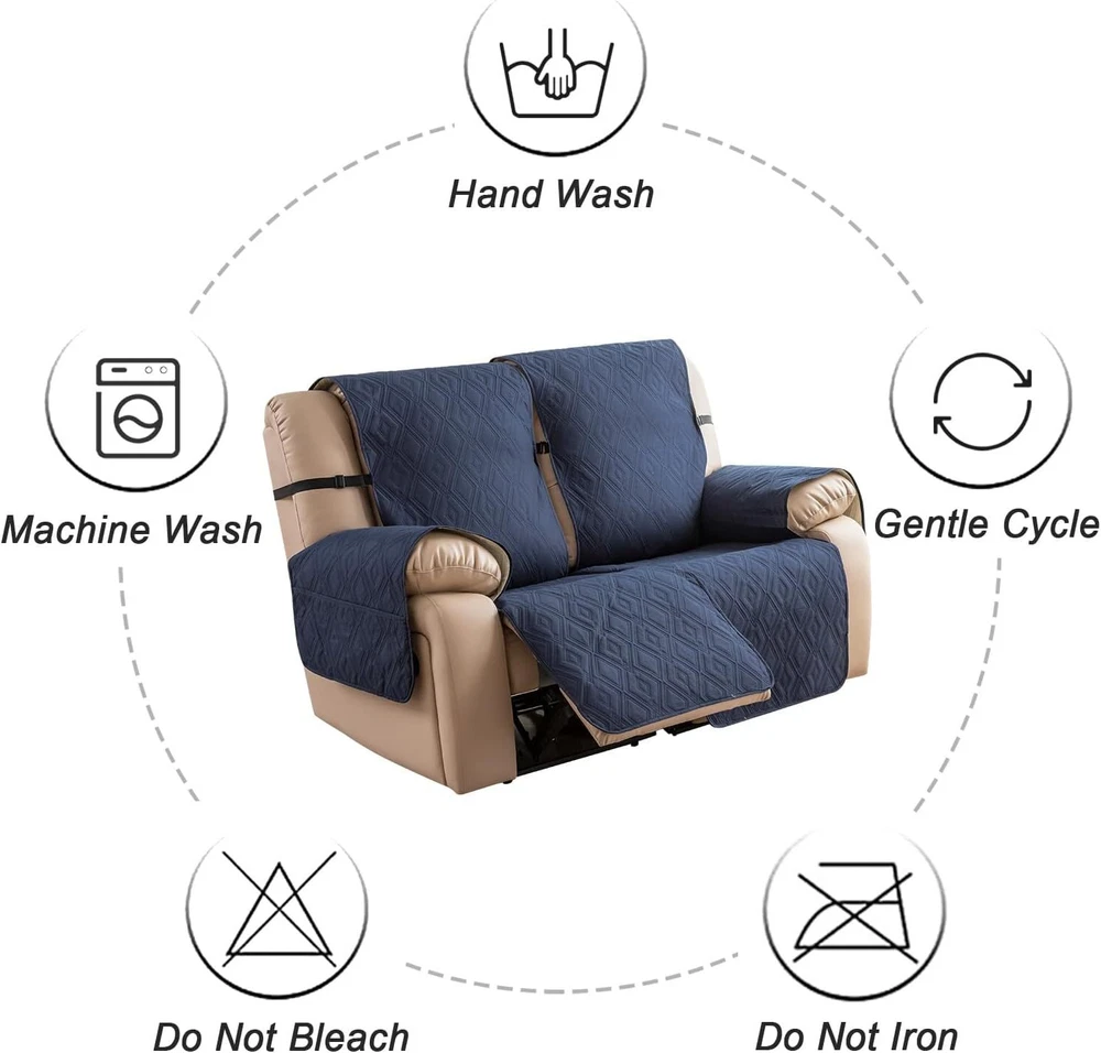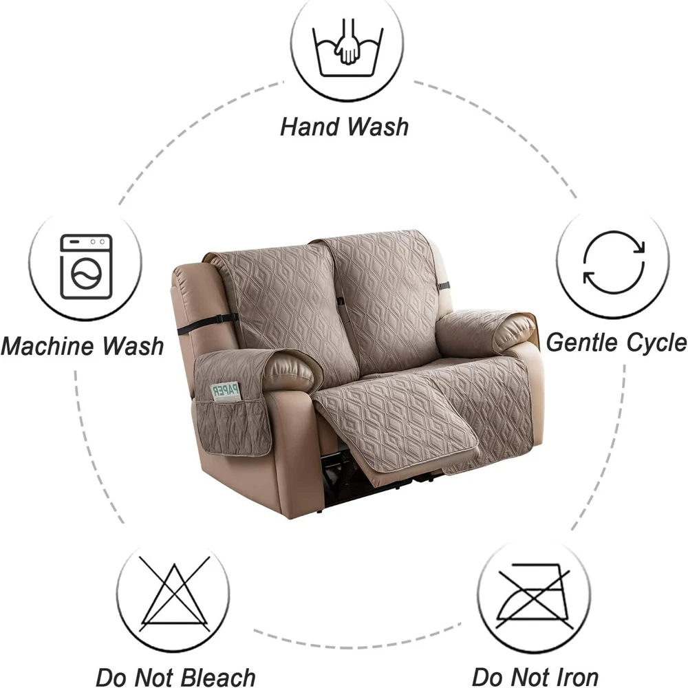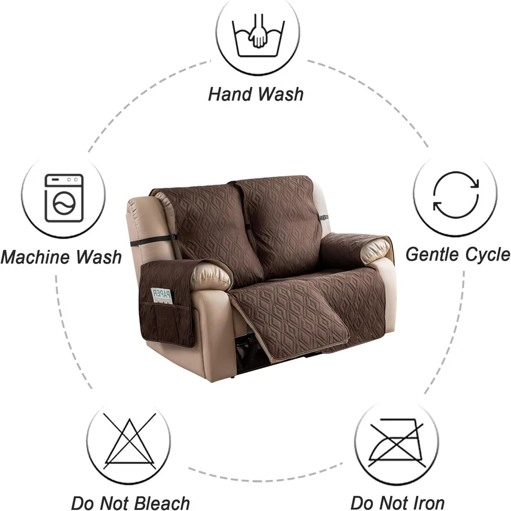 Stay in Place Anti-Slip Stay-in-Place Design: The reclining couch covers backrest and seat are designed separately, making it more fitting for your couch, staying in place. Each piece of recliner couch cover has a circular silicone rubber anti-slip design on the back, and is equipped with elastic bands and anti-slip buckles for double-layer reinforcement, not easy to slide. Water-Resistant & Durable: The durable sofa covers for 2 cushion couch consists of 4 layers of quilted fabric, thick microfiber, and thick poly foam filling for extra comfort and softness. 100% waterproof, protects your recliner furniture from everyday wears and tears, leaks and stains. Dimension Guide: The recliner couch protectors loveseat fits a seat width of 48 in. (2 pieces design, 23" per seat size). Recliner sofa covers 3 seat fits a seat width of 72 in. (3 pieces design, 23" per seat size). Please measure before purchasing, see measuring guide in photo. Furniture Protector: Sofa covers reclining are perfect for protecting your furniture from kids, scratches and fur from pets, dogs or accidental leaks. The unique diamond pattern design of recliner couch covers 2 seat gives your old furniture brand new look. Installation & Care: Couch covers for reclining couches installation is effortless. Please refer to our 2 seat recliner covers detail page for the installation guide to ensure a perfect fit. Machine washable, gentle wash, do not bleach and iron.