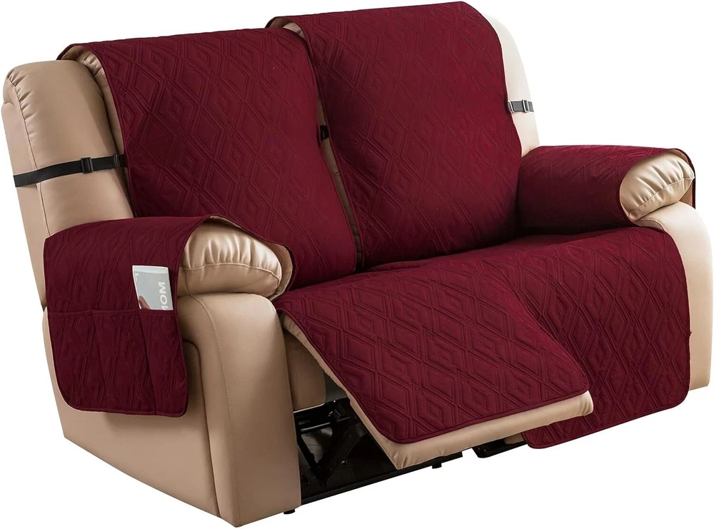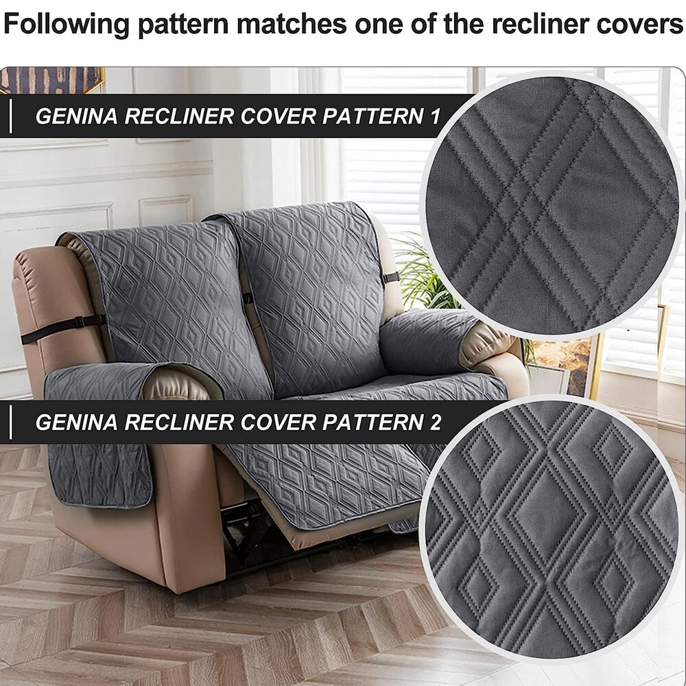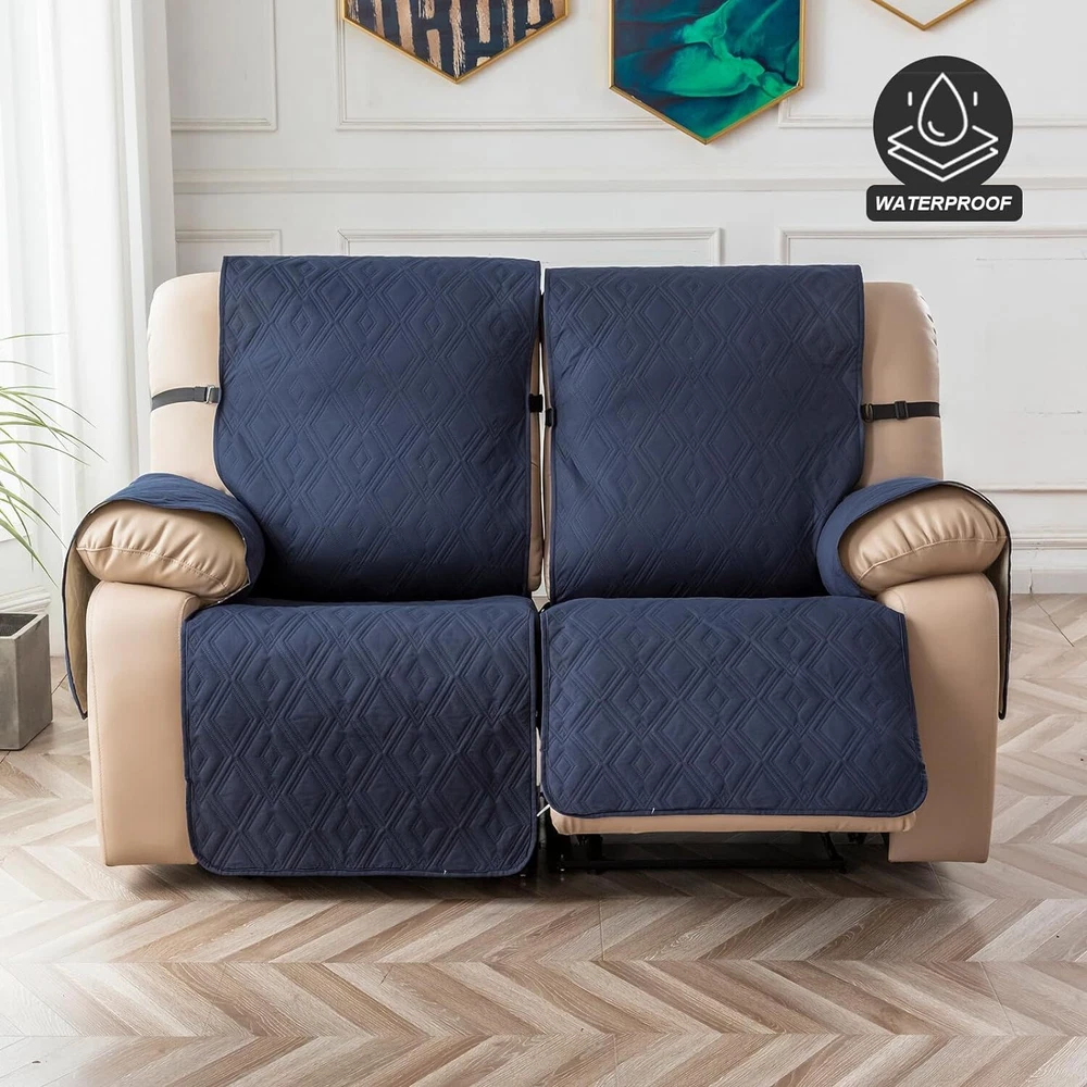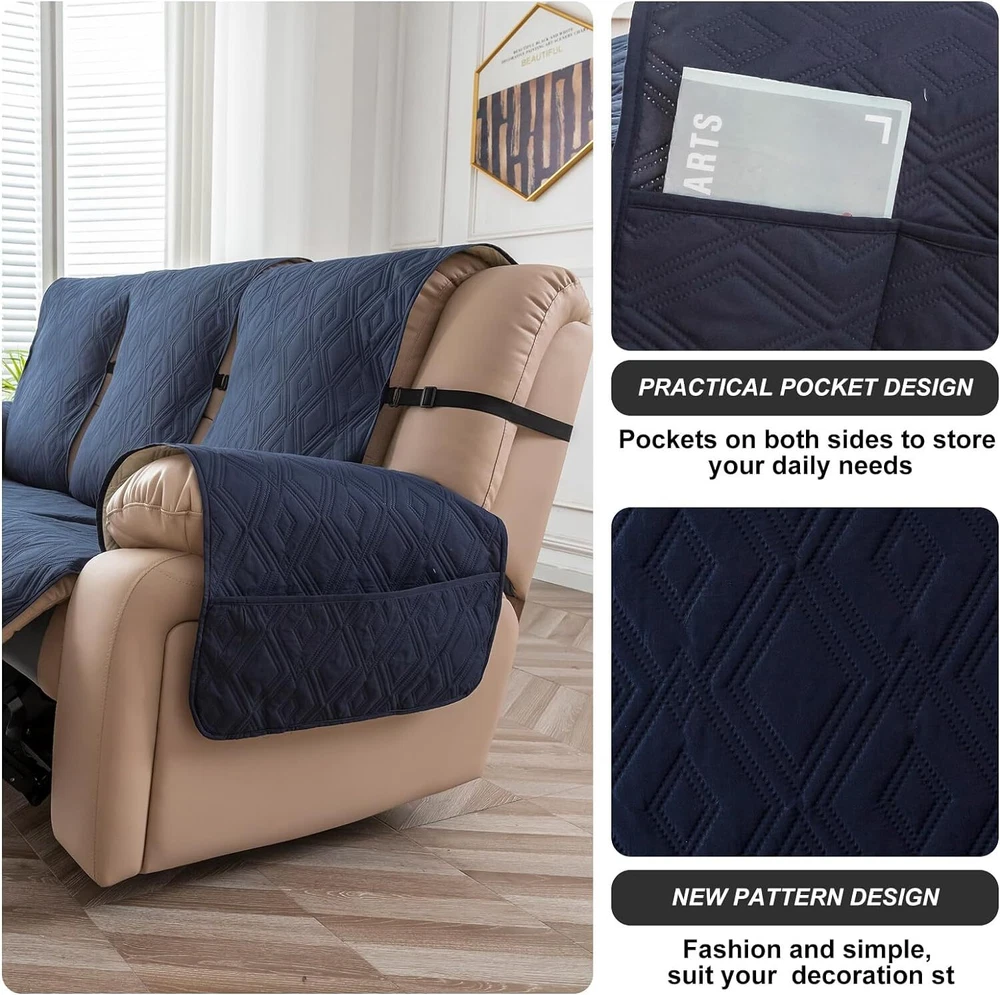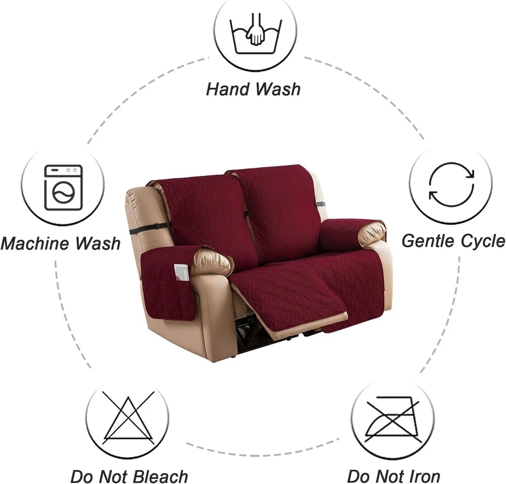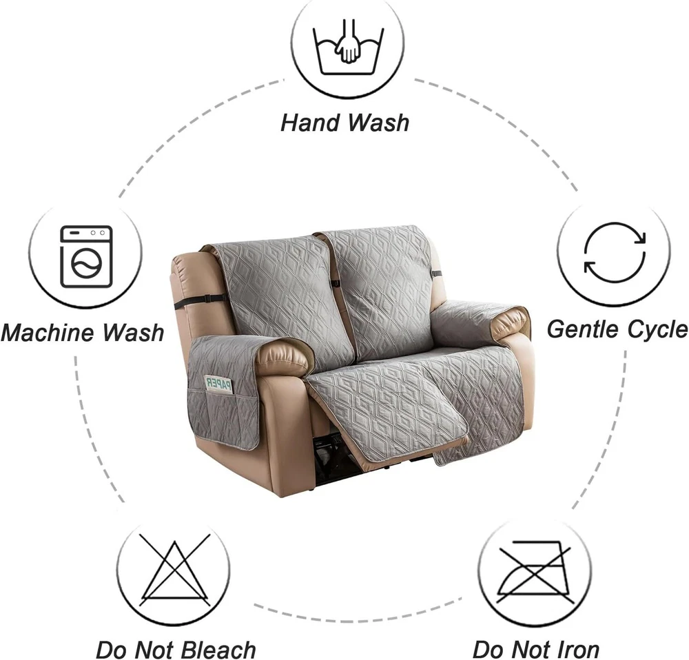 Stay in Place Anti-Slip Stay-in-Place Design: The reclining couch covers backrest and seat are designed separately, making it more fitting for your couch, staying in place. Each piece of recliner couch cover has a circular silicone rubber anti-slip design on the back, and is equipped with elastic bands and anti-slip buckles for double-layer reinforcement, not easy to slide. Water-Resistant & Durable: The durable sofa covers for 2 cushion couch consists of 4 layers of quilted fabric, thick microfiber, and thick poly foam filling for extra comfort and softness. 100% waterproof, protects your recliner furniture from everyday wears and tears, leaks and stains. Dimension Guide: The recliner couch protectors loveseat fits a seat width of 48 in. (2 pieces design, 23" per seat size). Recliner sofa covers 3 seat fits a seat width of 72 in. (3 pieces design, 23" per seat size). Please measure before purchasing, see measuring guide in photo. Furniture Protector: Sofa covers reclining are perfect for protecting your furniture from kids, scratches and fur from pets, dogs or accidental leaks. The unique diamond pattern design of recliner couch covers 2 seat gives your old furniture brand new look. Installation & Care: Couch covers for reclining couches installation is effortless. Please refer to our 2 seat recliner covers detail page for the installation guide to ensure a perfect fit. Machine washable, gentle wash, do not bleach and iron.