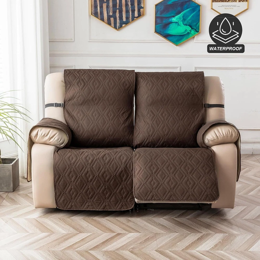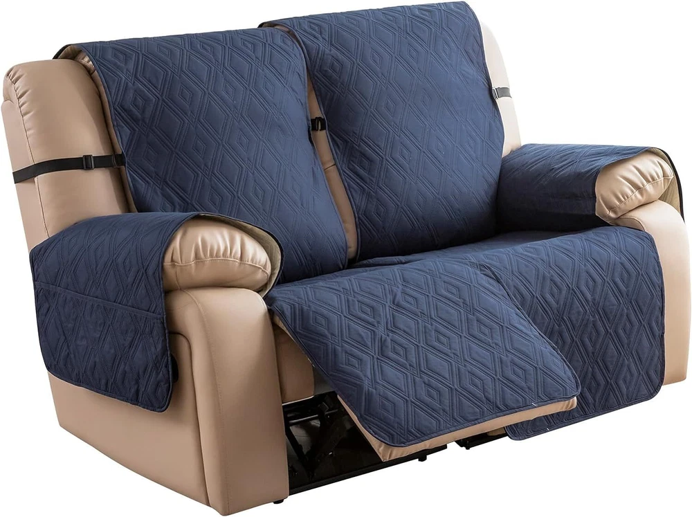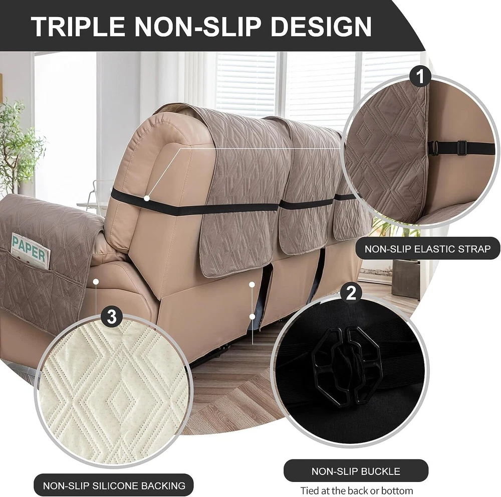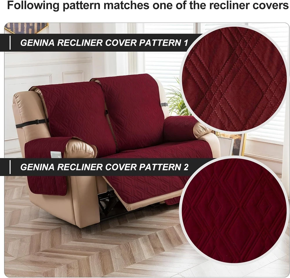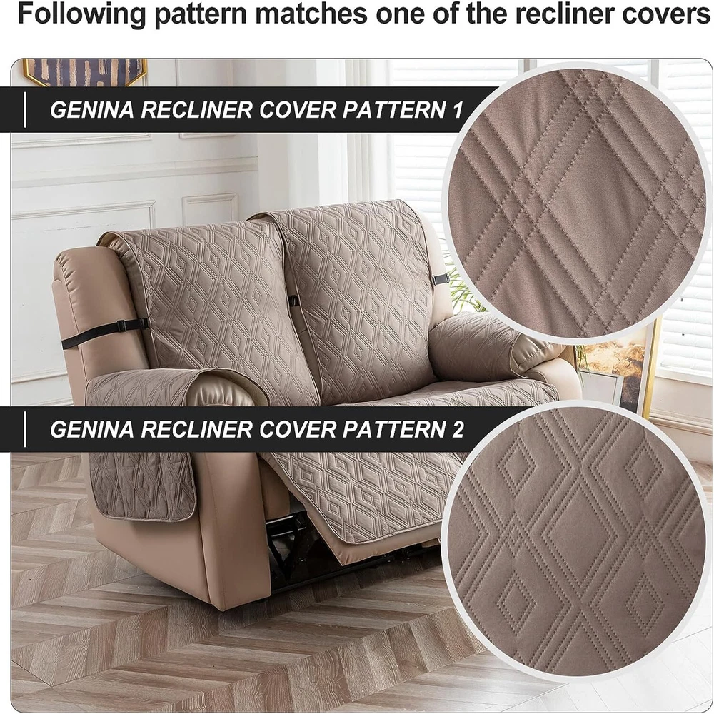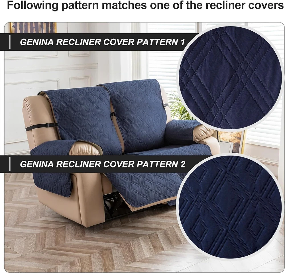 Stay in Place Anti-Slip Stay-in-Place Design: The reclining couch covers backrest and seat are designed separately, making it more fitting for your couch, staying in place. Each piece of recliner couch cover has a circular silicone rubber anti-slip design on the back, and is equipped with elastic bands and anti-slip buckles for double-layer reinforcement, not easy to slide. Water-Resistant & Durable: The durable sofa covers for 2 cushion couch consists of 4 layers of quilted fabric, thick microfiber, and thick poly foam filling for extra comfort and softness. 100% waterproof, protects your recliner furniture from everyday wears and tears, leaks and stains. Dimension Guide: The recliner couch protectors loveseat fits a seat width of 48 in. (2 pieces design, 23" per seat size). Recliner sofa covers 3 seat fits a seat width of 72 in. (3 pieces design, 23" per seat size). Please measure before purchasing, see measuring guide in photo. Furniture Protector: Sofa covers reclining are perfect for protecting your furniture from kids, scratches and fur from pets, dogs or accidental leaks. The unique diamond pattern design of recliner couch covers 2 seat gives your old furniture brand new look. Installation & Care: Couch covers for reclining couches installation is effortless. Please refer to our 2 seat recliner covers detail page for the installation guide to ensure a perfect fit. Machine washable, gentle wash, do not bleach and iron.